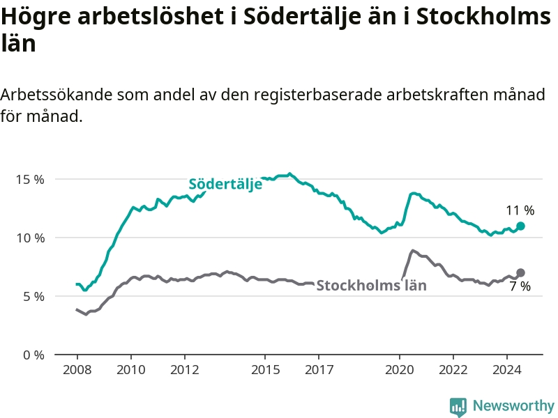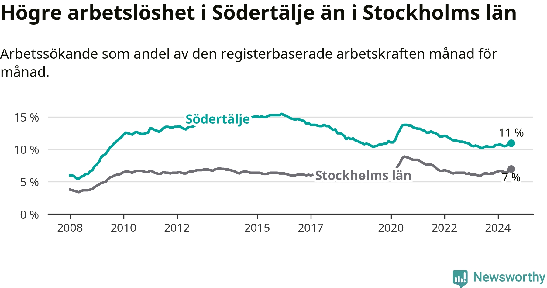 Under juli månad rapporterade Södertälje kommun en total arbetslöshet på 11,0 procent. Det är en ökning jämfört med samma tidpunkt i fjol (+0,6 procentenheter). Även i Stockholms län stiger arbetslösheten .