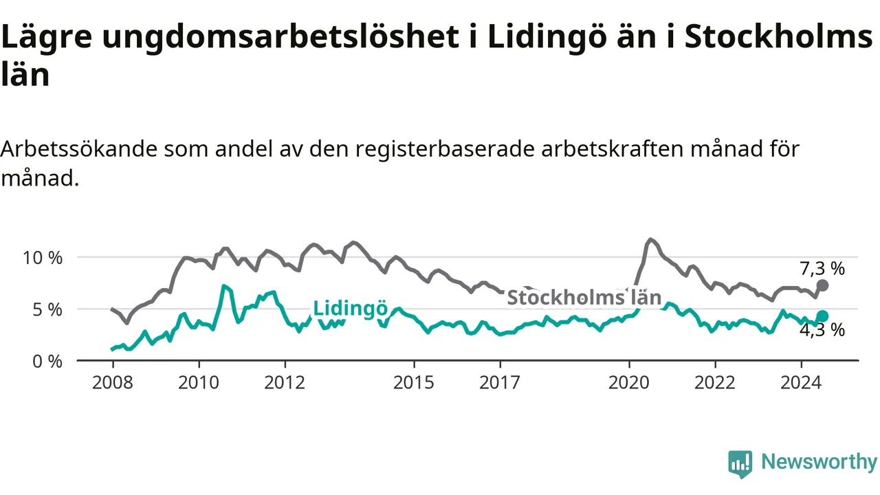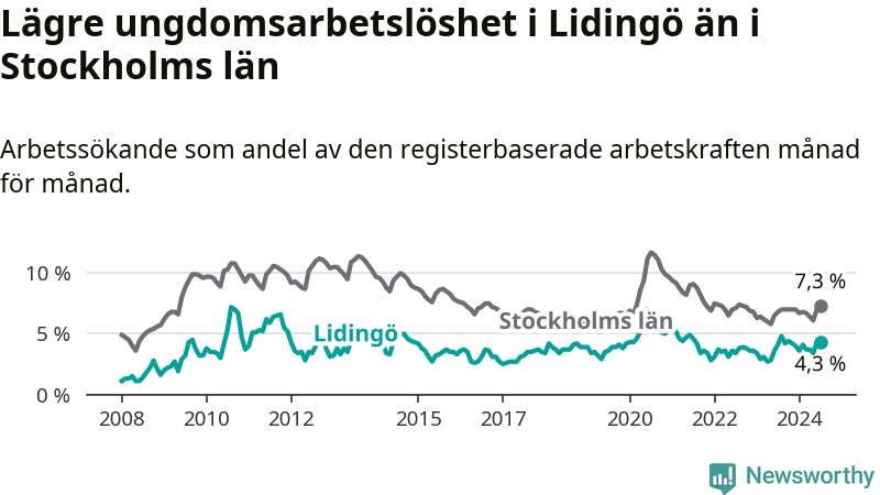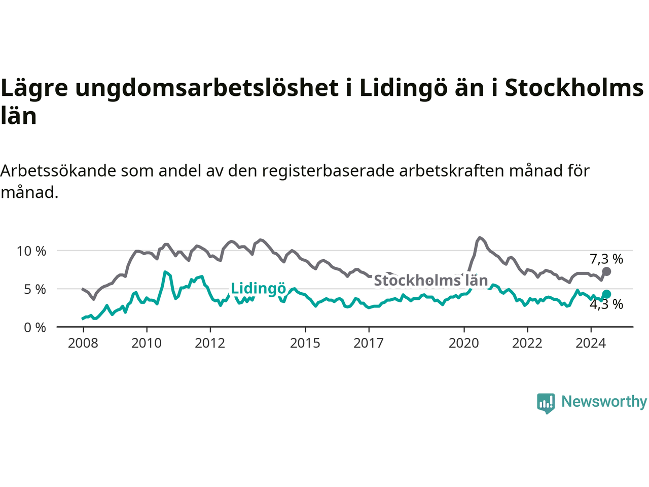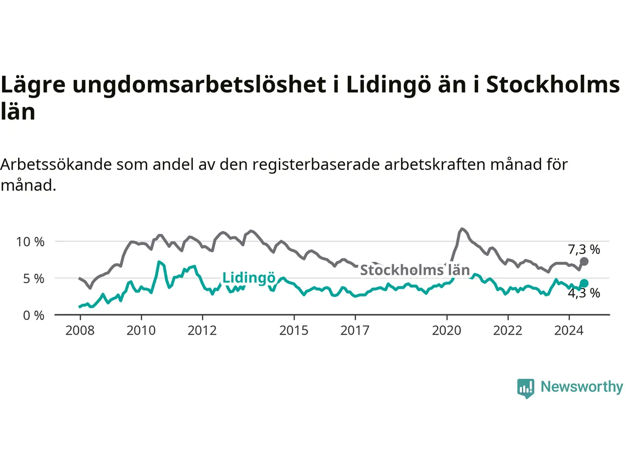 Precis som den totala arbetslösheten ligger ungdomsarbetslösheten på Lidingö lägre än i Stockholms län som helhet. Skillnaden mellan kommunen och länet är 3,0 procentenheter.
