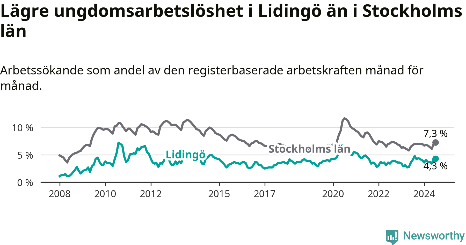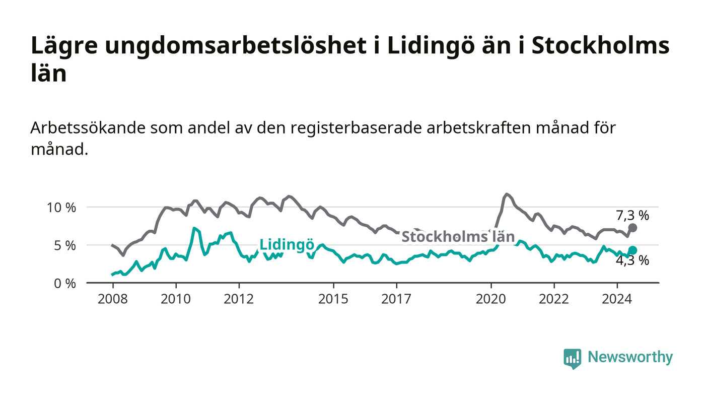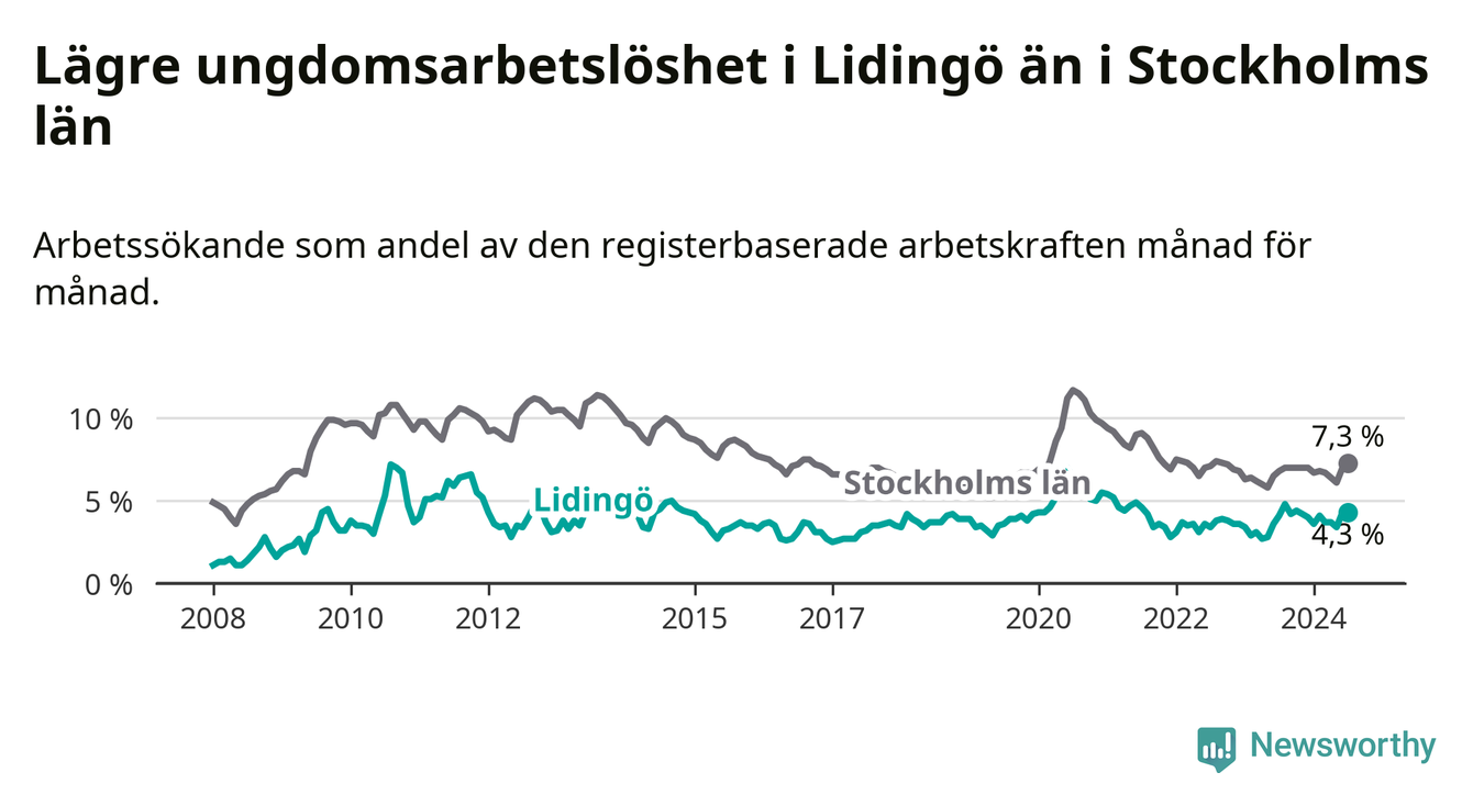 Precis som den totala arbetslösheten ligger ungdomsarbetslösheten på Lidingö lägre än i Stockholms län som helhet. Skillnaden mellan kommunen och länet är 3,0 procentenheter.