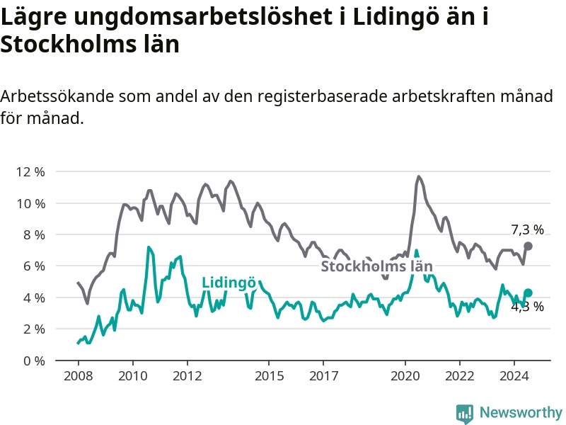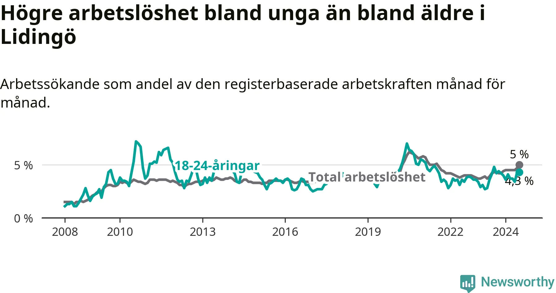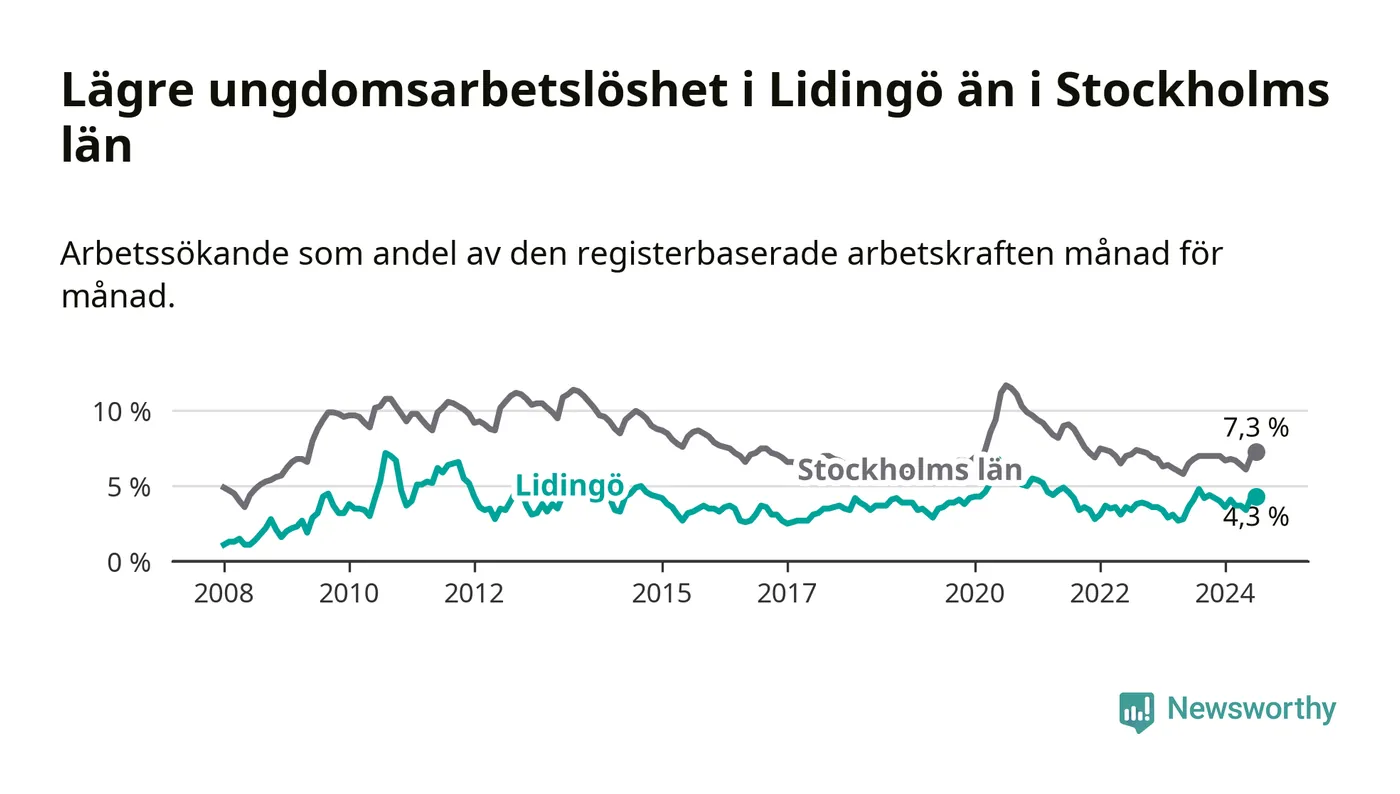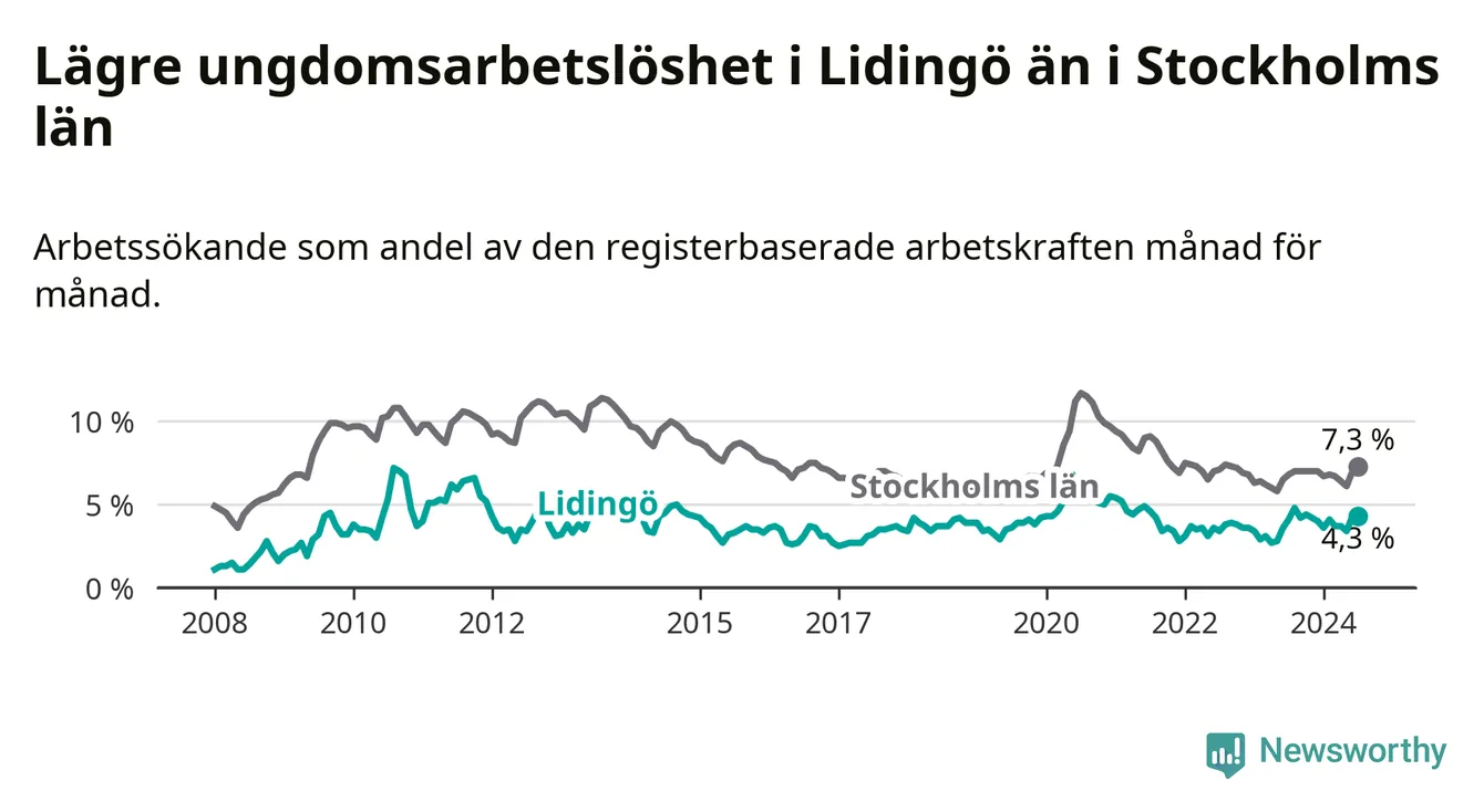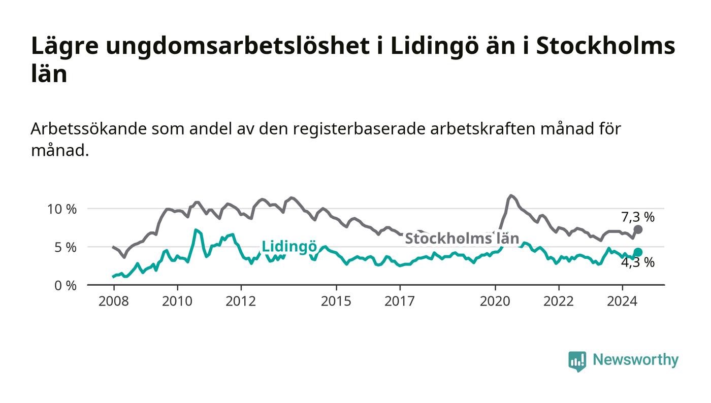 I och med den senaste månadens uppgång har de ungas arbetslöshet på Lidingö stigit 13 månader i följd (upp från 3,6 procent i juni 2023 till 4,3 procent nu).