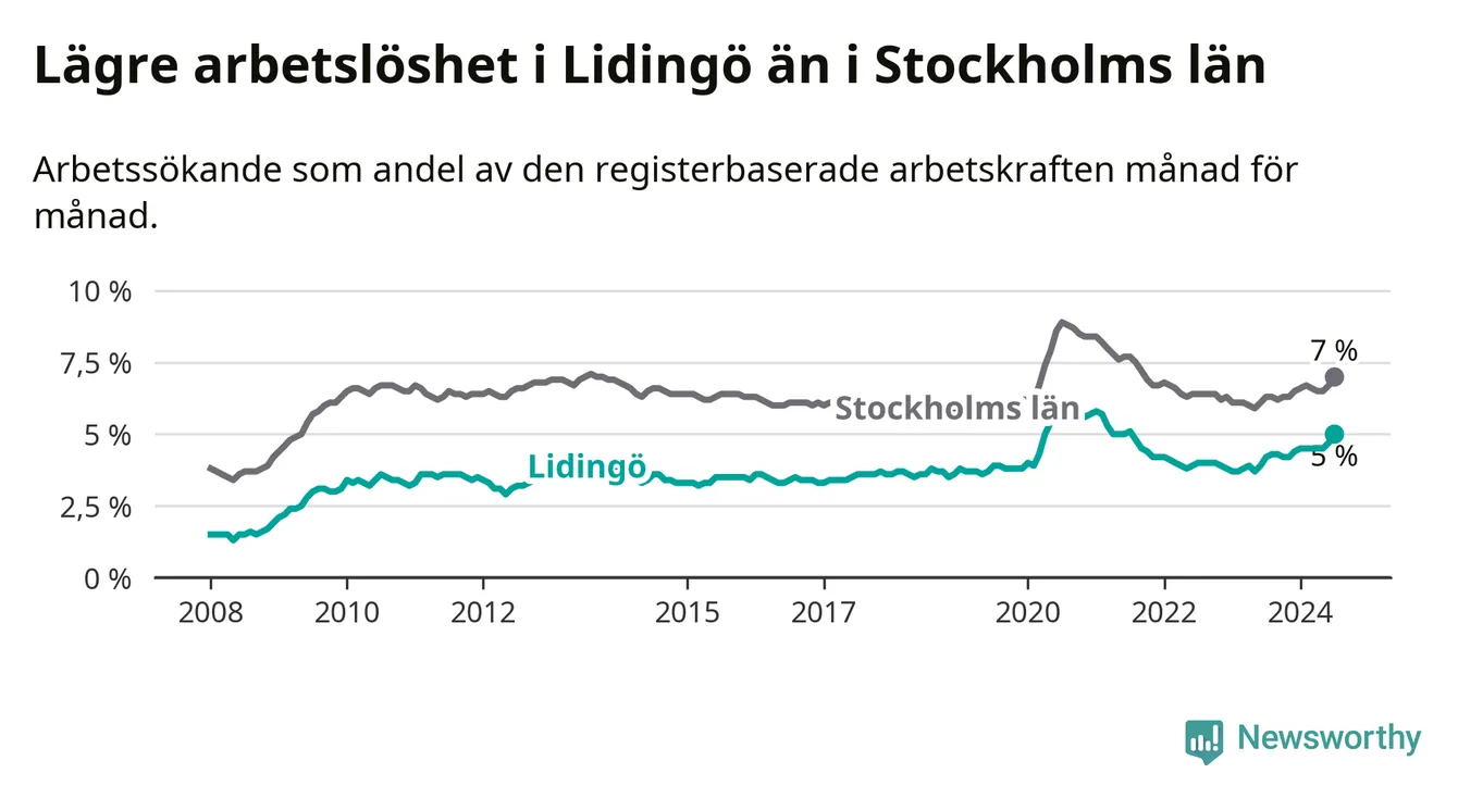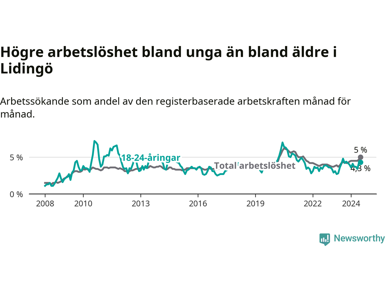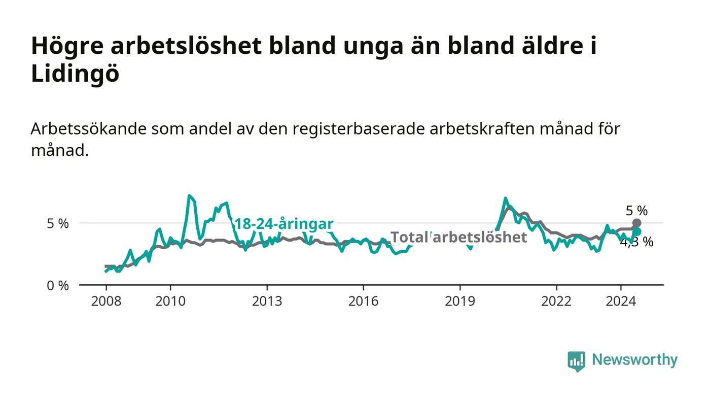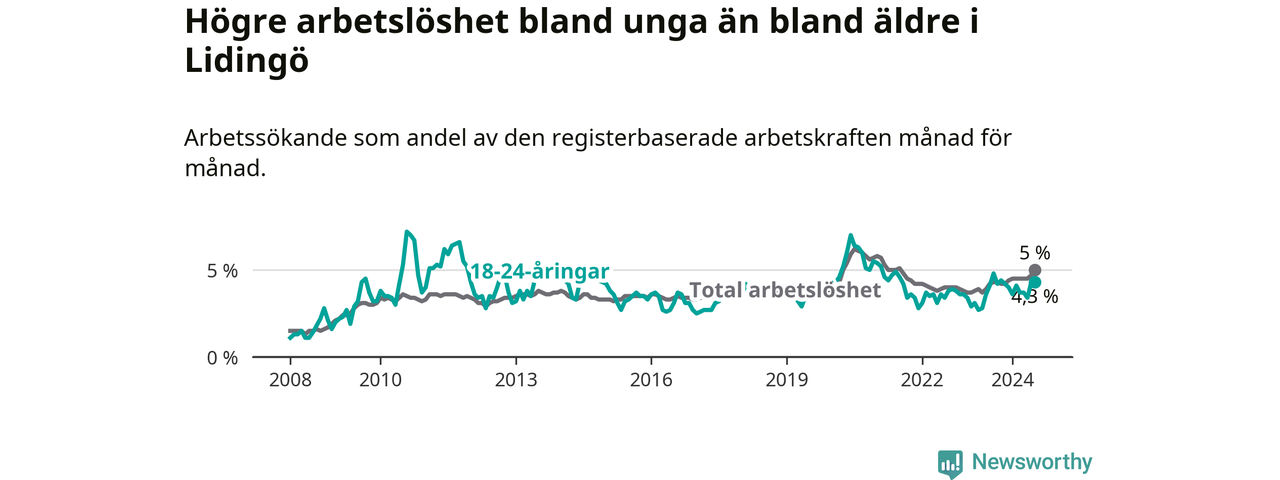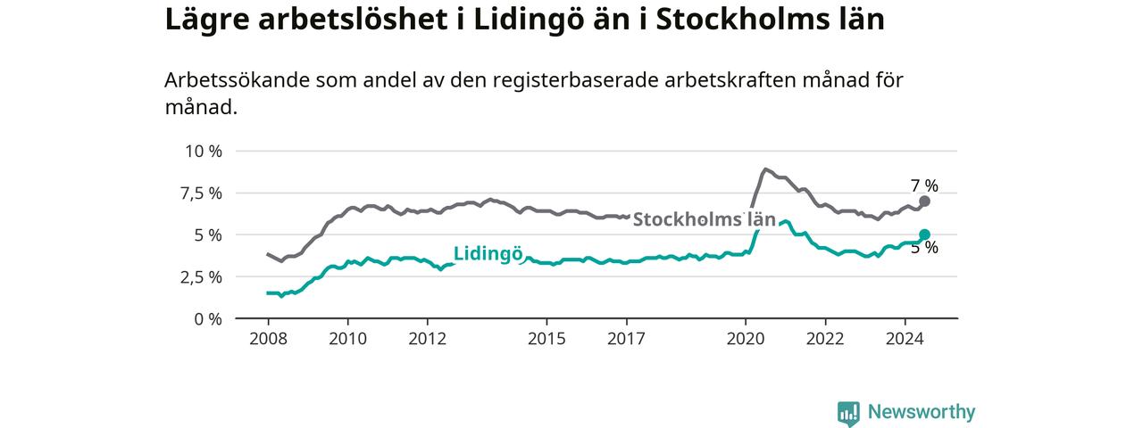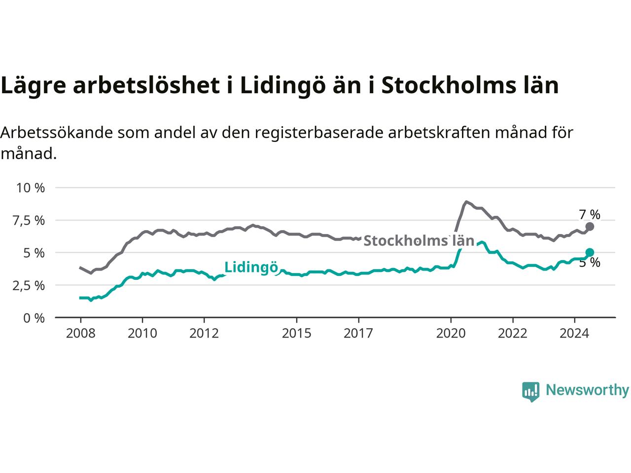 Det är 13:e månaden i följd som arbetslösheten på Lidingö är högre än den var under samma tidpunkt året innan. Sedan juni 2023 har arbetslösheten gått upp från 3,9 till 5,0 procent. Den nuvarande arbetslöshetsnivån är därmed den högsta sedan juli 2021.