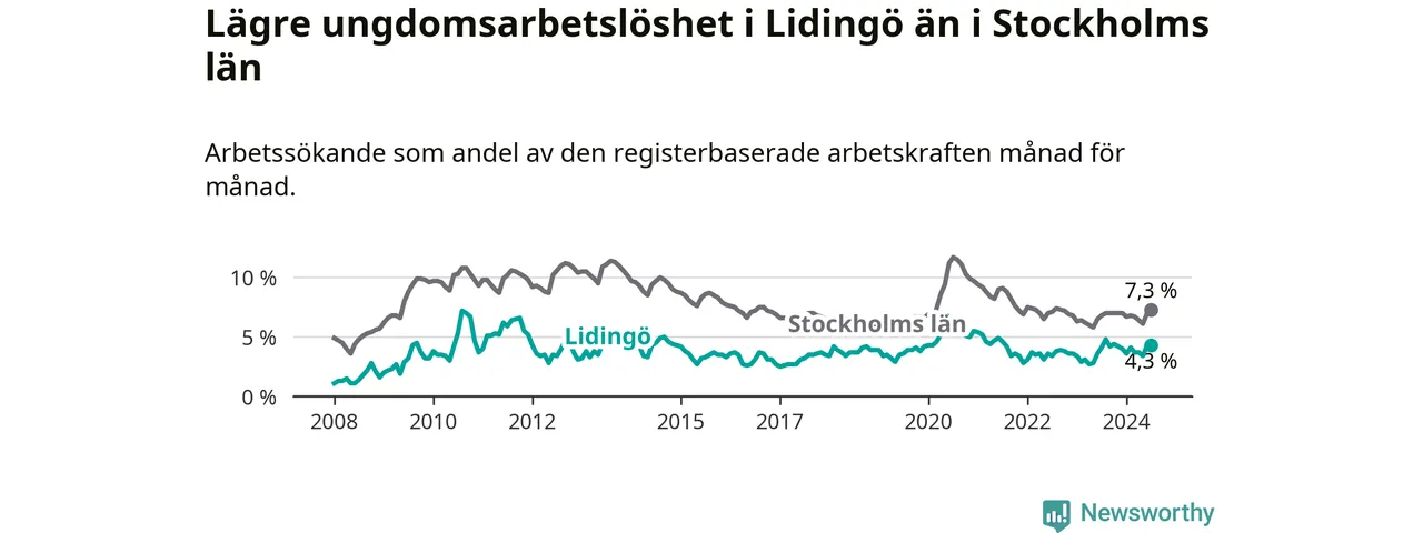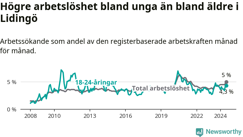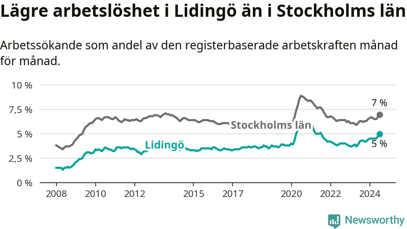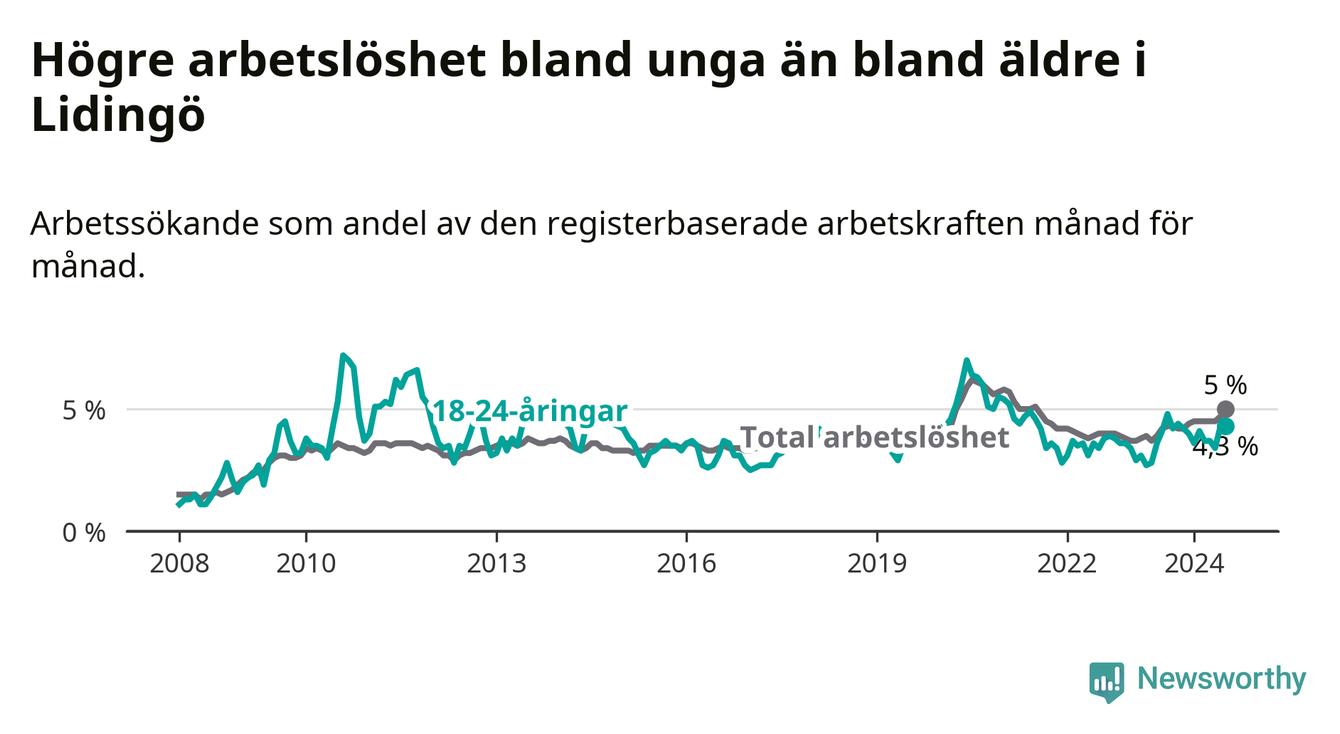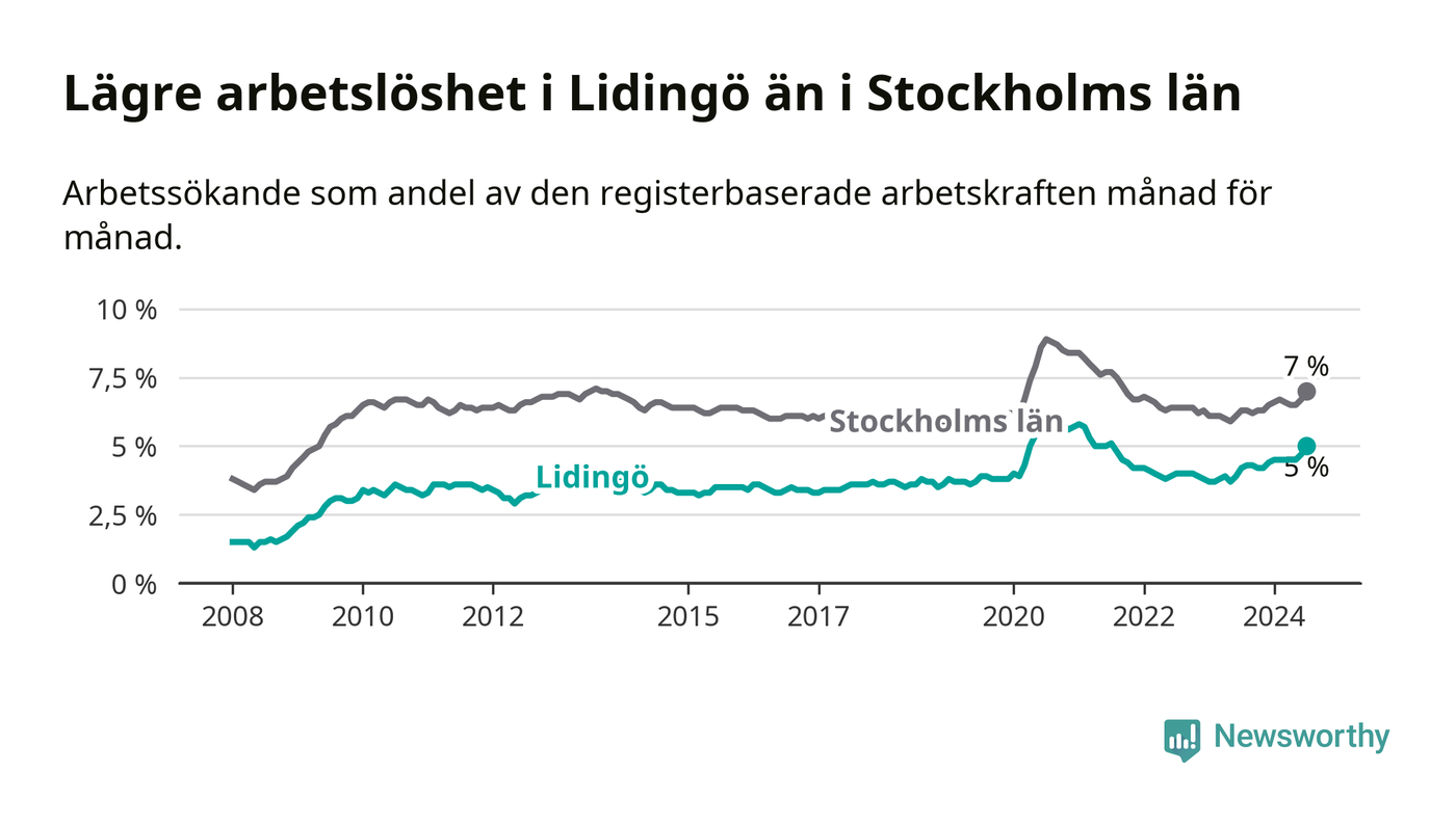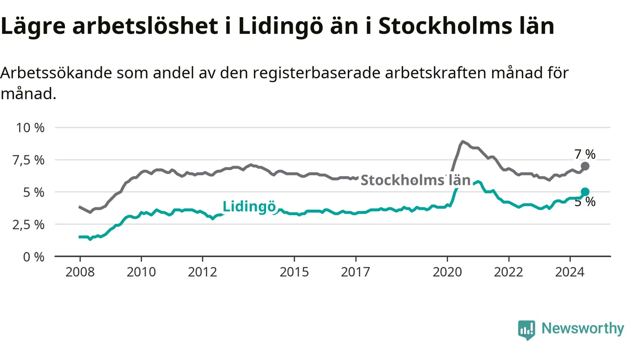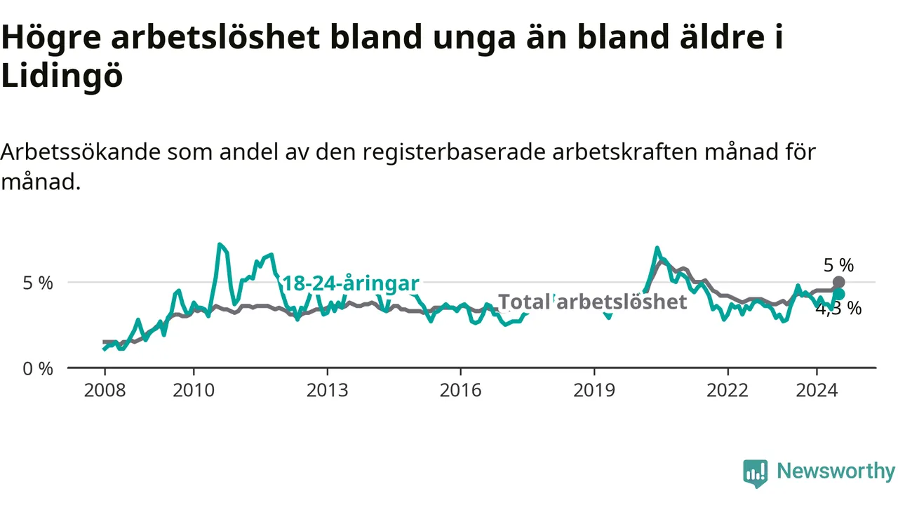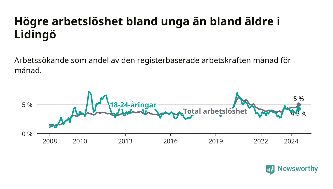 Det är 13:e månaden i följd som arbetslösheten på Lidingö är högre än den var under samma tidpunkt året innan. Sedan juni 2023 har arbetslösheten gått upp från 3,9 till 5,0 procent. Den nuvarande arbetslöshetsnivån är därmed den högsta sedan juli 2021.