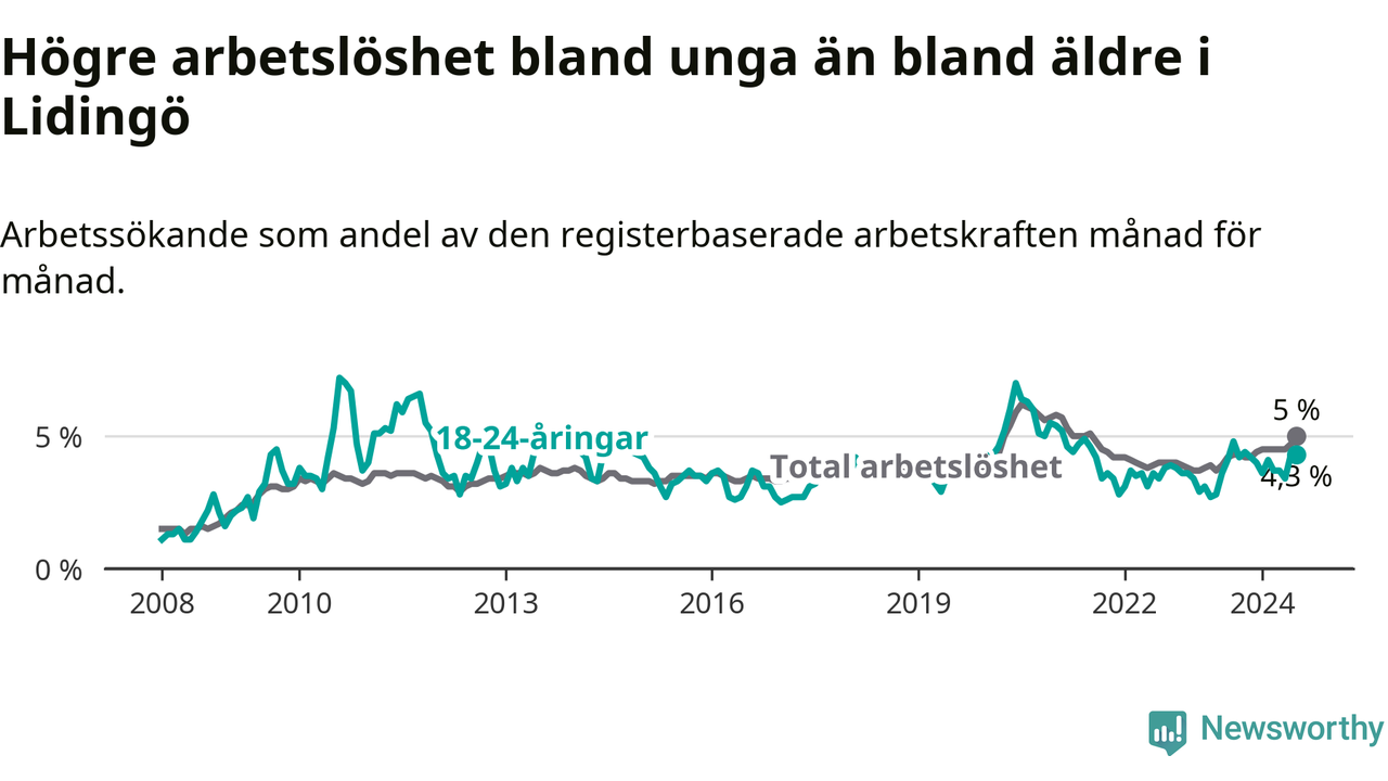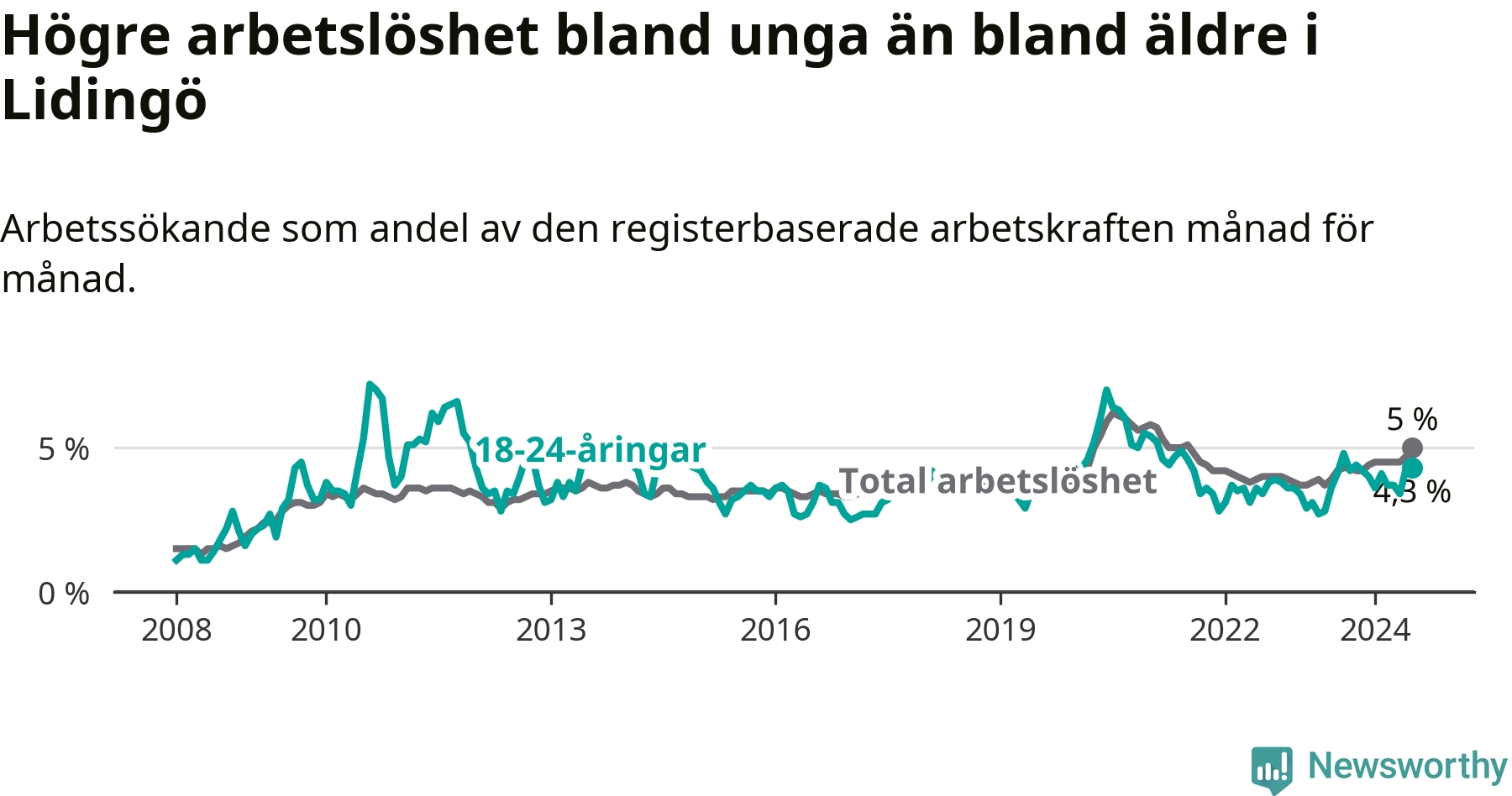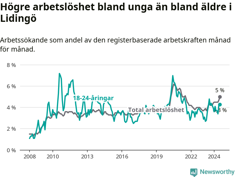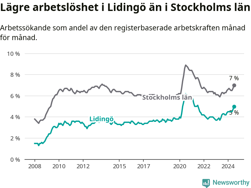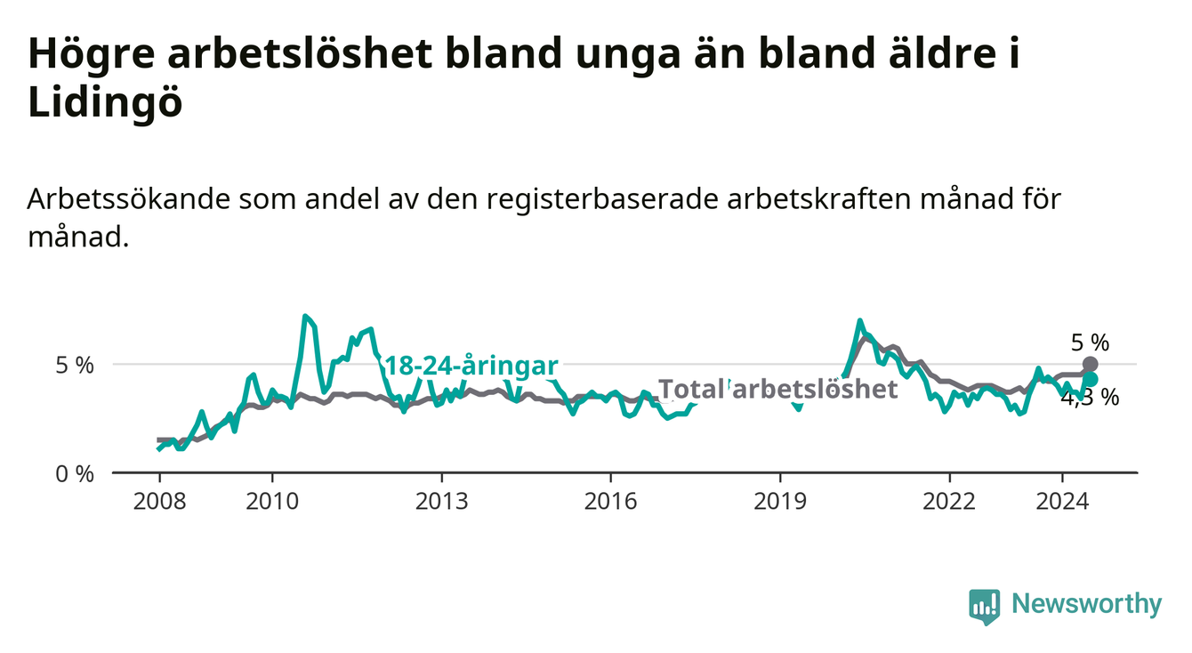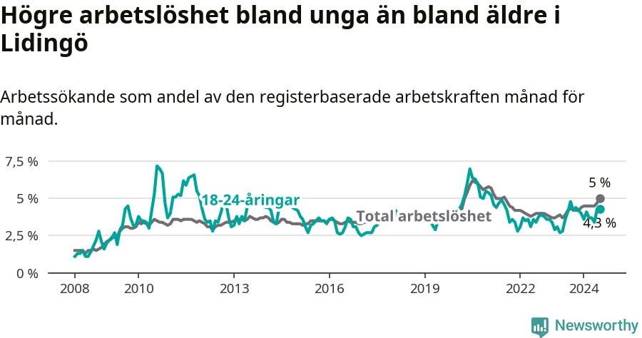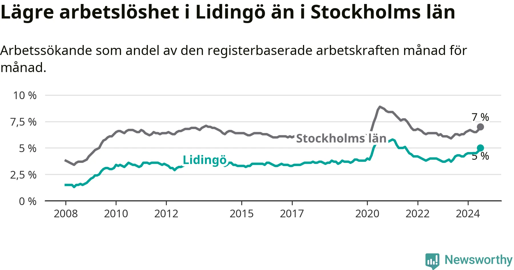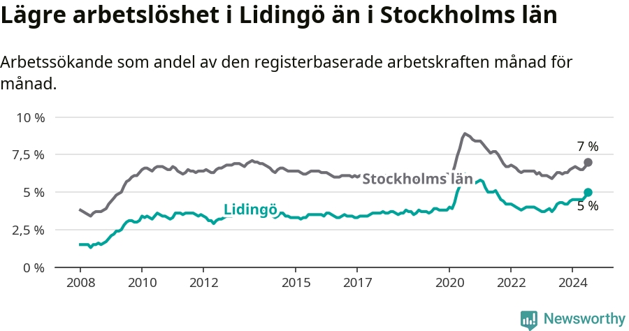 Det är 13:e månaden i följd som arbetslösheten på Lidingö är högre än den var under samma tidpunkt året innan. Sedan juni 2023 har arbetslösheten gått upp från 3,9 till 5,0 procent. Den nuvarande arbetslöshetsnivån är därmed den högsta sedan juli 2021.