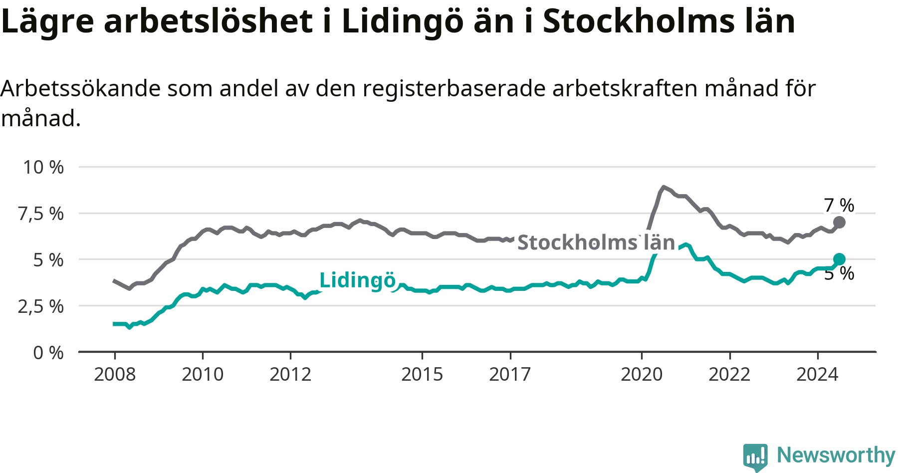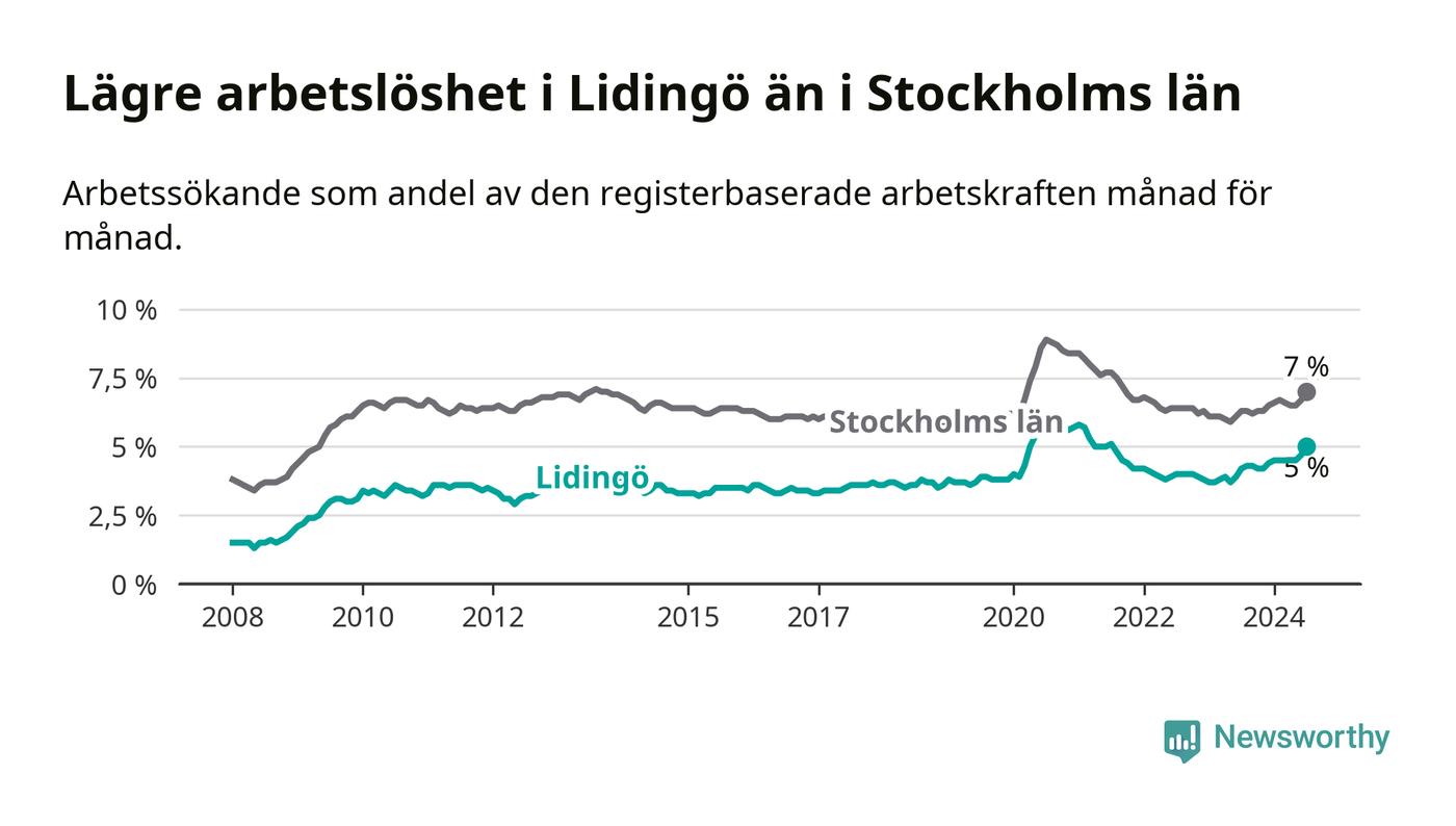 Även om arbetslösheten på Lidingö alltså ökar, så ligger den fortfarande under snittet i hela Stockholms län (5,0 procent i kommunen, jämfört med 7,0 procent i hela länet). Ekerö har den lägsta arbetslösheten i länet (3,5 procent), medan Södertälje har den högsta (11,0 procent). För att Lidingö skulle komma ner i samma arbetslöshetsnivå som Ekerö skulle 338 personer behöva sysselsättas.
