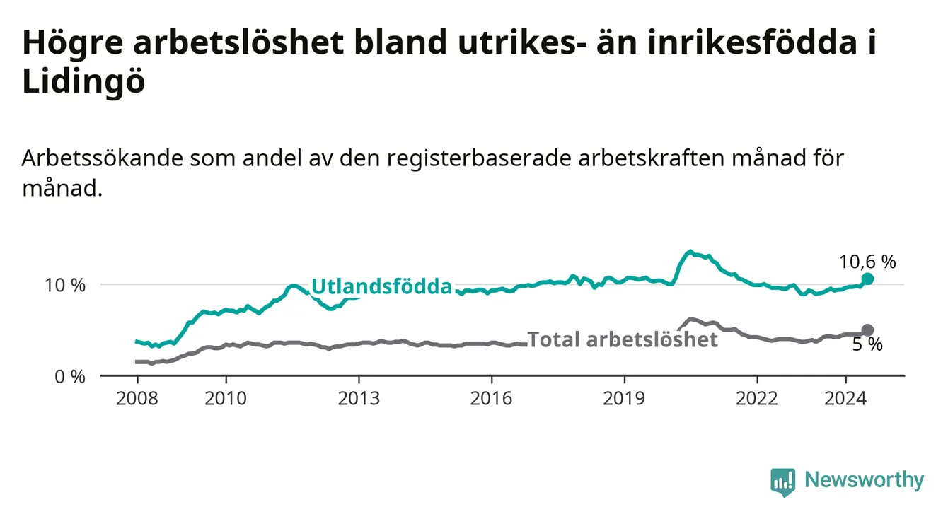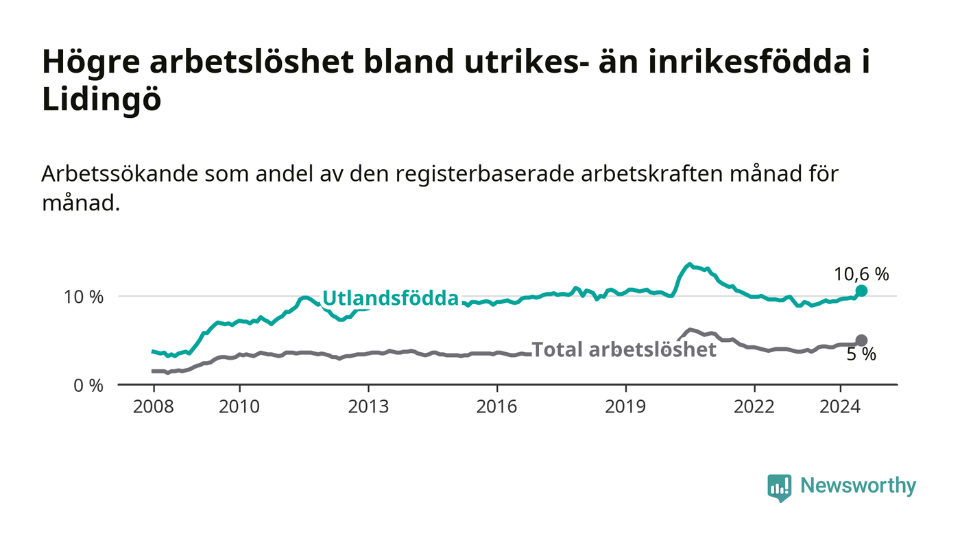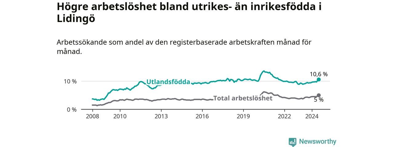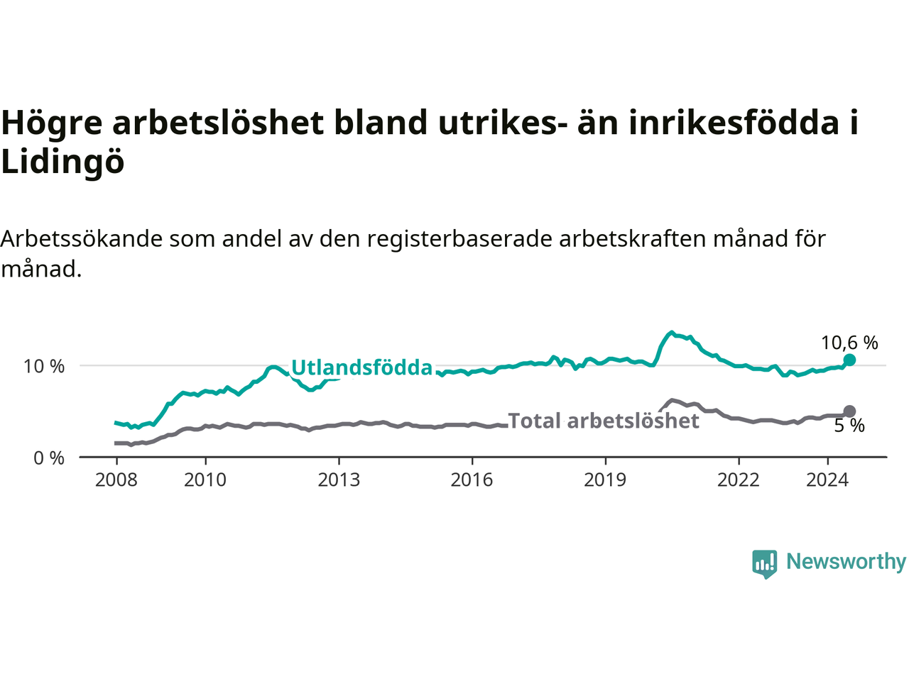 Arbetslösheten bland utlandsfödda var 10,6 procent på Lidingö under juli månad, motsvarande 520 av 4 906 personer. Det är 1,5 procentenheter fler än vid samma tidpunkt i fjol (−438 om man räknar personer). Därmed är de utlandsföddas arbetslöshet högre än vid samma tidpunkt i fjol för sjunde månaden i följd. Sedan december 2023 har arbetslösheten bland utlandsfödda ökat från 9,4 till 10,6 procent.