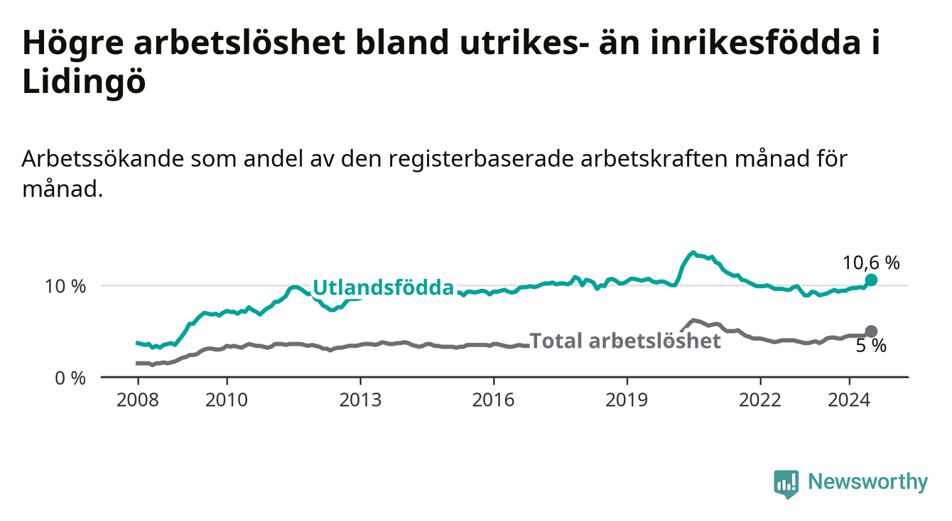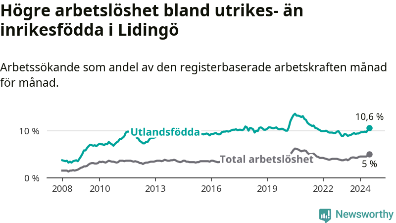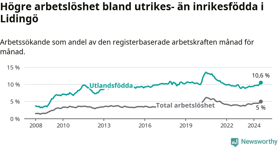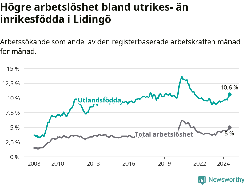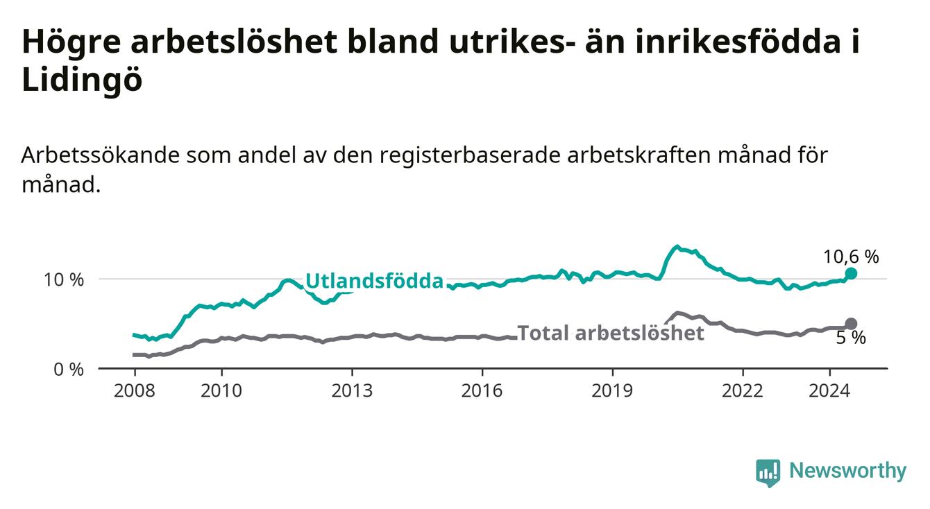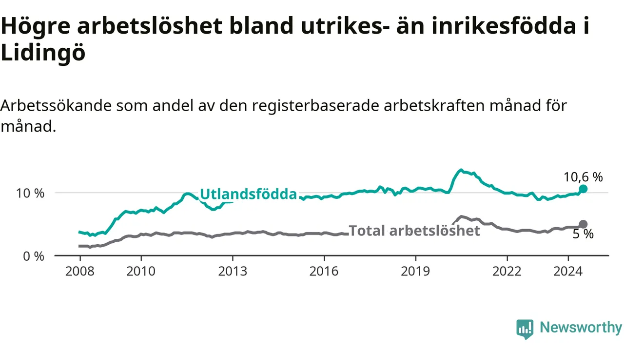 Arbetslösheten bland utlandsfödda var 10,6 procent på Lidingö under juli månad, motsvarande 520 av 4 906 personer. Det är 1,5 procentenheter fler än vid samma tidpunkt i fjol (−438 om man räknar personer). Därmed är de utlandsföddas arbetslöshet högre än vid samma tidpunkt i fjol för sjunde månaden i följd. Sedan december 2023 har arbetslösheten bland utlandsfödda ökat från 9,4 till 10,6 procent.