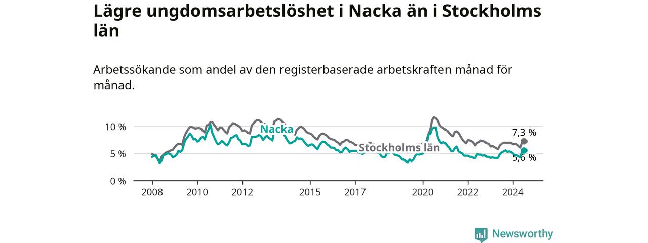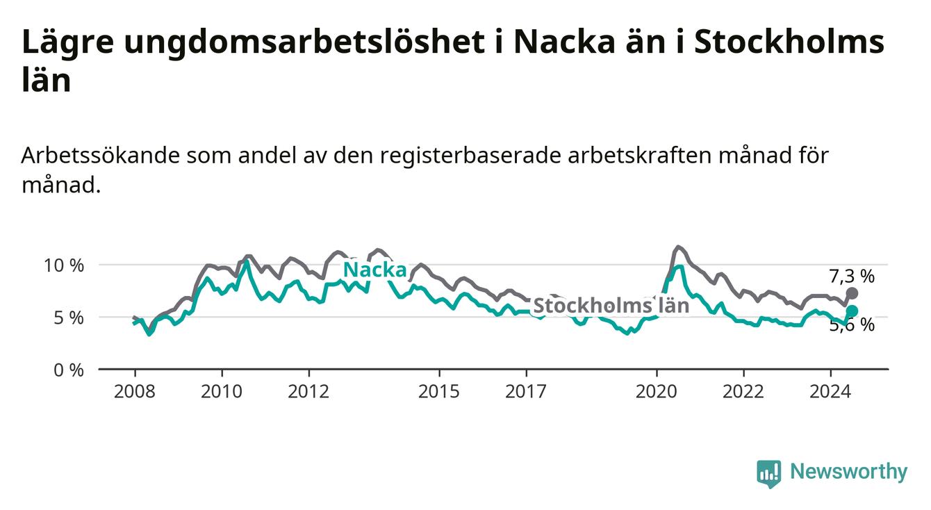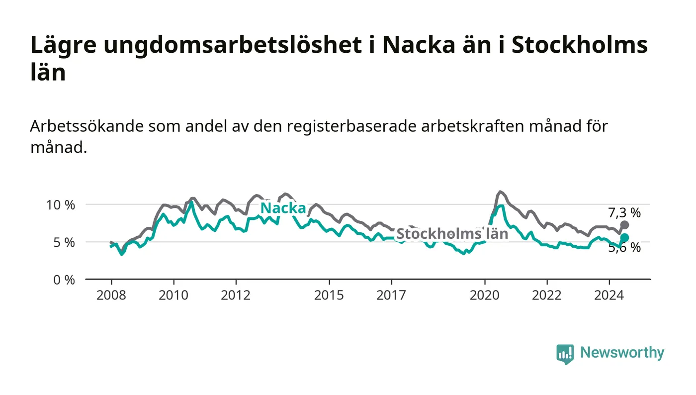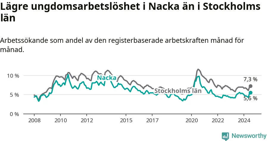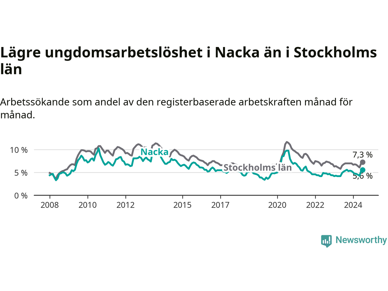 Precis som den totala arbetslösheten ligger ungdomsarbetslösheten i Nacka lägre än i Stockholms län som helhet. Skillnaden mellan kommunen och länet är 1,7 procentenheter.