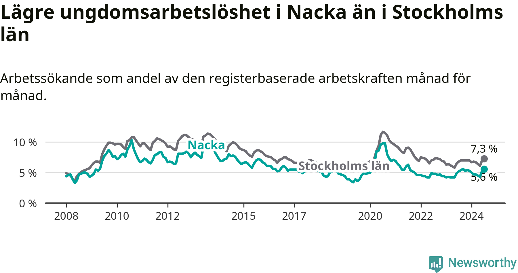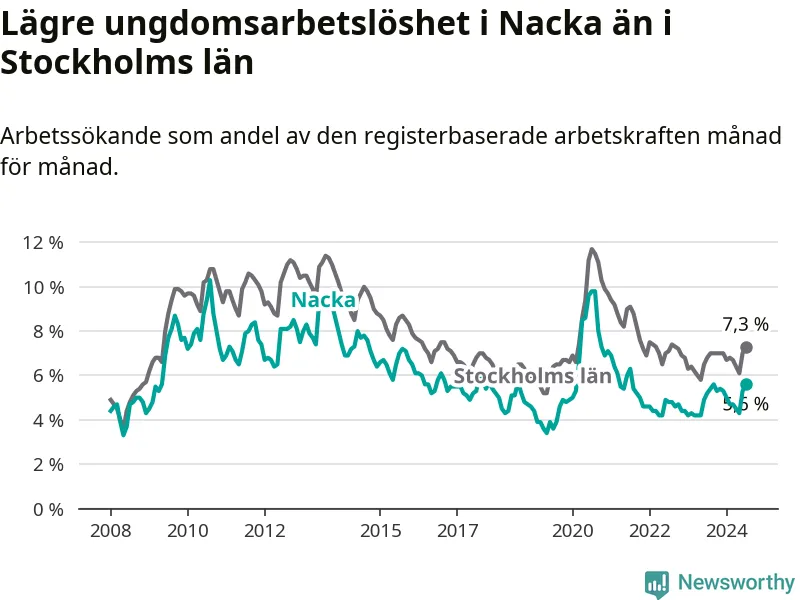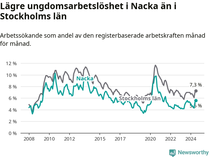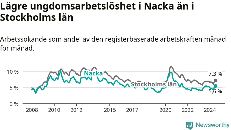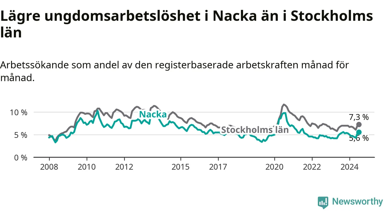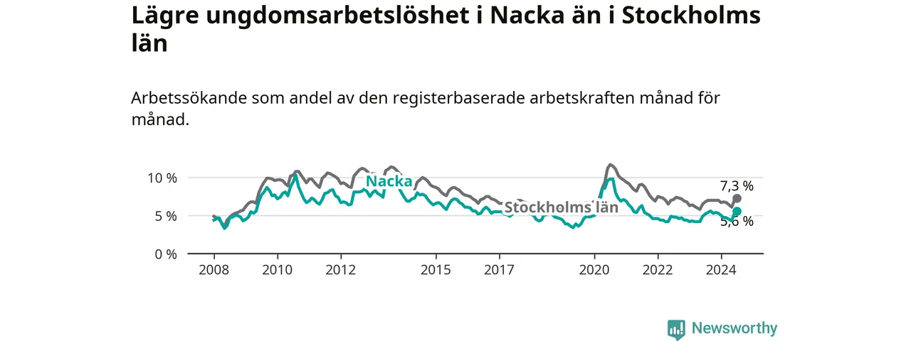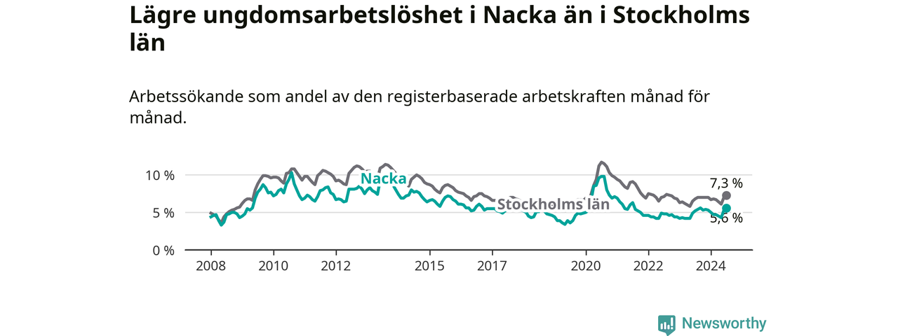 Precis som den totala arbetslösheten ligger ungdomsarbetslösheten i Nacka lägre än i Stockholms län som helhet. Skillnaden mellan kommunen och länet är 1,7 procentenheter.
