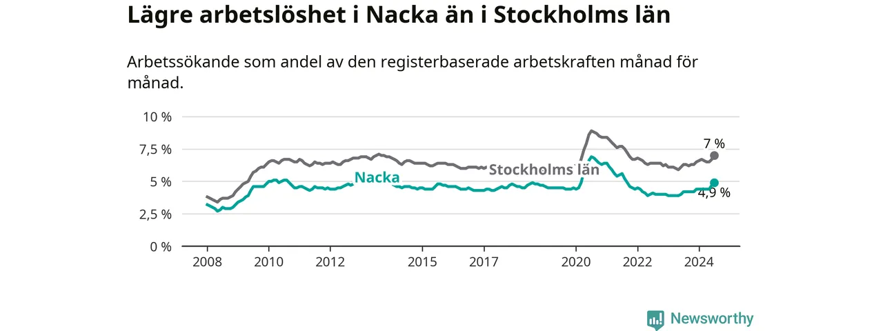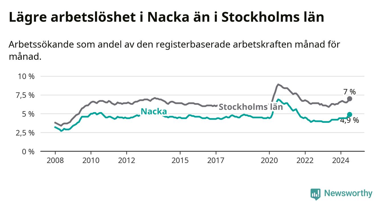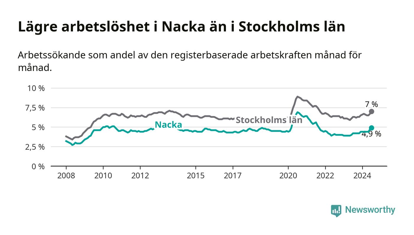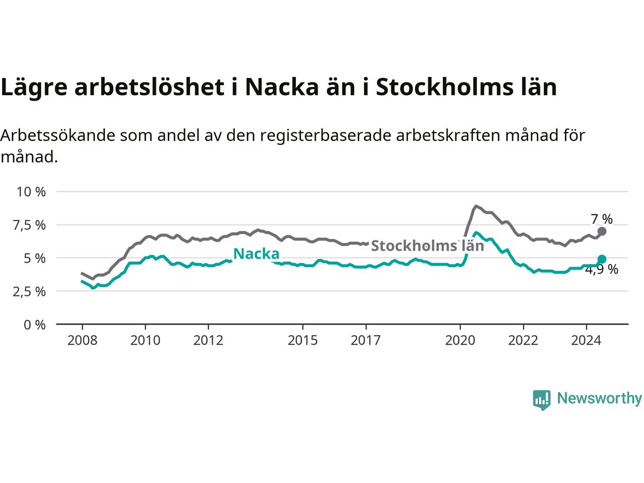 Även om arbetslösheten i Nacka alltså ökar, så ligger den fortfarande under snittet i hela Stockholms län (4,9 procent i kommunen, jämfört med 7,0 procent i hela länet). Ekerö har den lägsta arbetslösheten i länet (3,5 procent), medan Södertälje har den högsta (11,0 procent). För att Nacka skulle komma ner i samma arbetslöshetsnivå som Ekerö skulle 782 personer behöva sysselsättas.