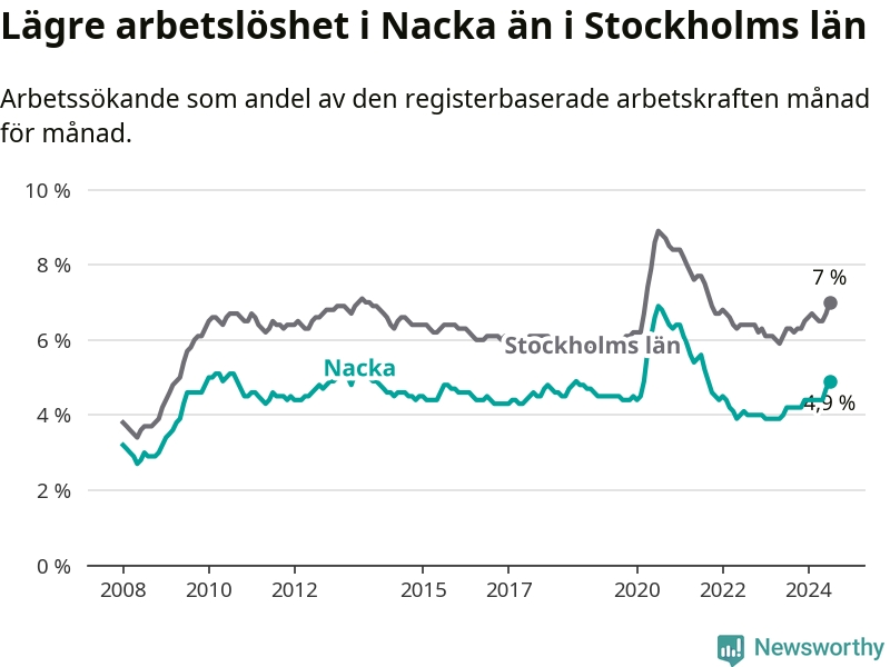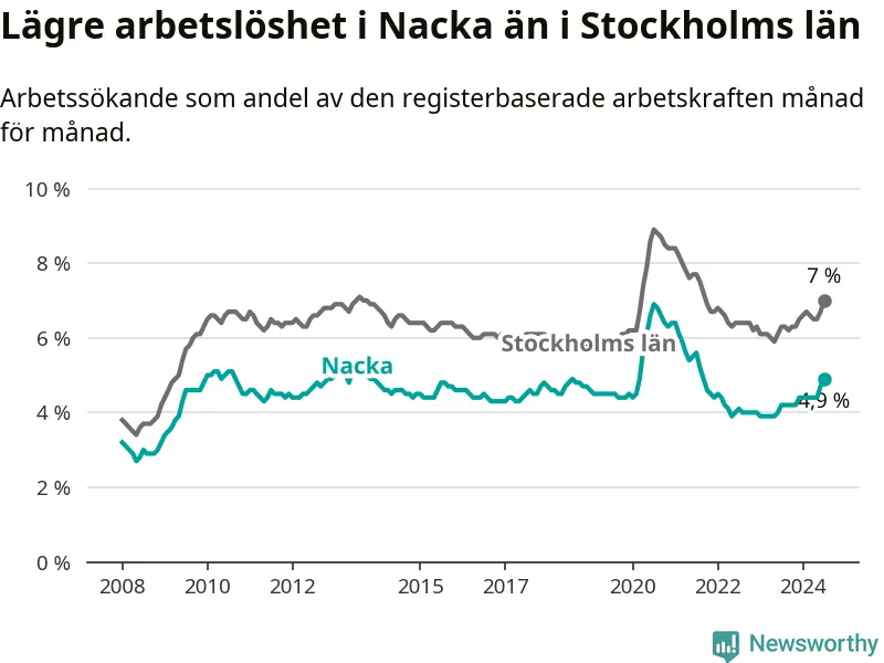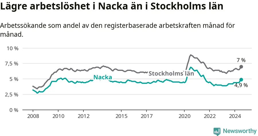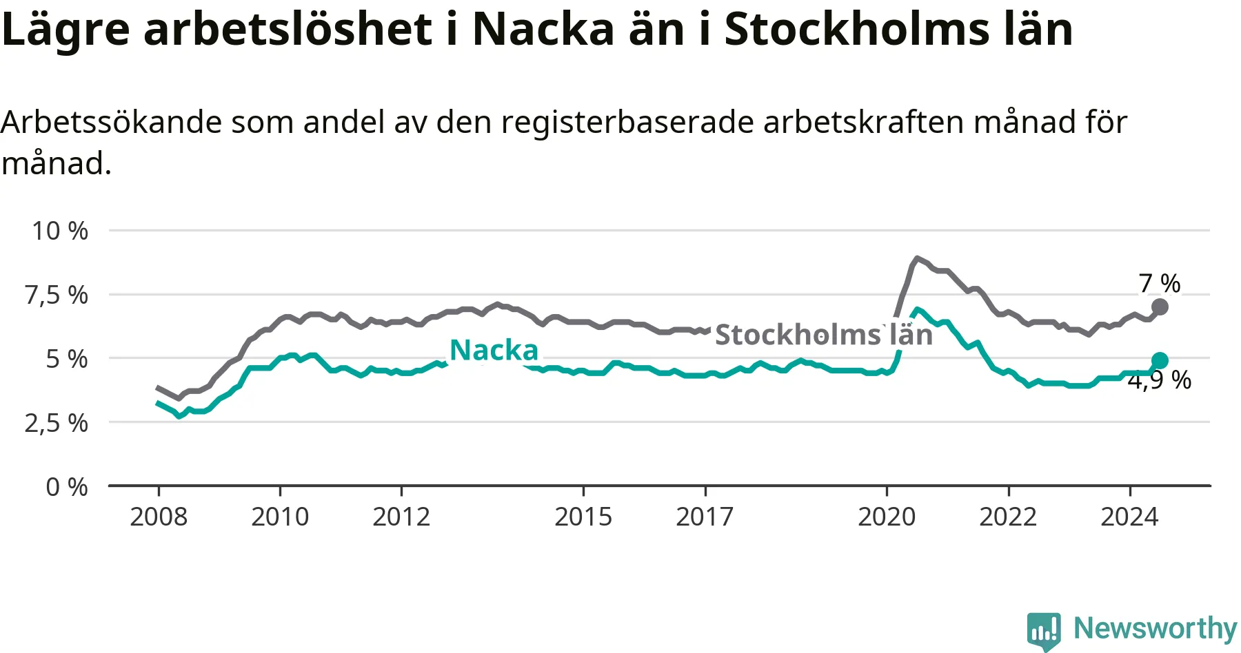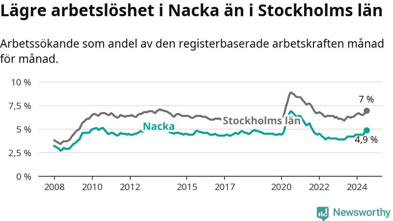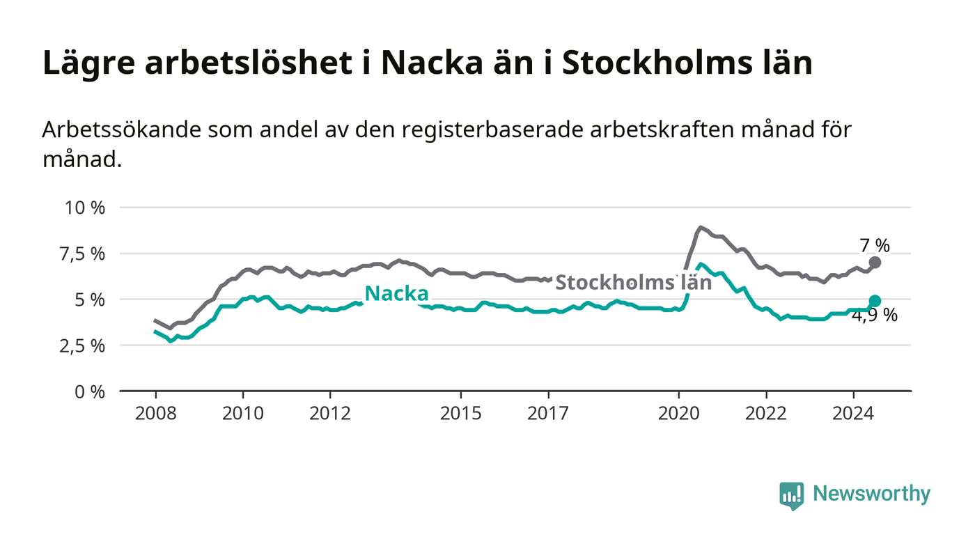 Även om arbetslösheten i Nacka alltså ökar, så ligger den fortfarande under snittet i hela Stockholms län (4,9 procent i kommunen, jämfört med 7,0 procent i hela länet). Ekerö har den lägsta arbetslösheten i länet (3,5 procent), medan Södertälje har den högsta (11,0 procent). För att Nacka skulle komma ner i samma arbetslöshetsnivå som Ekerö skulle 782 personer behöva sysselsättas.