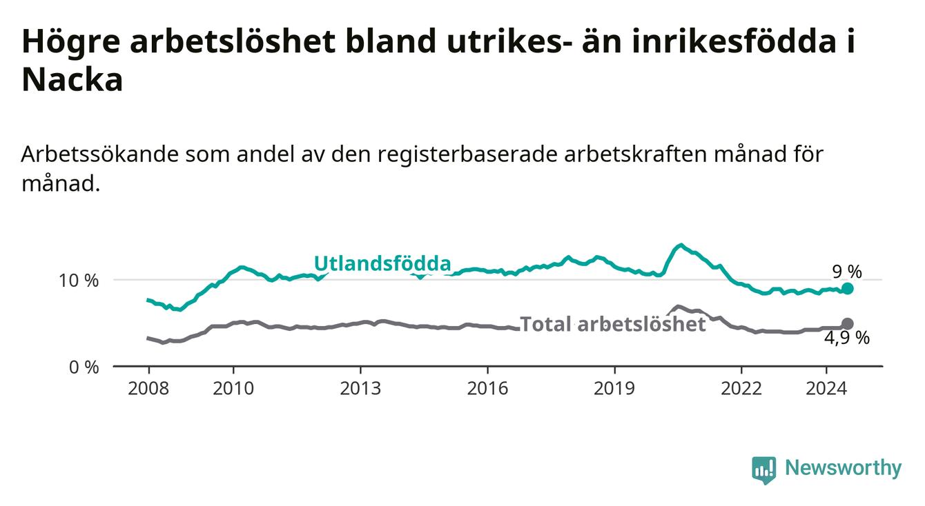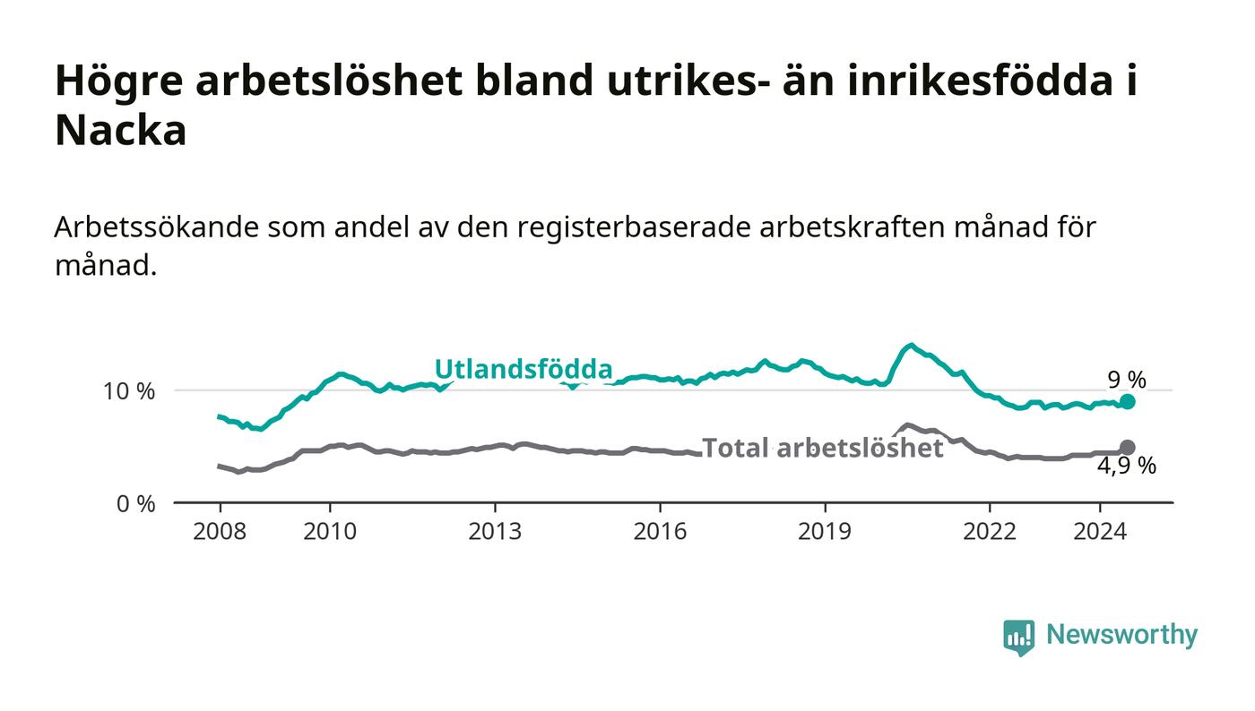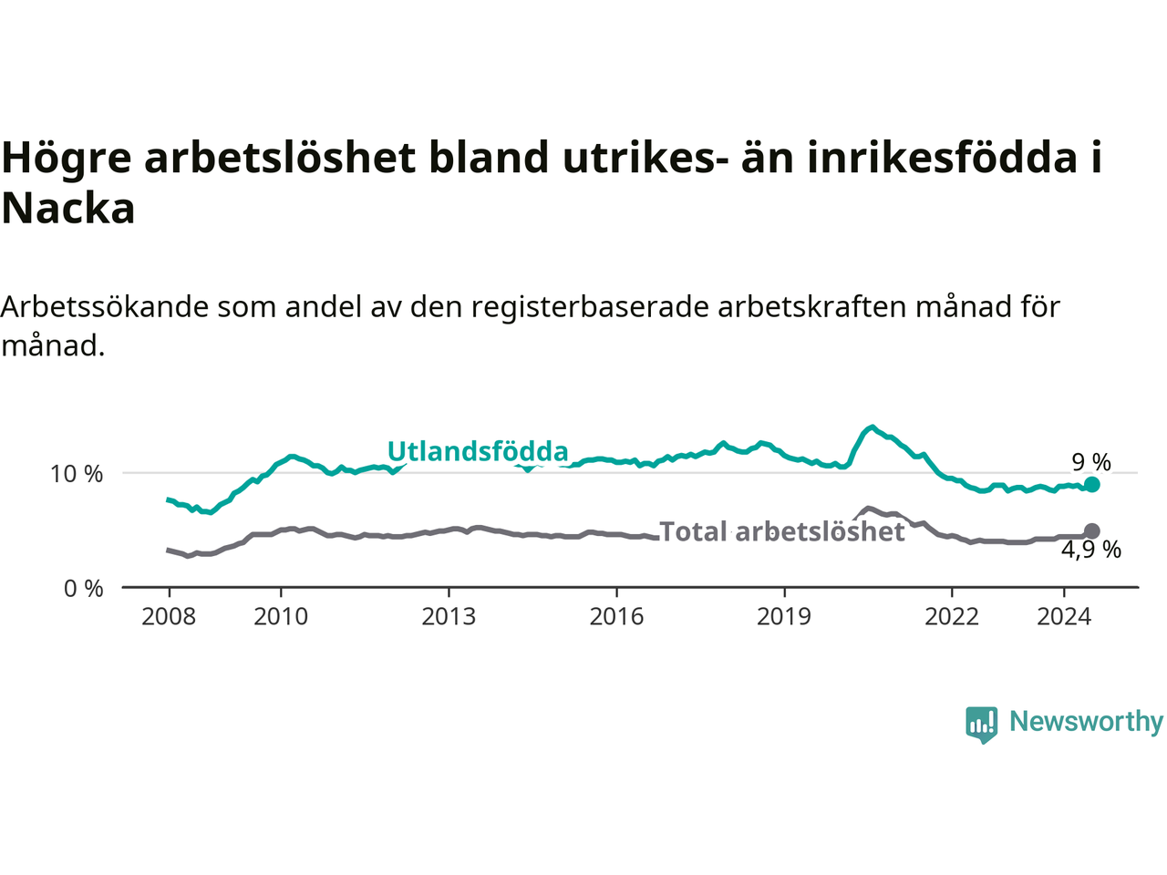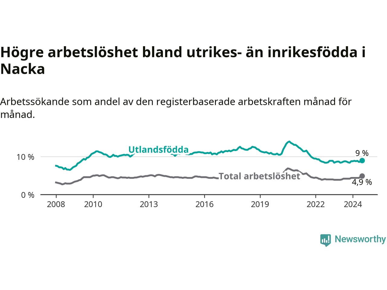 Arbetslösheten bland utlandsfödda var 9,0 procent i Nacka under juli månad, motsvarande 1 191 av 13 233 personer. Det är 0,3 procentenheter fler än vid samma tidpunkt i fjol (−1 139 om man räknar personer). Därmed är de utlandsföddas arbetslöshet högre än vid samma tidpunkt i fjol för sjunde månaden i följd.