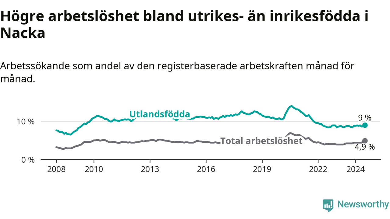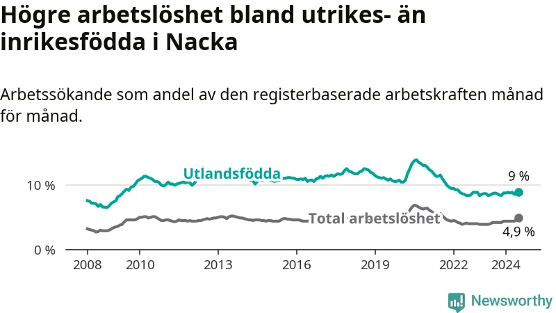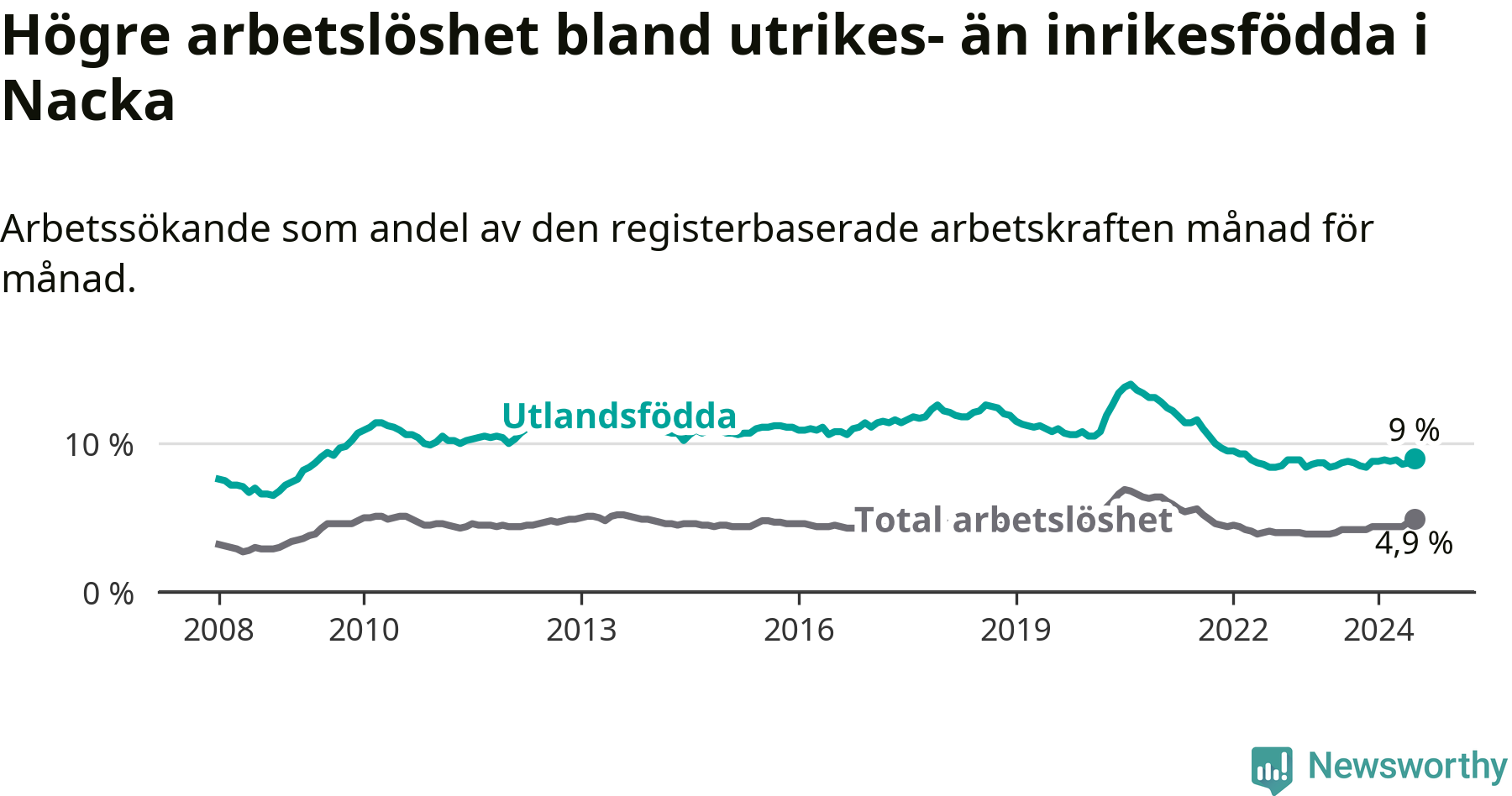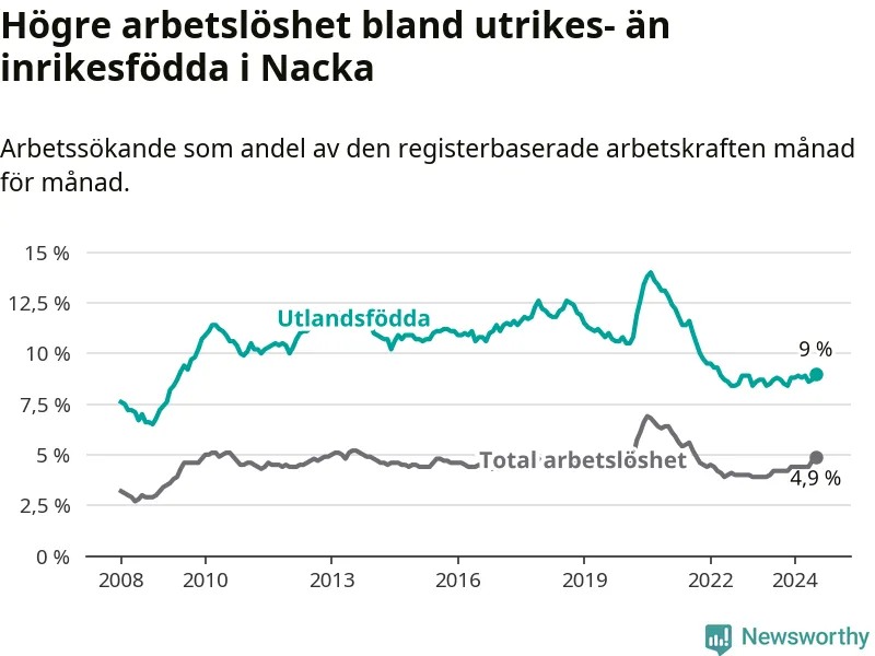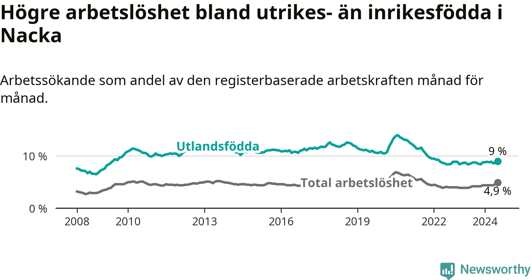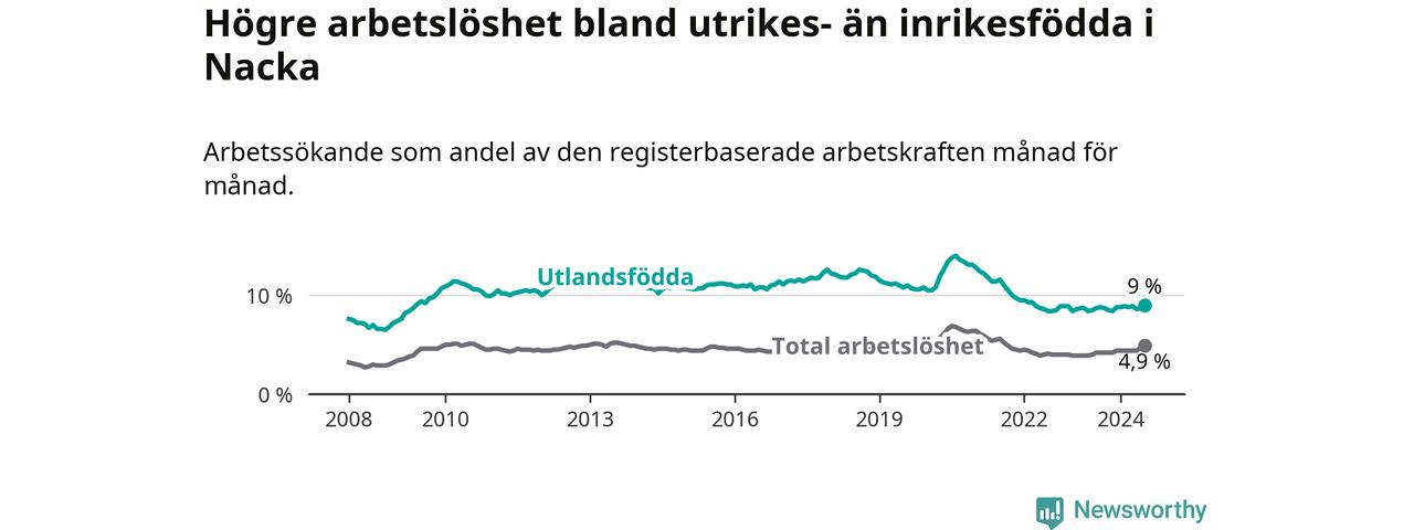 Arbetslösheten bland utlandsfödda var 9,0 procent i Nacka under juli månad, motsvarande 1 191 av 13 233 personer. Det är 0,3 procentenheter fler än vid samma tidpunkt i fjol (−1 139 om man räknar personer). Därmed är de utlandsföddas arbetslöshet högre än vid samma tidpunkt i fjol för sjunde månaden i följd.