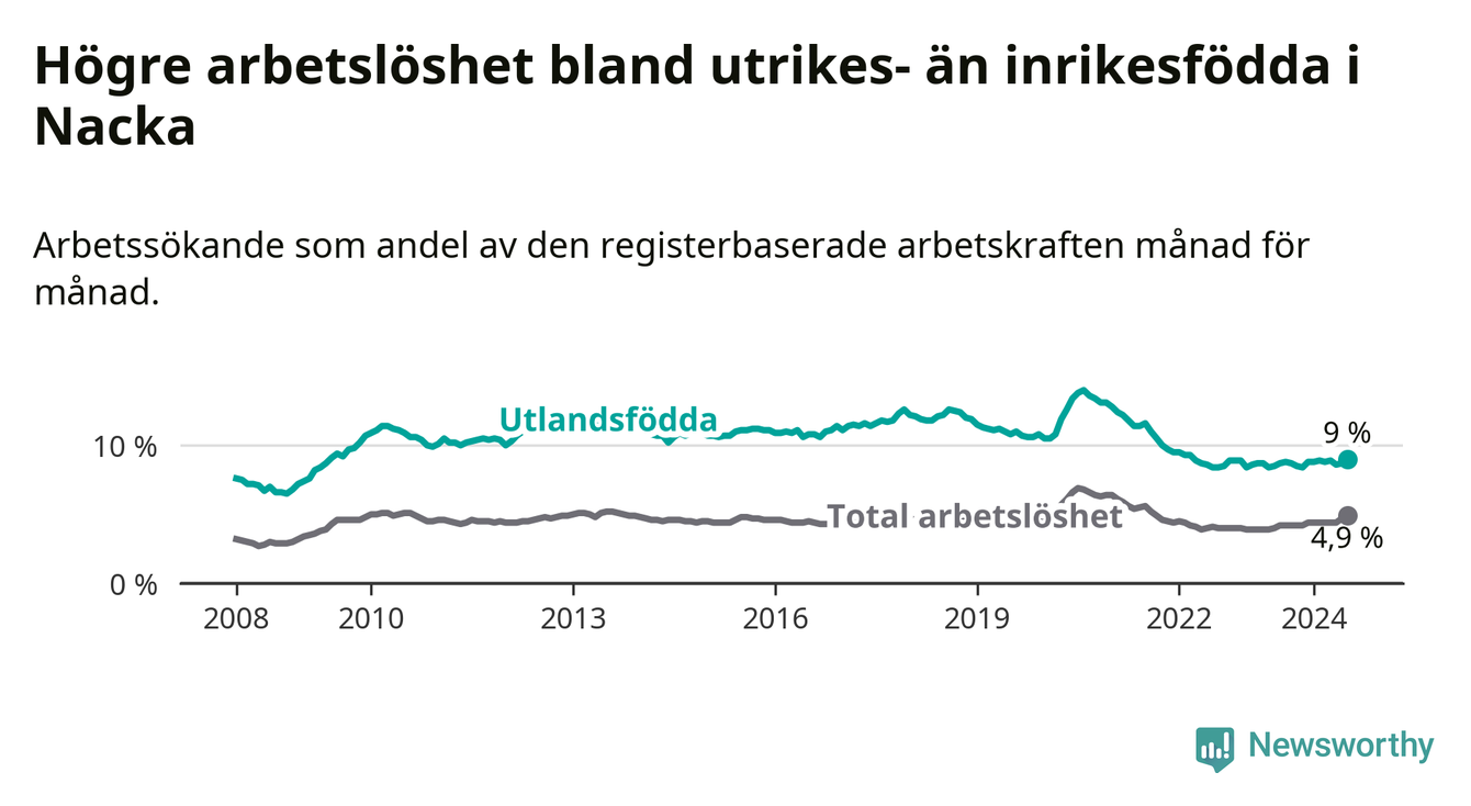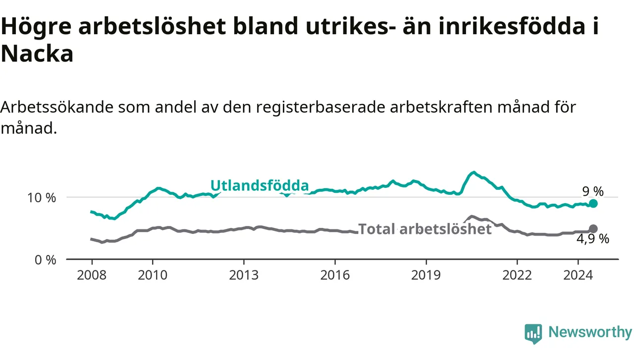 Skillnaden i arbetslöshet mellan utrikesfödda och hela befolkningen är 4,1 procentenheter i Nacka.
