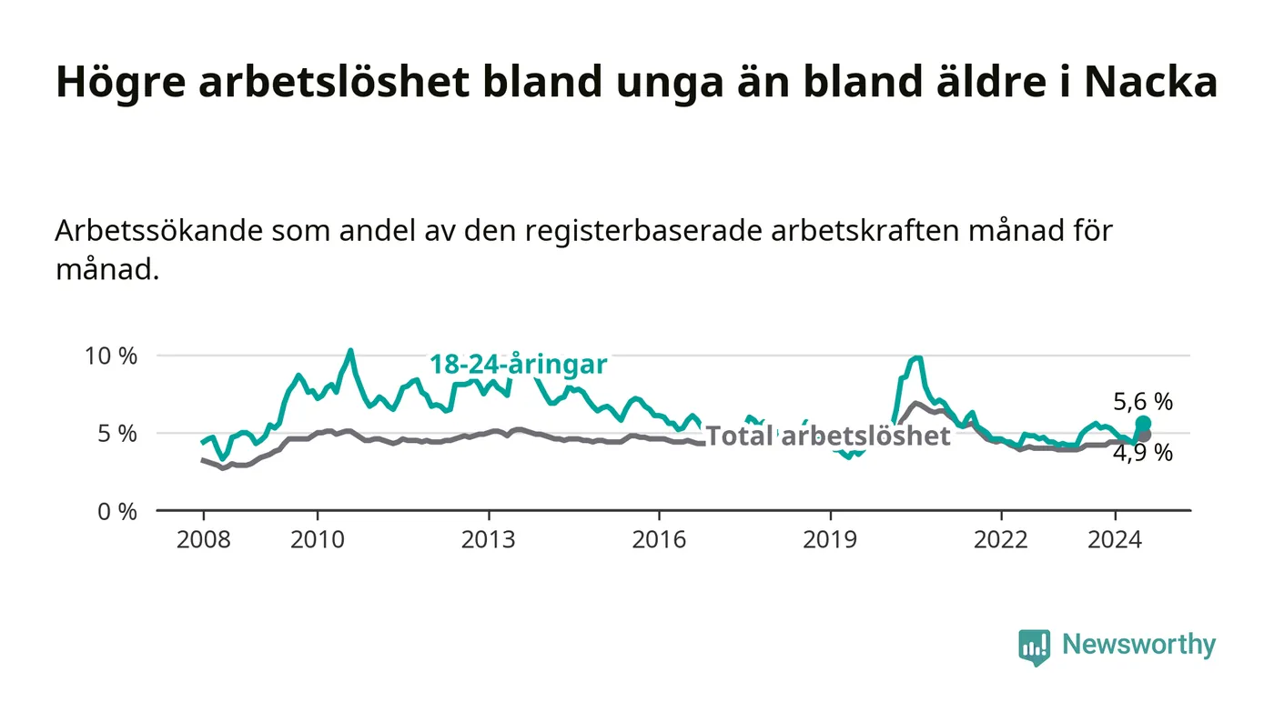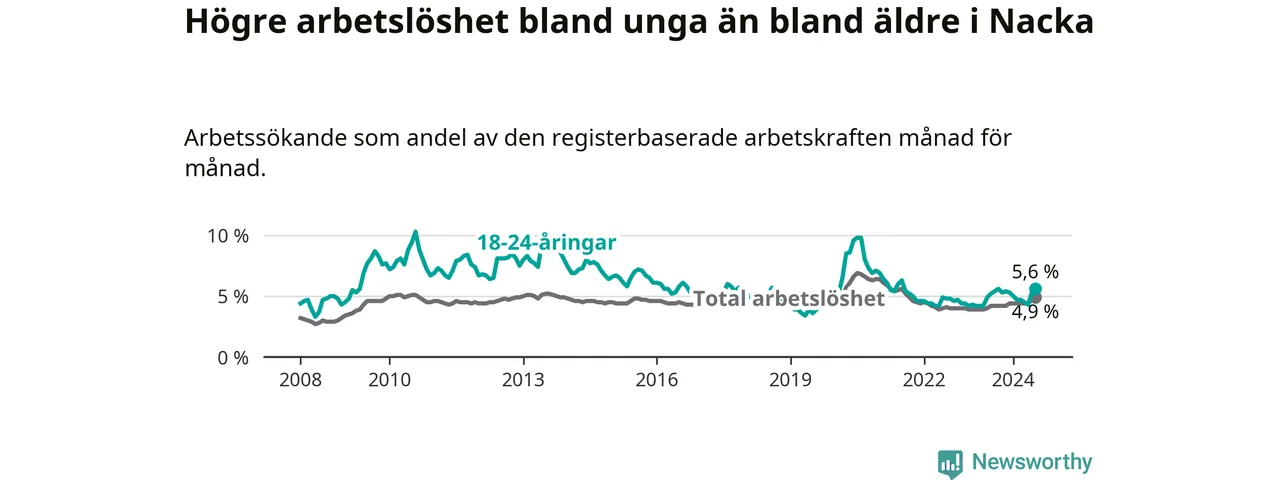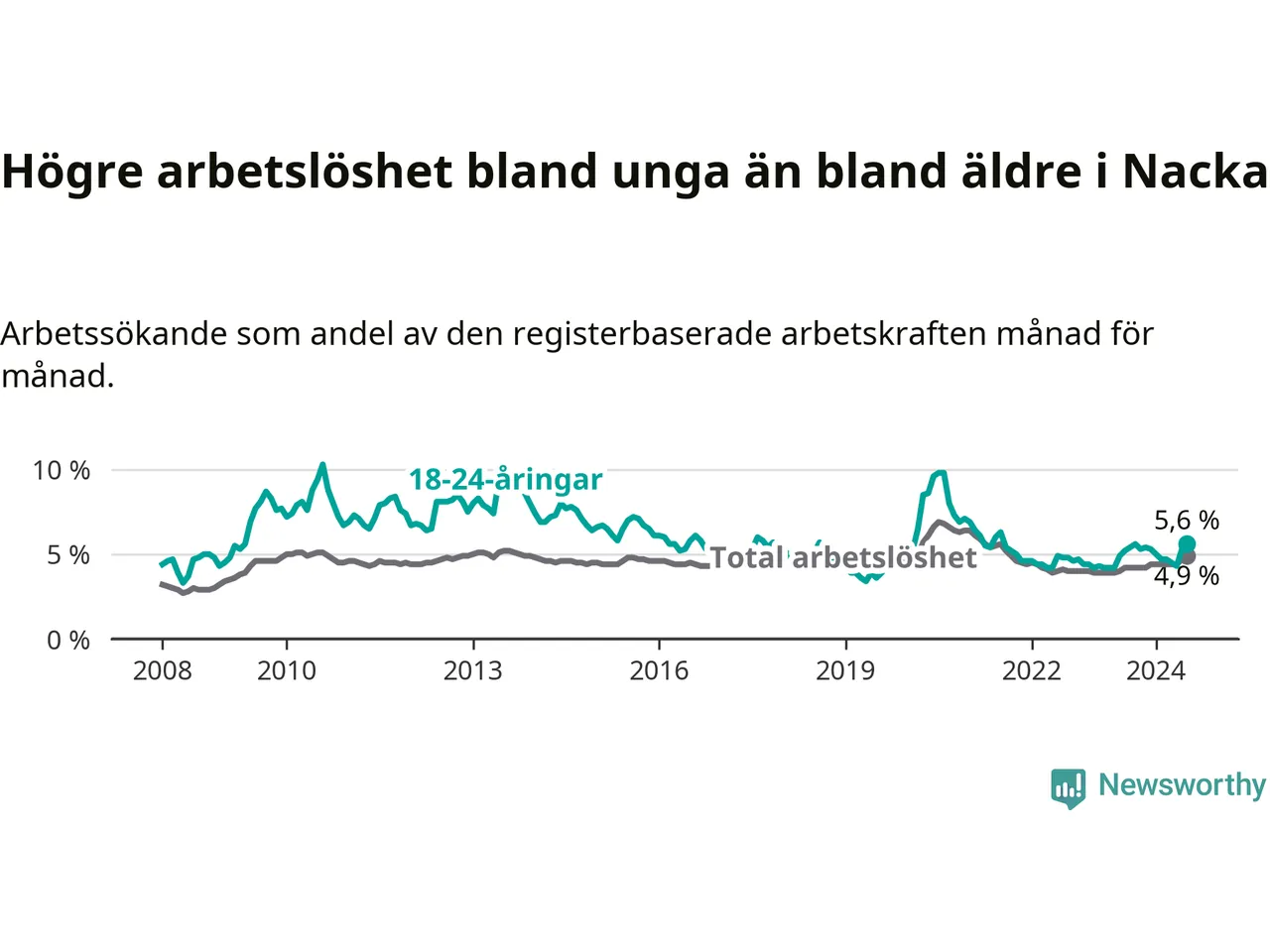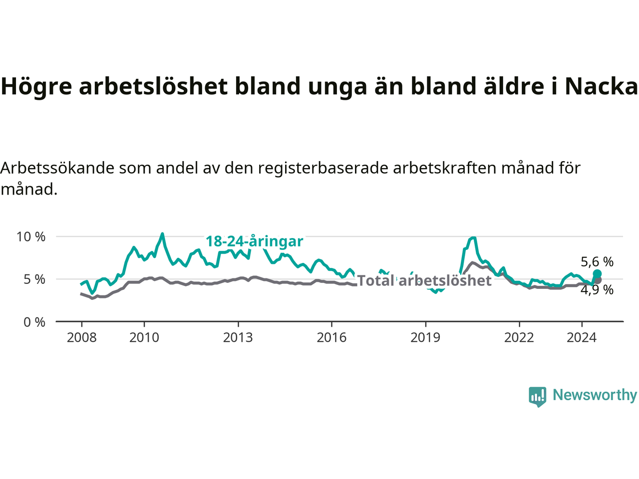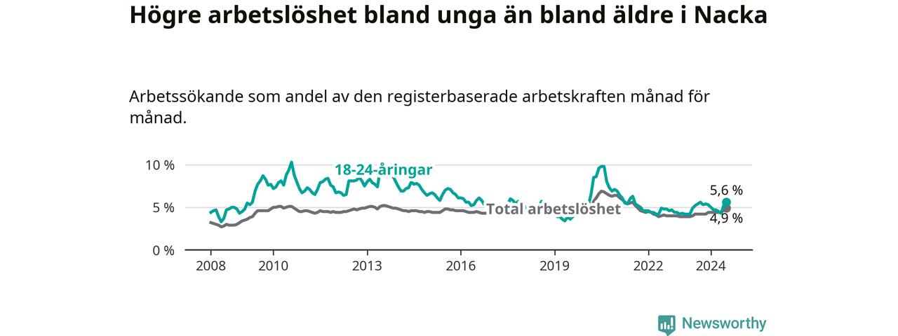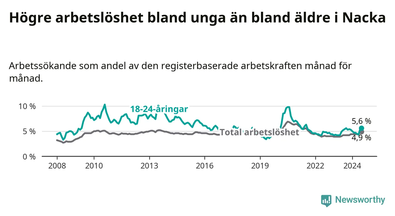 I och med den senaste månadens uppgång har de ungas arbetslöshet i Nacka stigit 13 månader i följd (upp från 4,9 procent i juni 2023 till 5,6 procent nu).