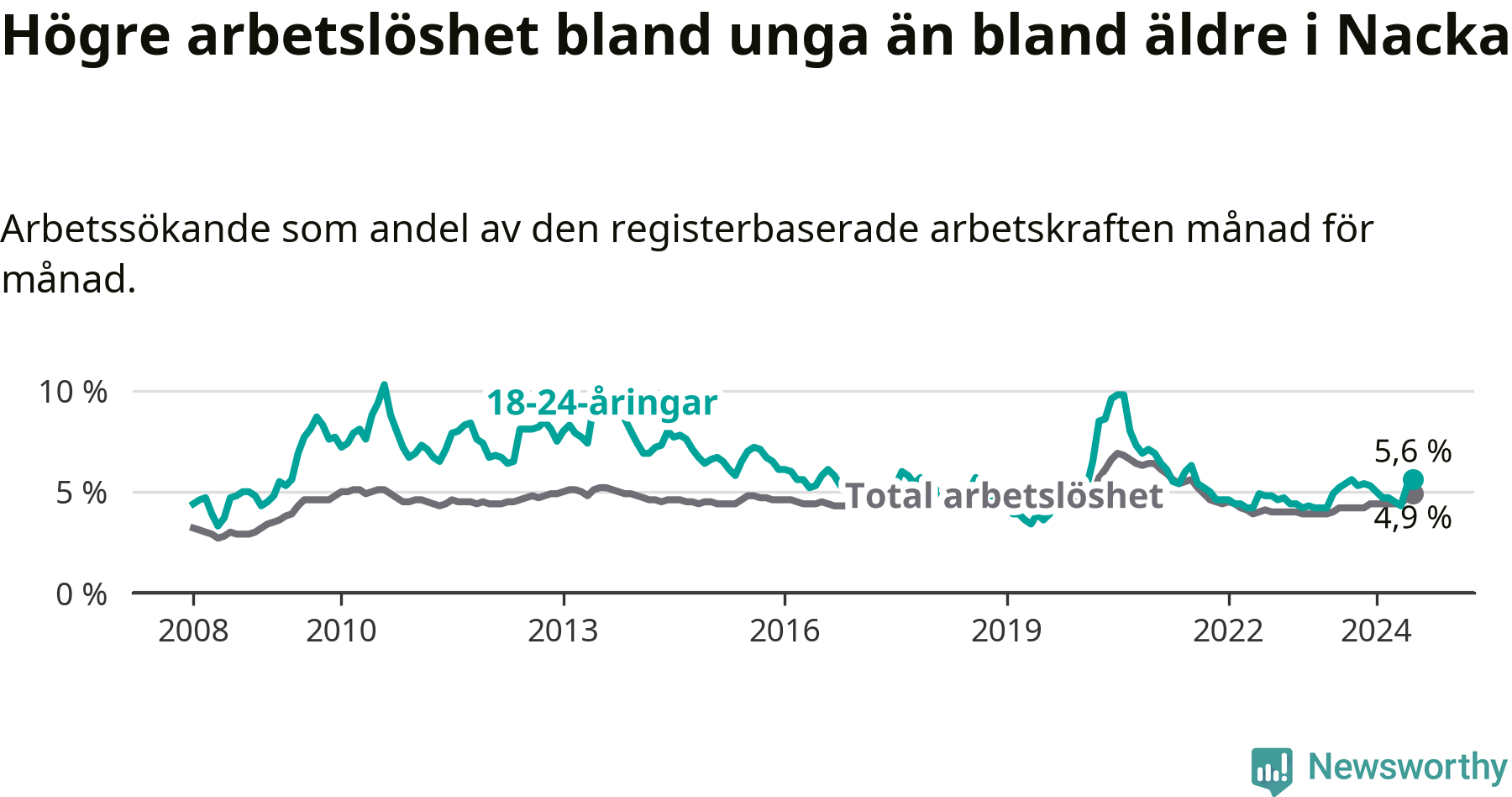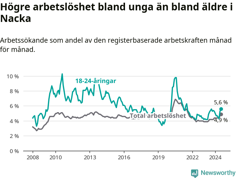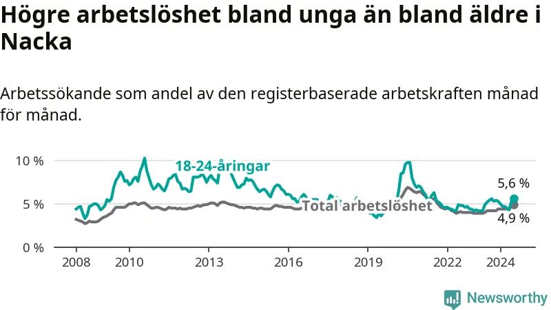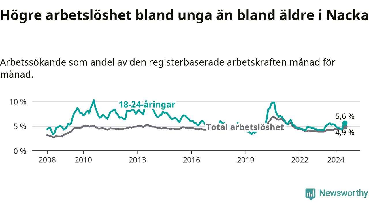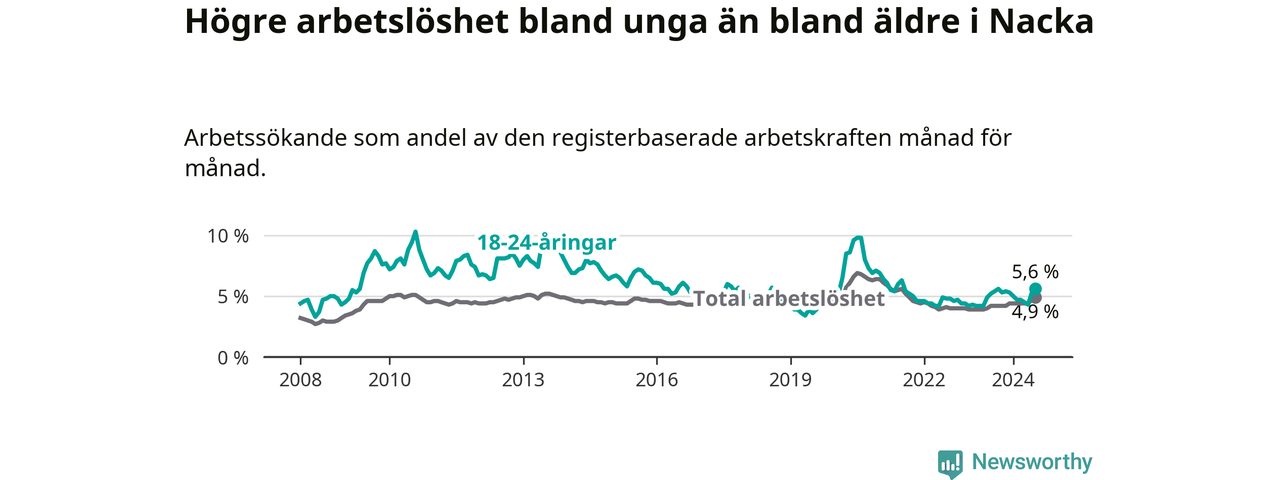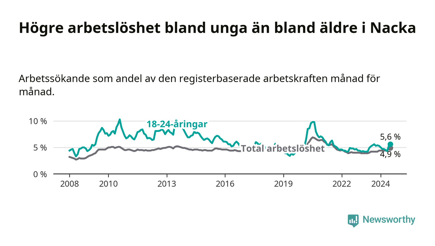 I och med den senaste månadens uppgång har de ungas arbetslöshet i Nacka stigit 13 månader i följd (upp från 4,9 procent i juni 2023 till 5,6 procent nu).
