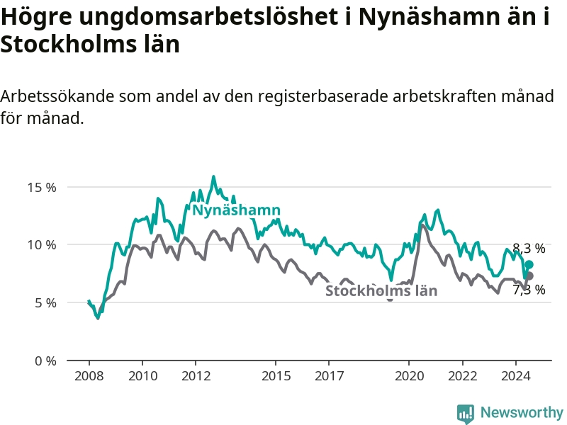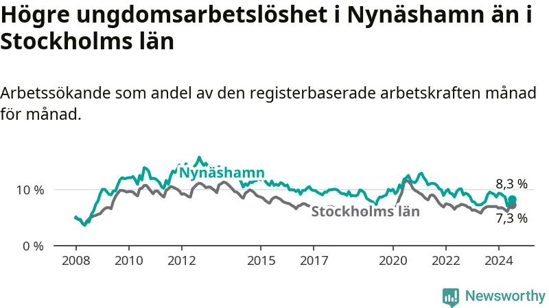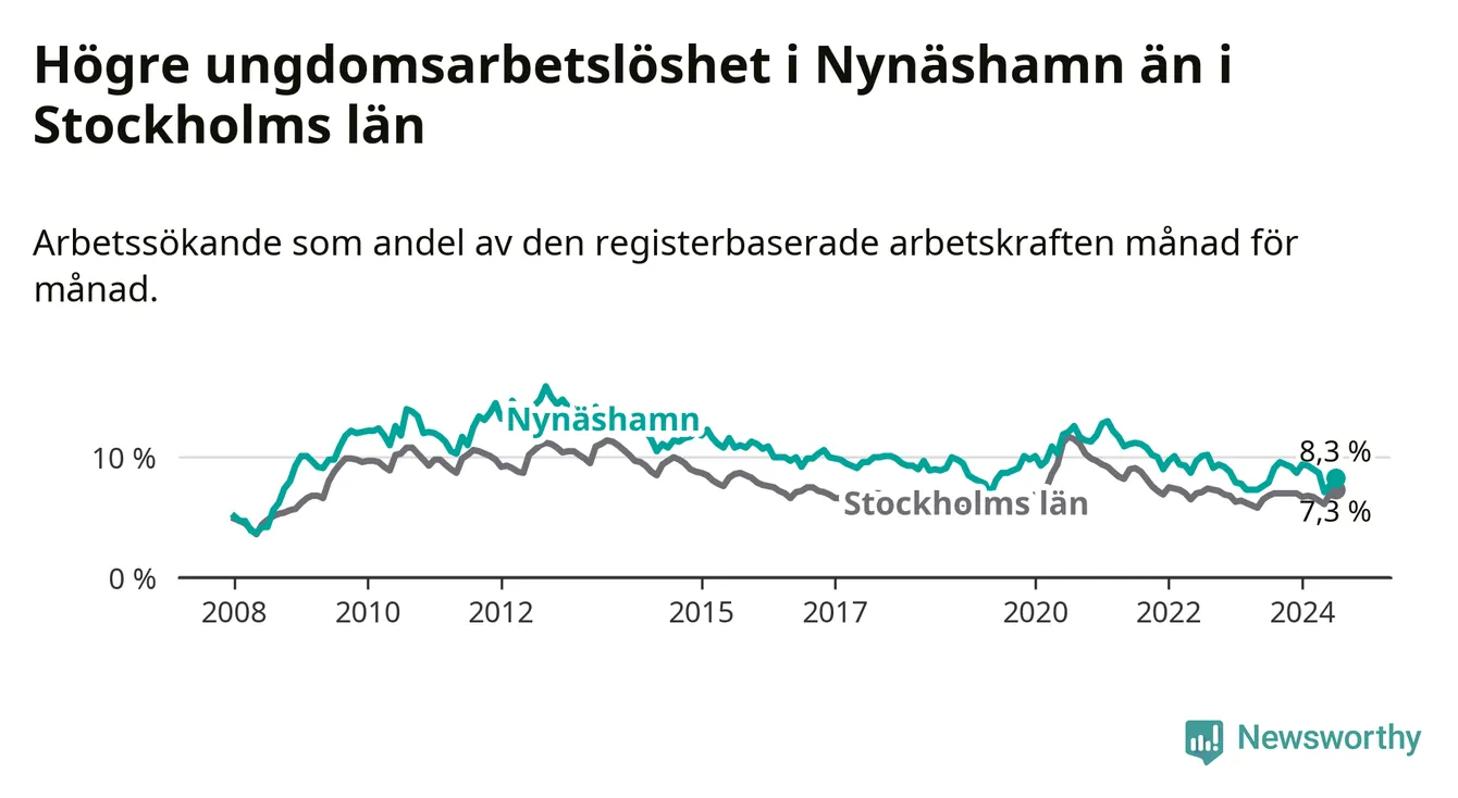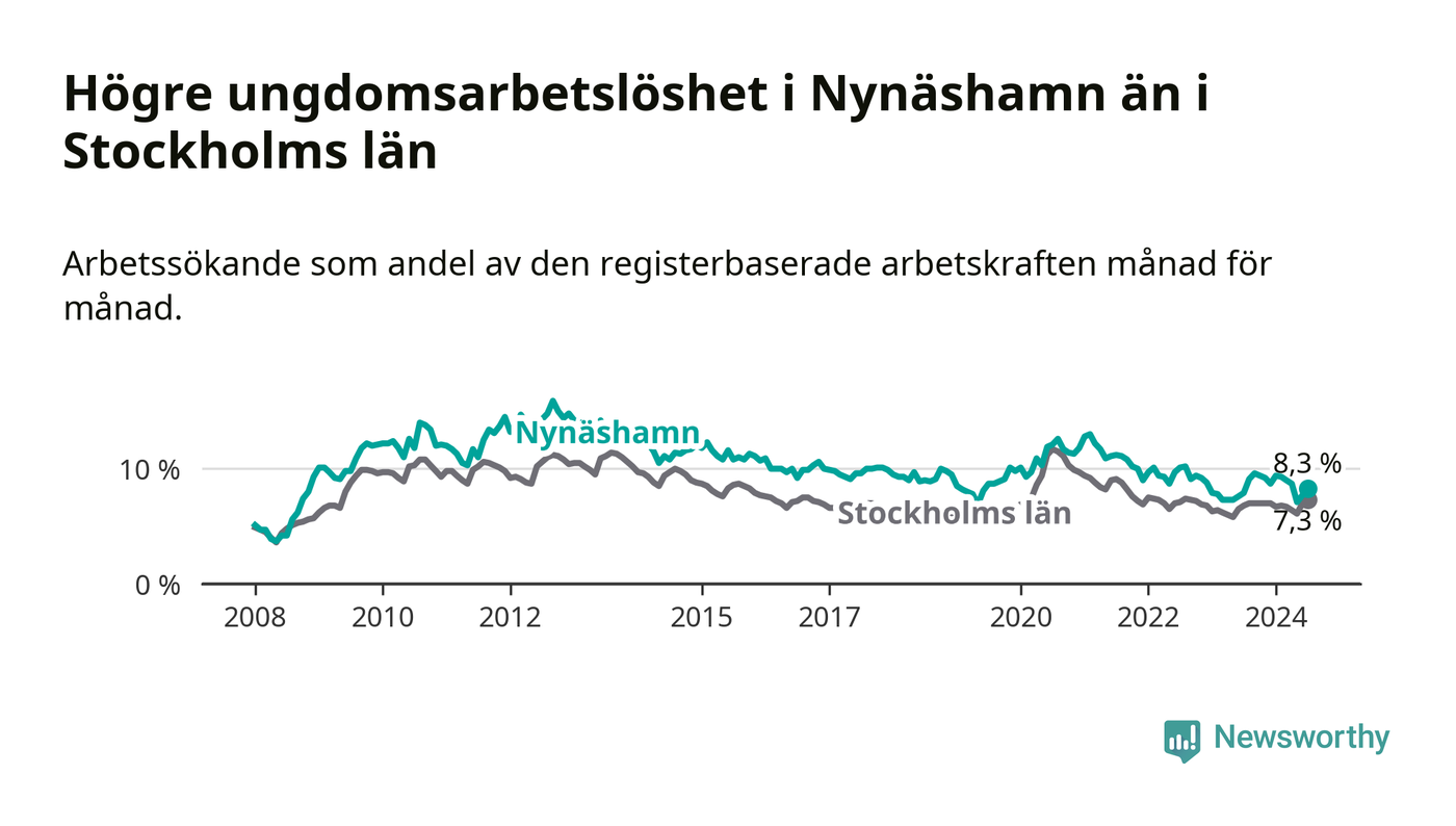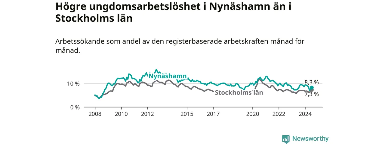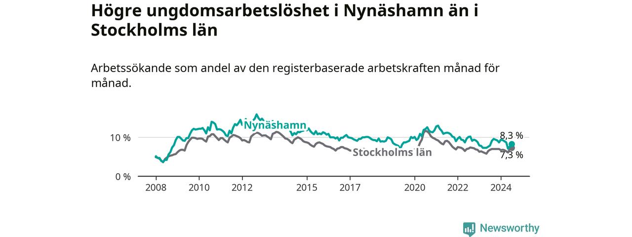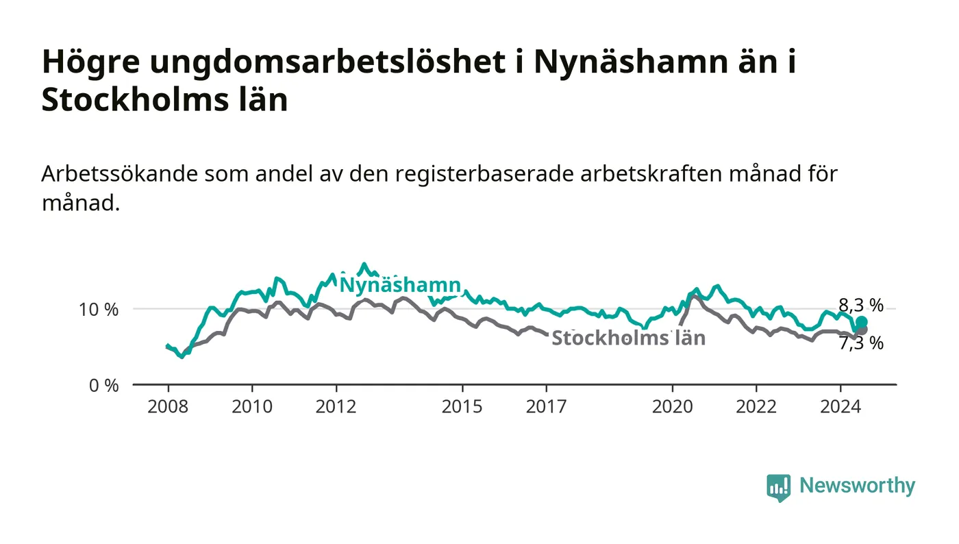 Medan Nynäshamn har ungefär samma total arbetslöshet som Stockholms län, ligger ungdomsarbetslösheten 1,0 procentenheter högre i Nynäshamn.
