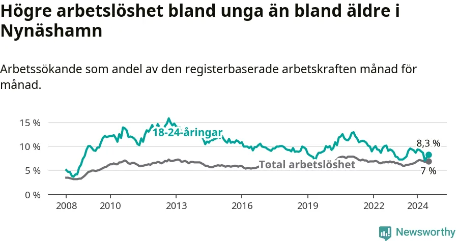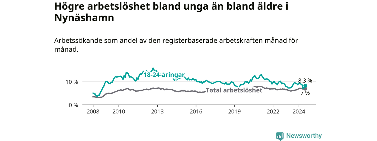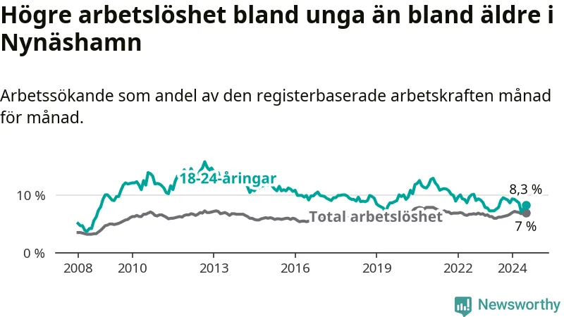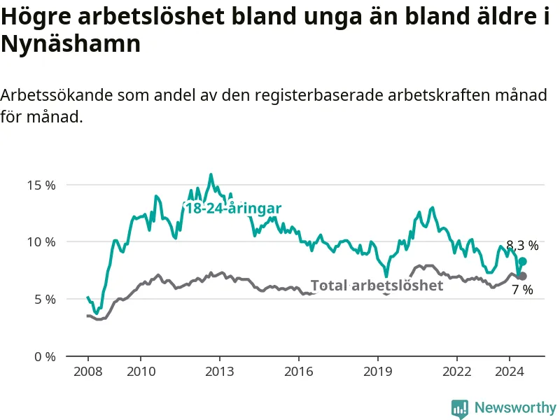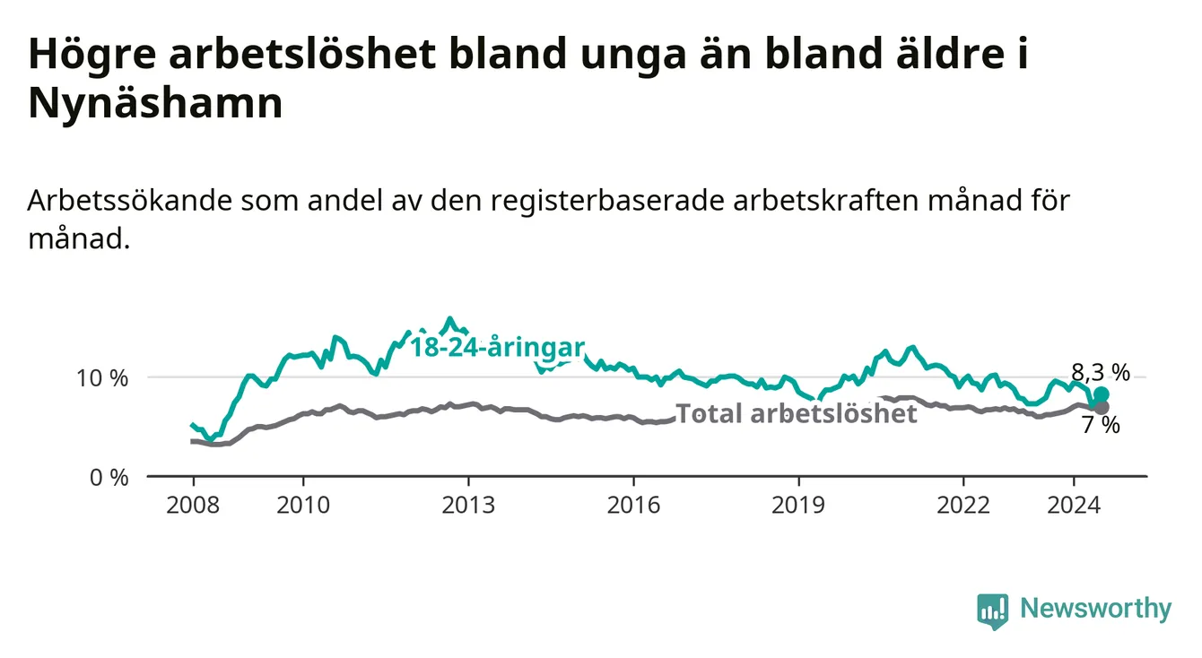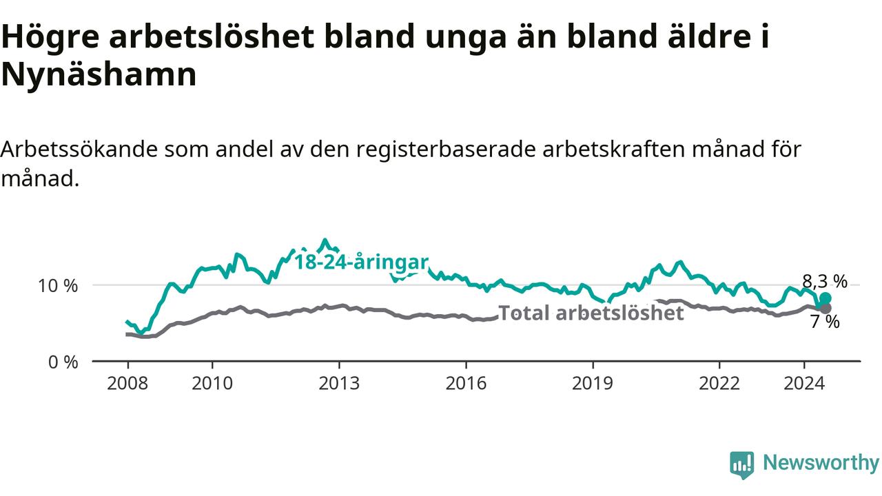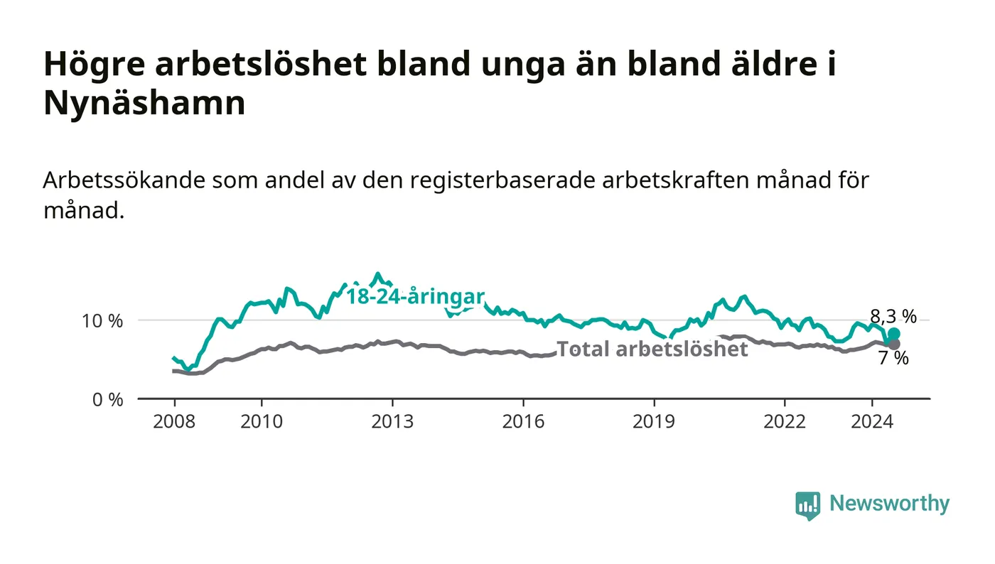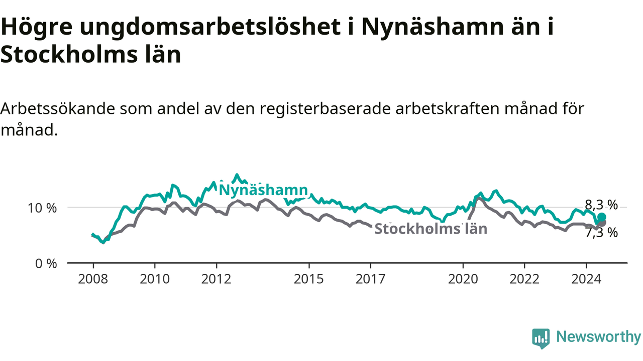Medan Nynäshamn har ungefär samma total arbetslöshet som Stockholms län, ligger ungdomsarbetslösheten 1,0 procentenheter högre i Nynäshamn.