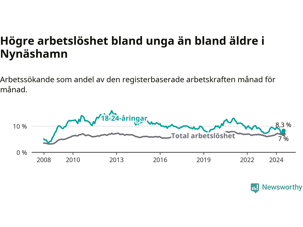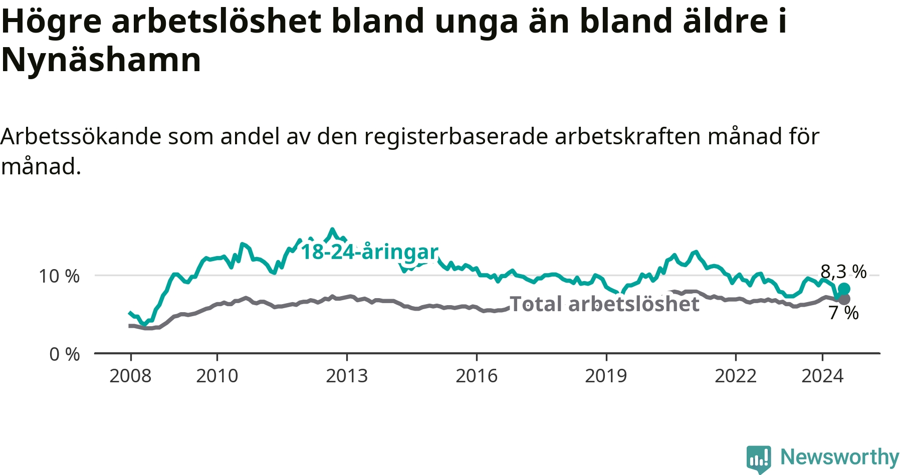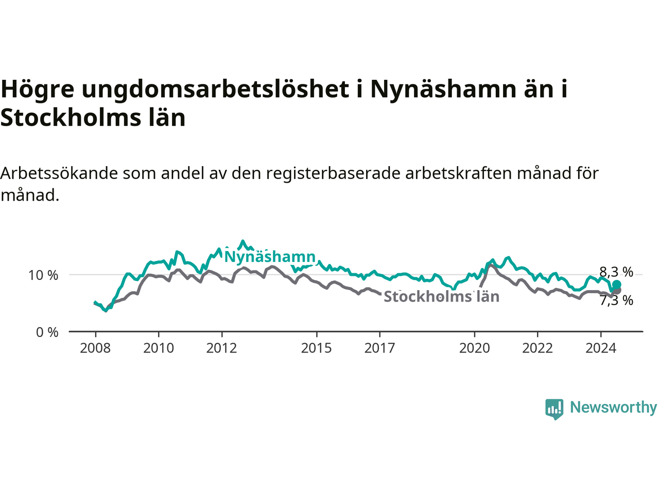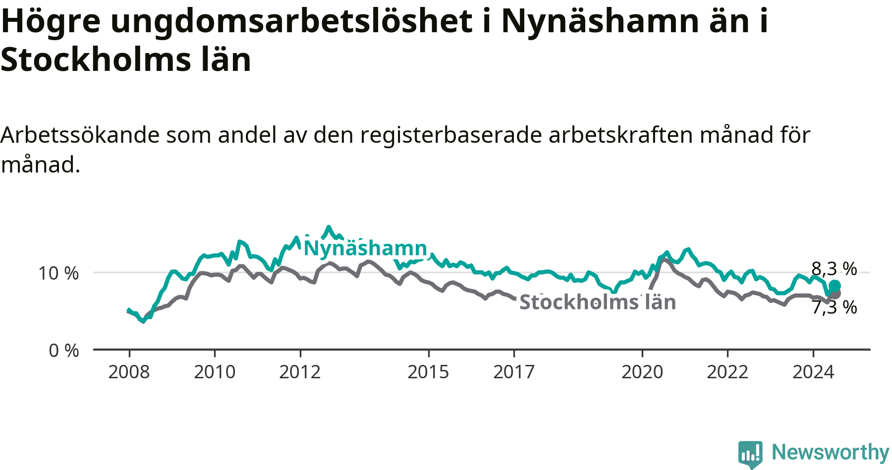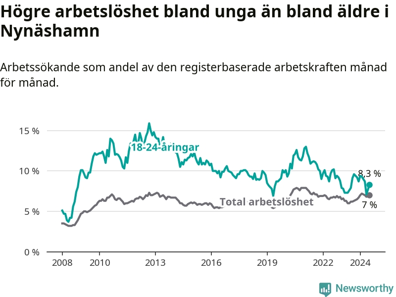 Medan Nynäshamn har ungefär samma total arbetslöshet som Stockholms län, ligger ungdomsarbetslösheten 1,0 procentenheter högre i Nynäshamn.