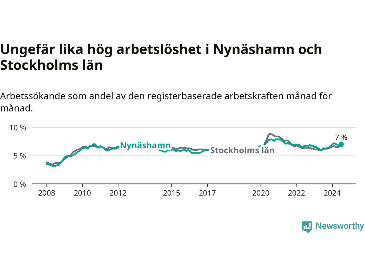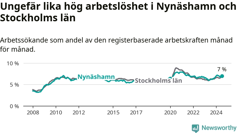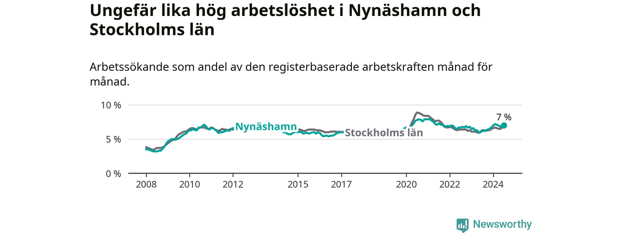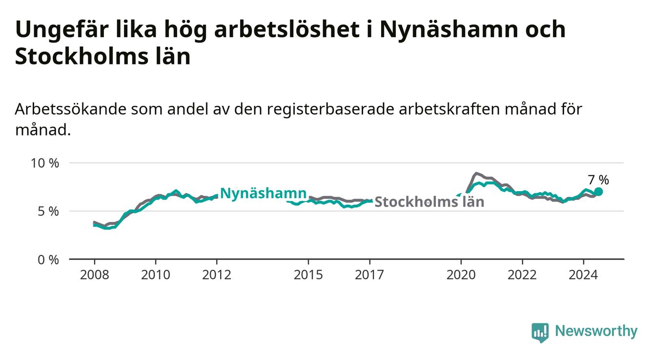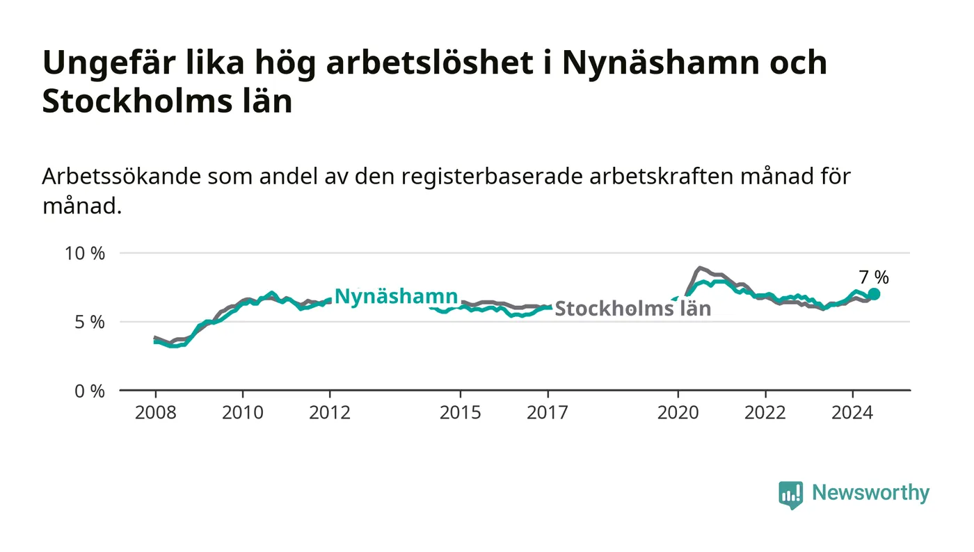Den ökande arbetslösheten gör att Nynäshamn nu har i stort sett samma arbetslöshetsnivå som hela Stockholms län. Ekerö har den lägsta arbetslösheten i länet (3,5 procent), medan Södertälje har den högsta (11,0 procent). För att Nynäshamn skulle komma ner i samma arbetslöshetsnivå som Ekerö skulle 506 personer behöva sysselsättas.