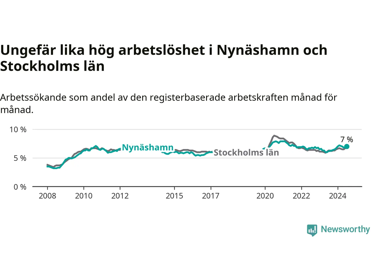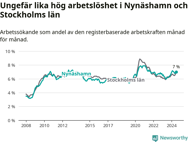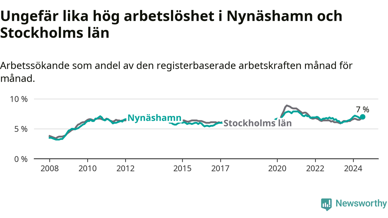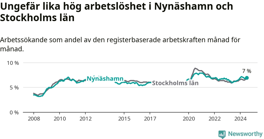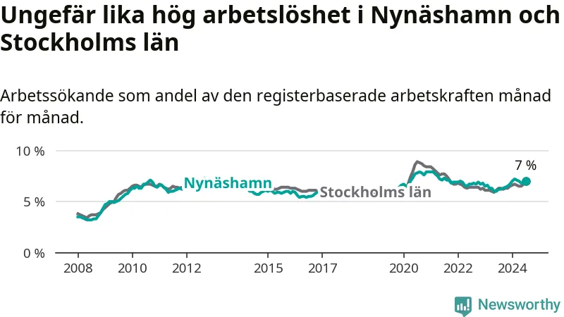 Under juli månad rapporterade Nynäshamns kommun en total arbetslöshet på 7,0 procent. Det är en ökning jämfört med samma tidpunkt i fjol (+0,8 procentenheter). Även i Stockholms län stiger arbetslösheten .