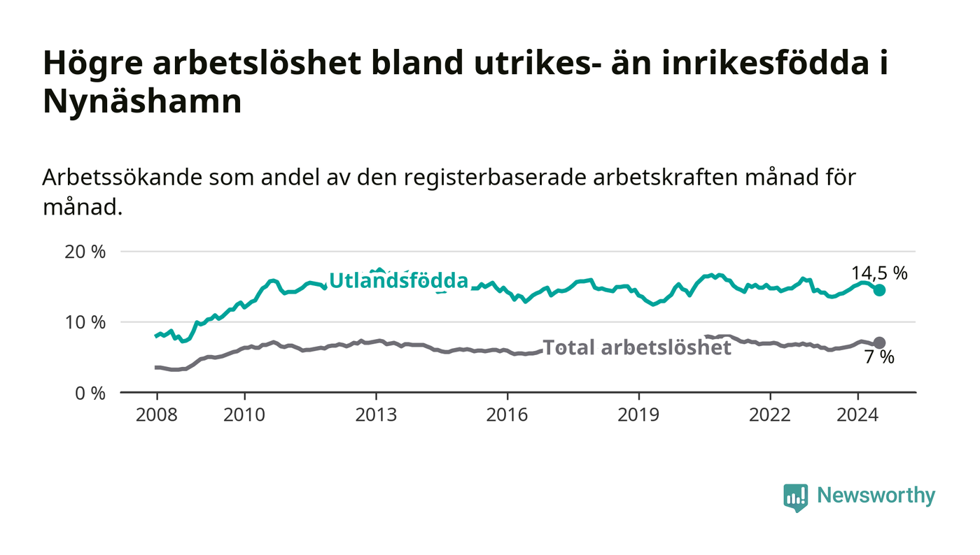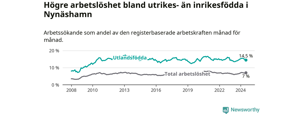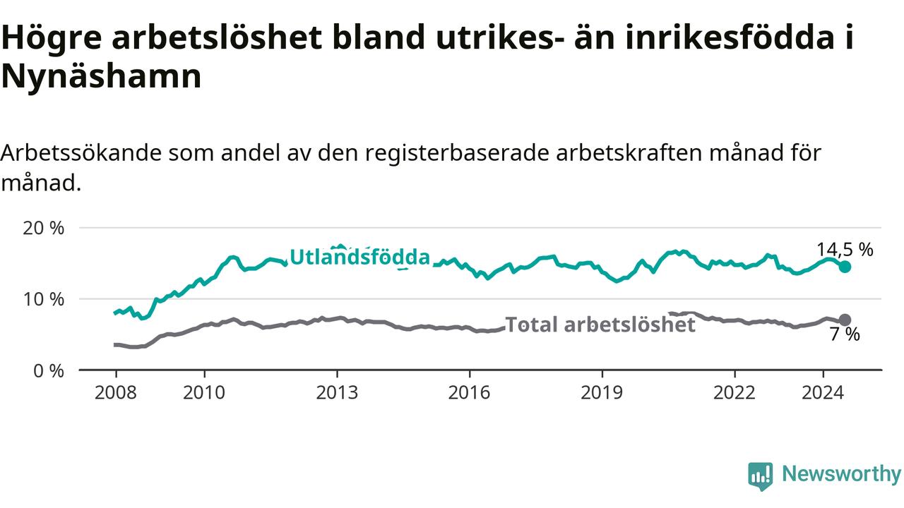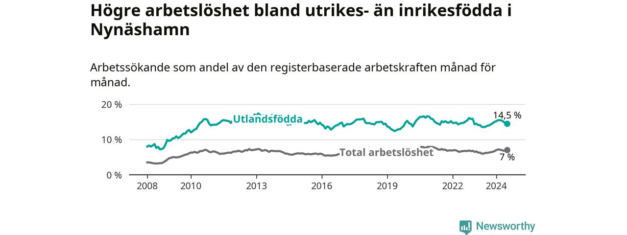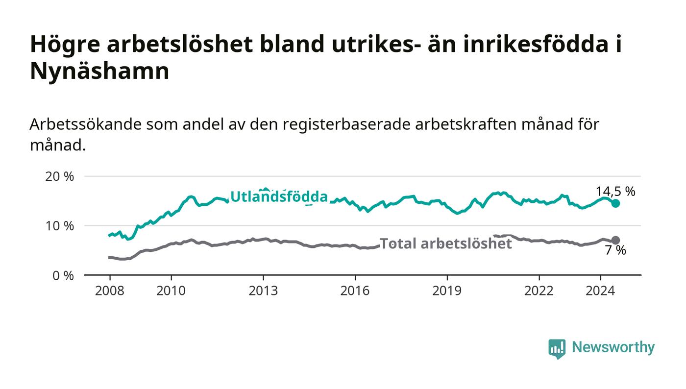 Arbetslösheten bland utlandsfödda var 14,5 procent i Nynäshamn under juli månad, motsvarande 548 av 3 779 personer. Det är 0,9 procentenheter fler än vid samma tidpunkt i fjol (−343 om man räknar personer). Därmed är de utlandsföddas arbetslöshet högre än vid samma tidpunkt i fjol för sjunde månaden i följd.