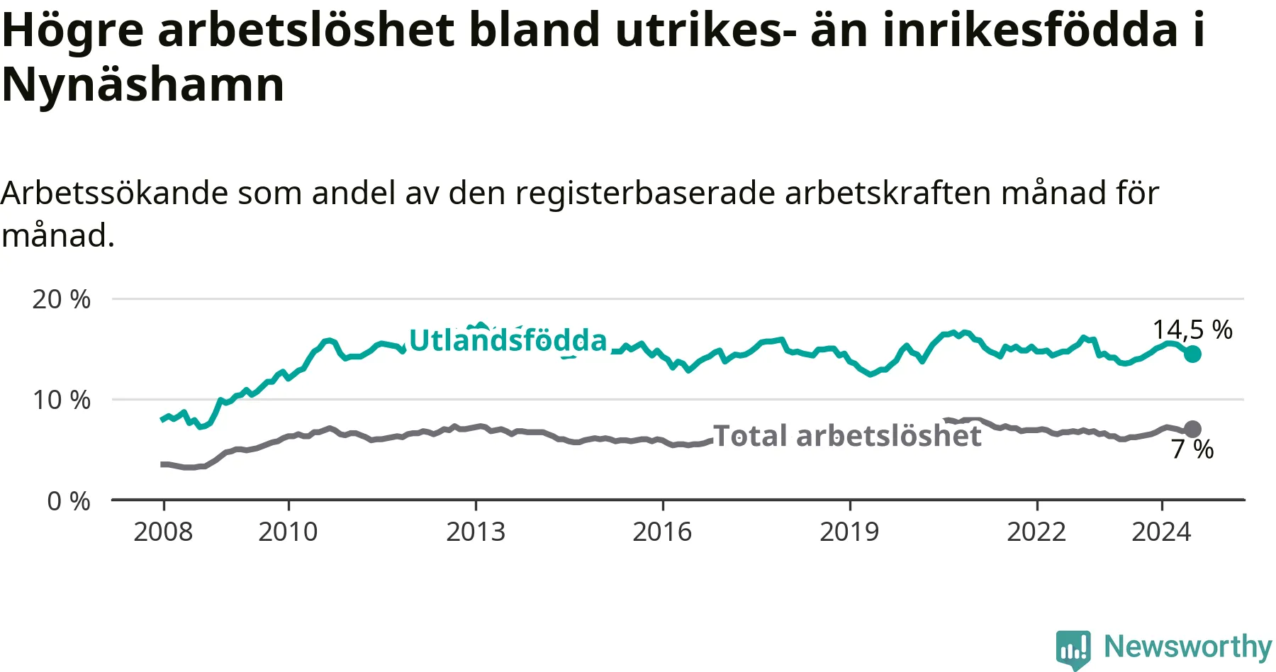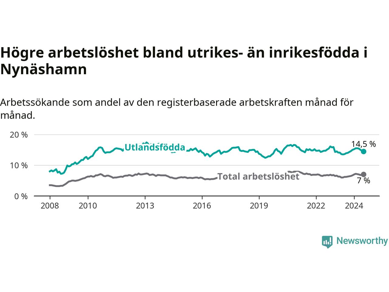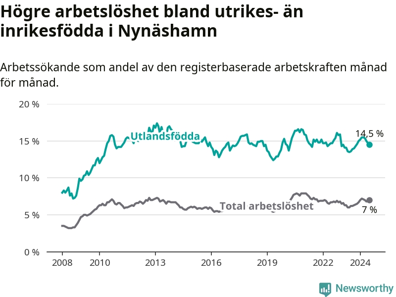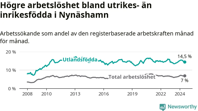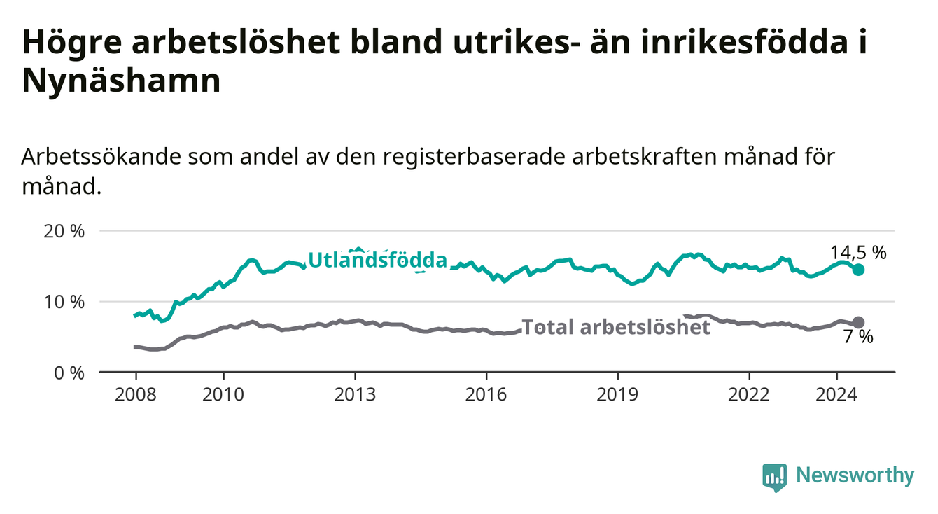 Arbetslösheten bland utlandsfödda var 14,5 procent i Nynäshamn under juli månad, motsvarande 548 av 3 779 personer. Det är 0,9 procentenheter fler än vid samma tidpunkt i fjol (−343 om man räknar personer). Därmed är de utlandsföddas arbetslöshet högre än vid samma tidpunkt i fjol för sjunde månaden i följd.