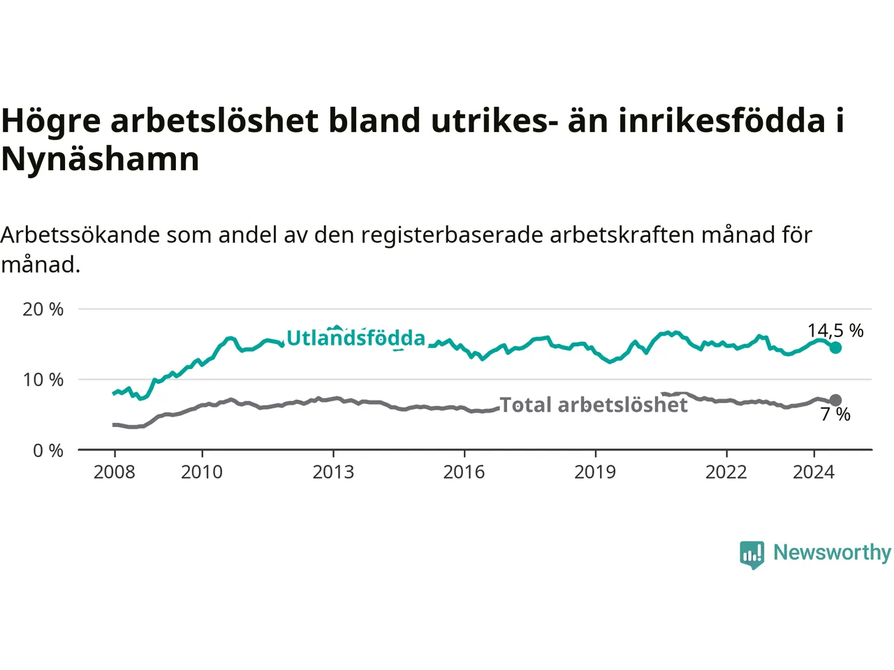 Skillnaden i arbetslöshet mellan utrikesfödda och hela befolkningen är 7,5 procentenheter i Nynäshamn.