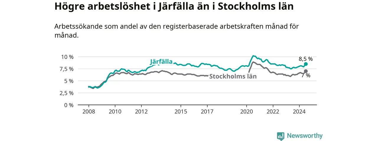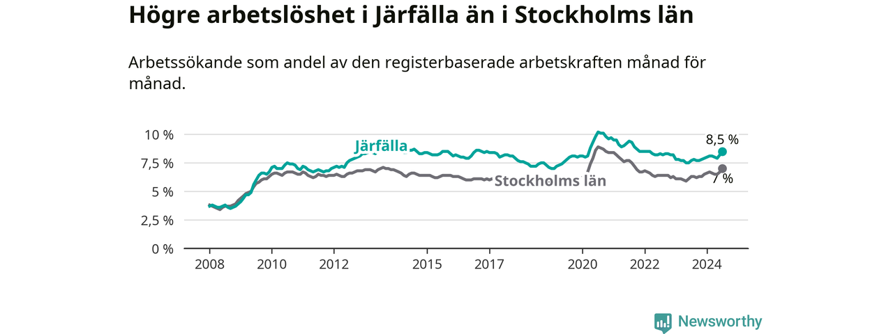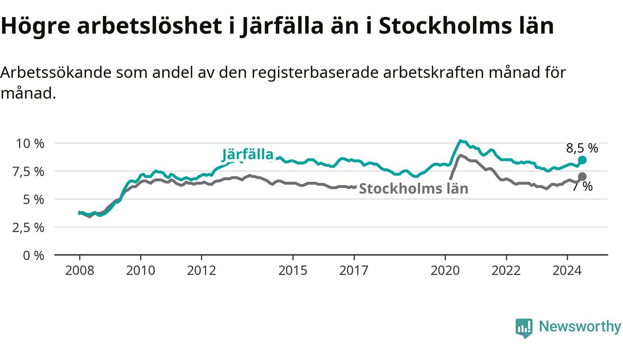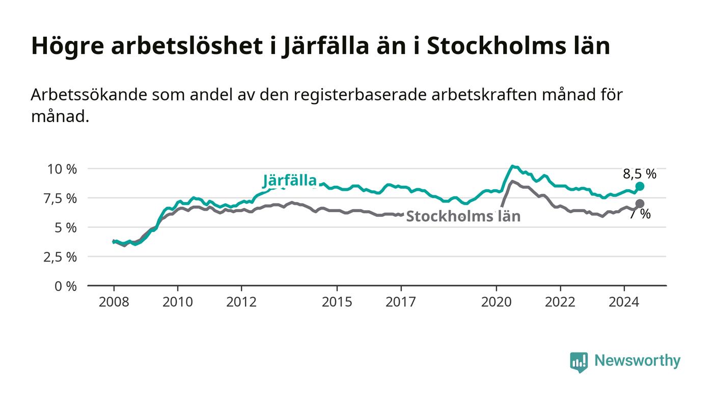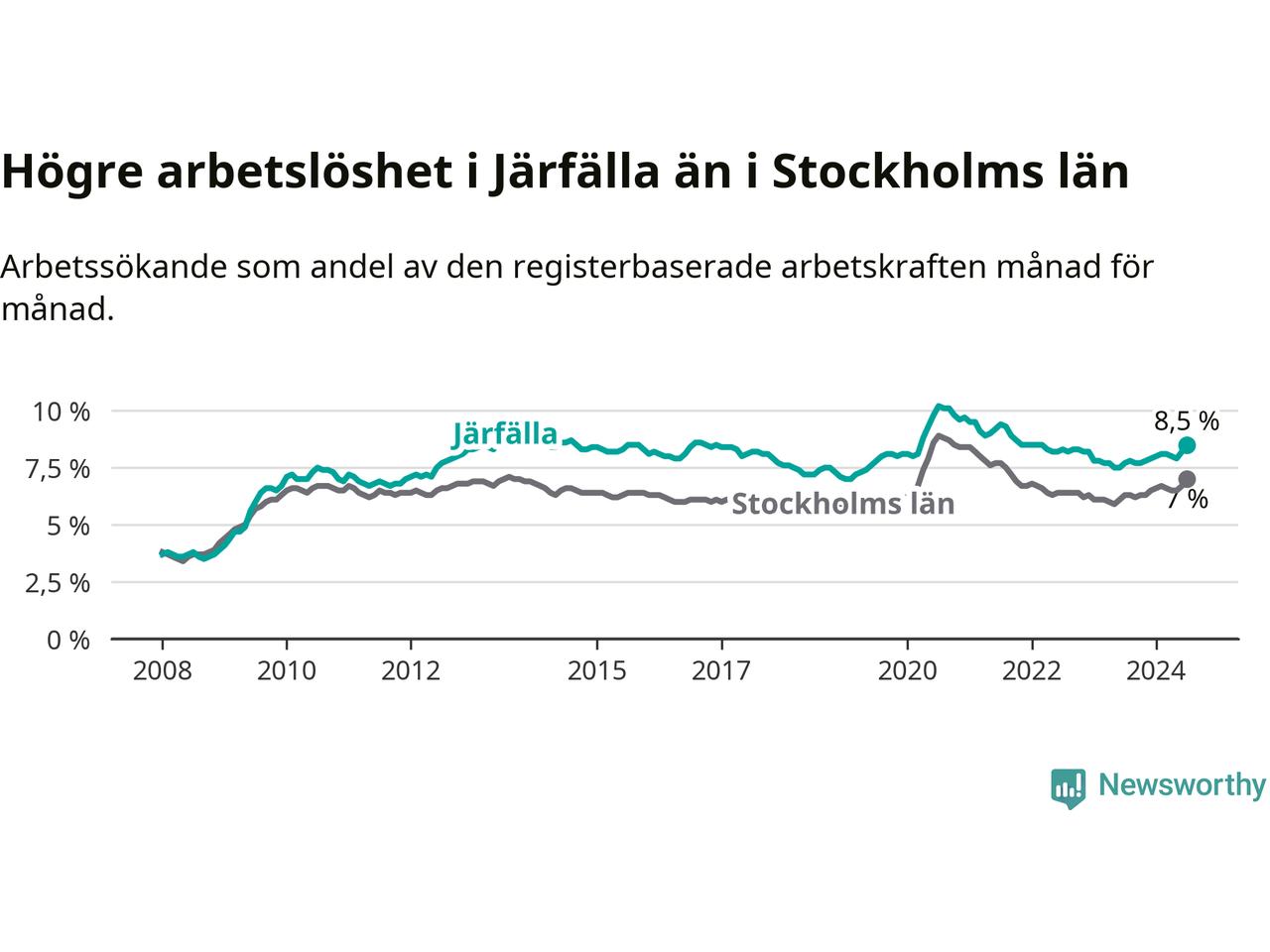 Järfälla hade redan tidigare högre arbetslöshet än snittet i hela Stockholms län och nu växer klyftan (8,5 procent i kommunen, jämfört med 7,0 procent i hela länet). Ekerö har den lägsta arbetslösheten i länet (3,5 procent), medan Södertälje har den högsta (11,0 procent). För att Järfälla skulle komma ner i samma arbetslöshetsnivå som Ekerö skulle 2 259 personer behöva sysselsättas.
