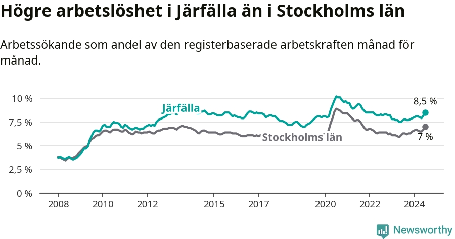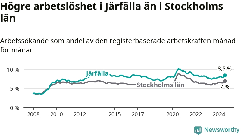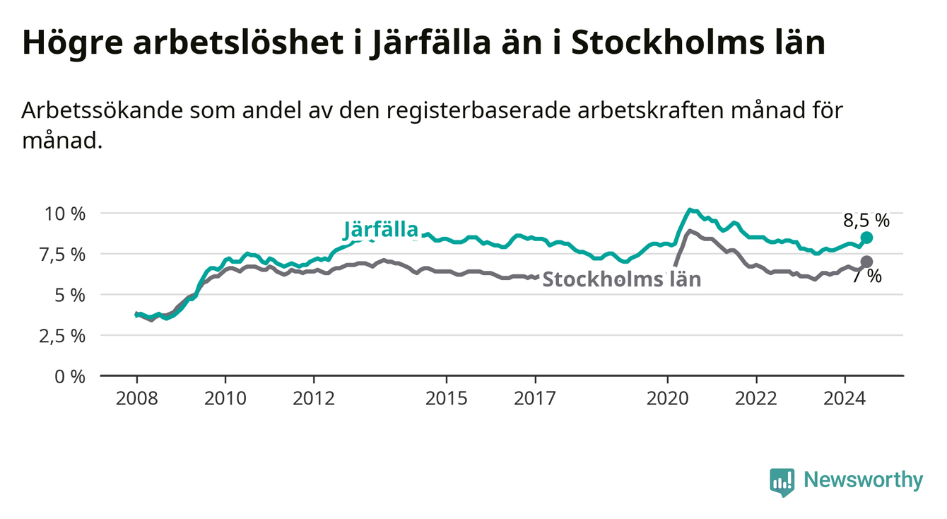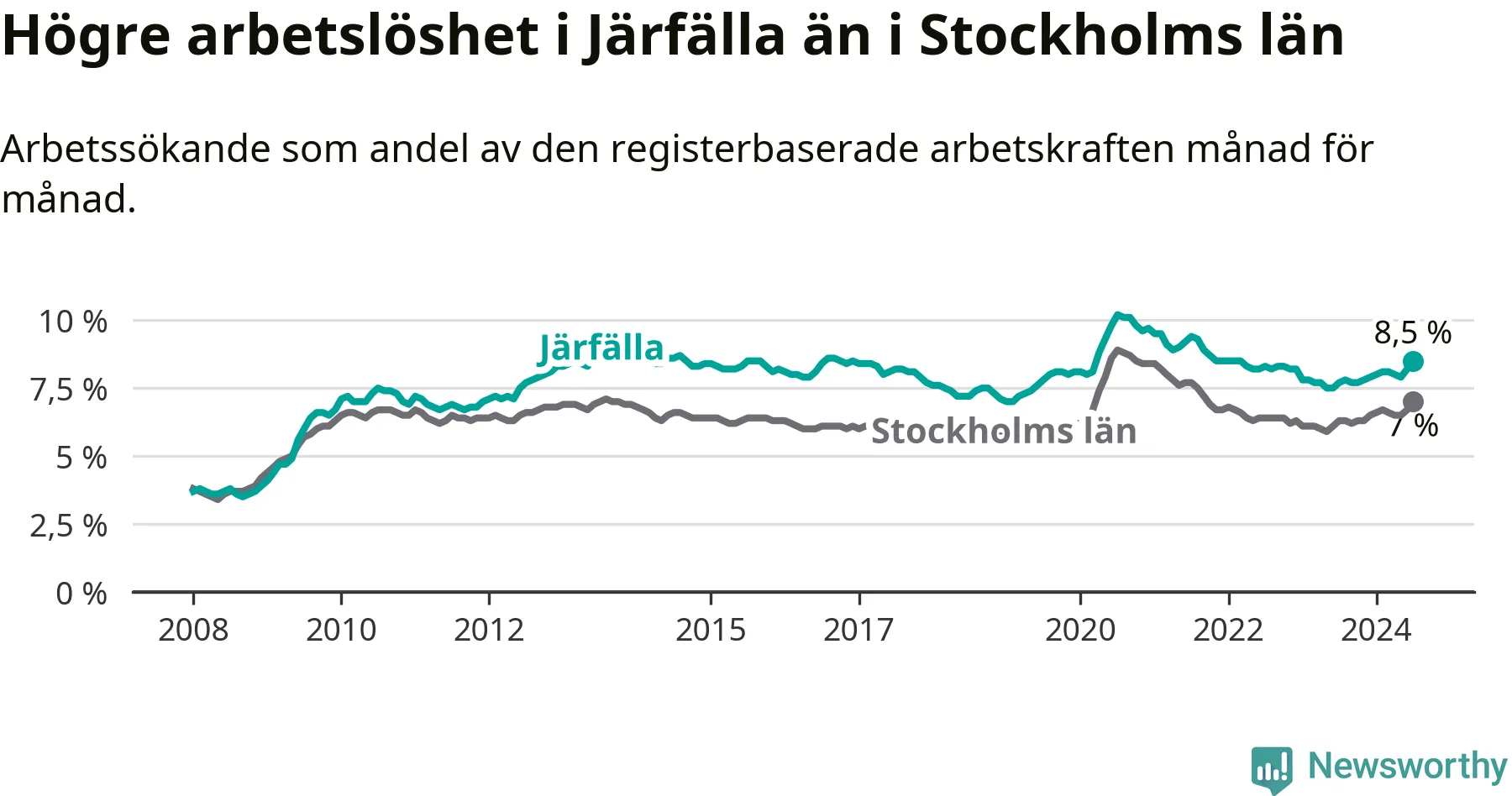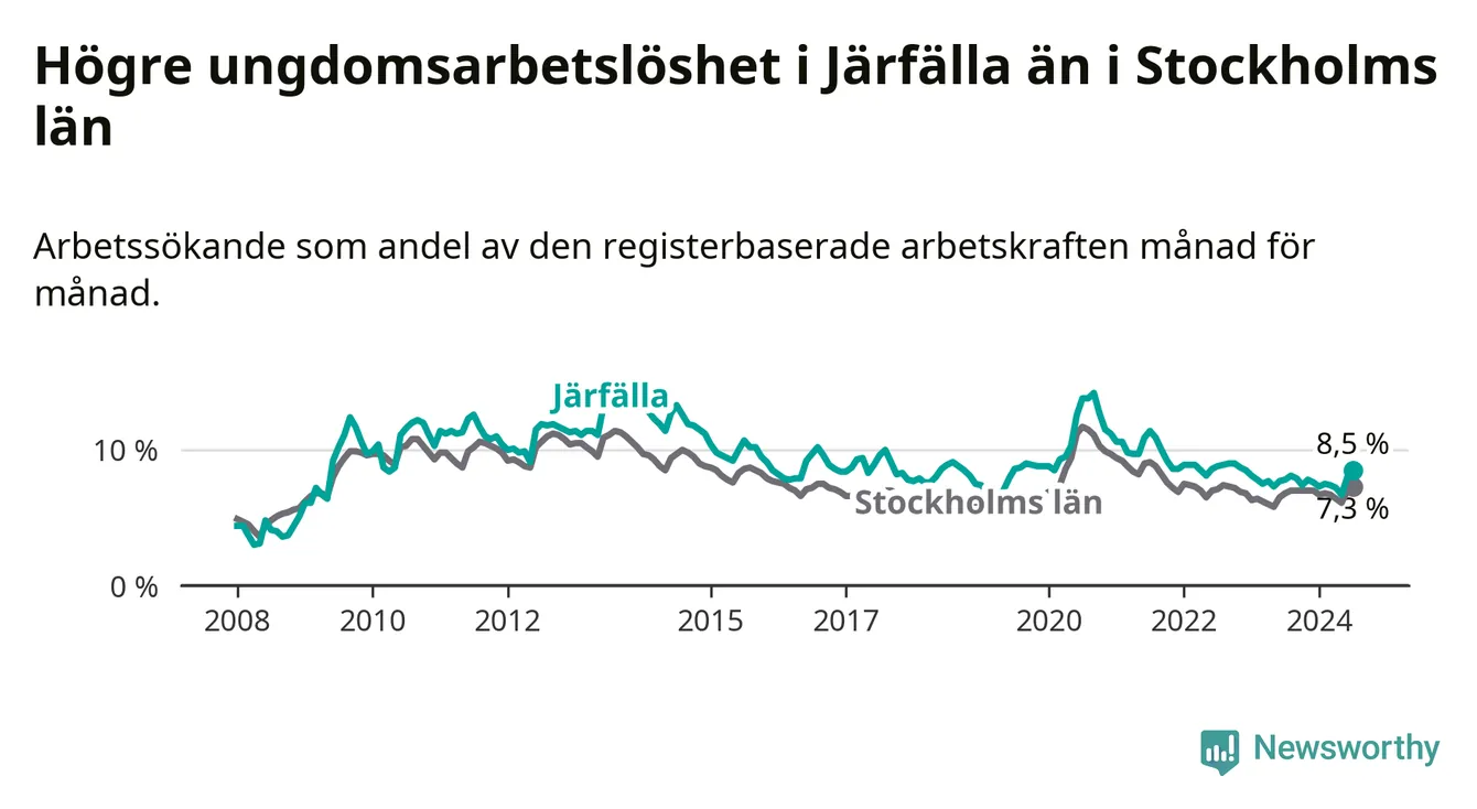 Järfälla hade redan tidigare högre arbetslöshet än snittet i hela Stockholms län och nu växer klyftan (8,5 procent i kommunen, jämfört med 7,0 procent i hela länet). Ekerö har den lägsta arbetslösheten i länet (3,5 procent), medan Södertälje har den högsta (11,0 procent). För att Järfälla skulle komma ner i samma arbetslöshetsnivå som Ekerö skulle 2 259 personer behöva sysselsättas.