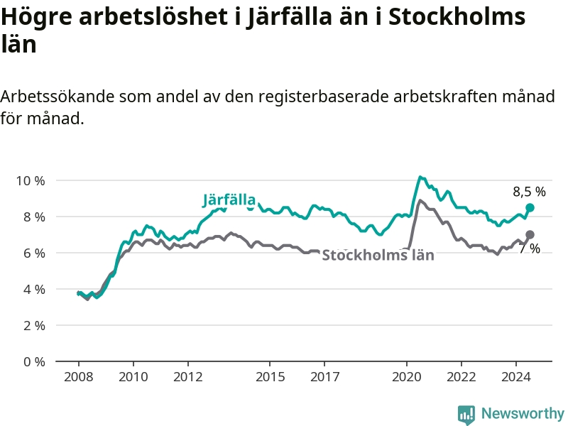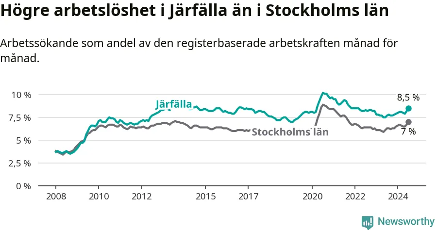 Under juli månad rapporterade Järfälla kommun en total arbetslöshet på 8,5 procent. Det är en ökning jämfört med samma tidpunkt i fjol (+0,8 procentenheter). Även i Stockholms län stiger arbetslösheten .