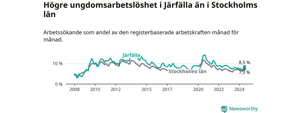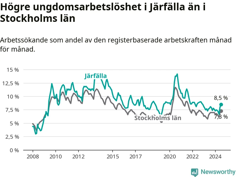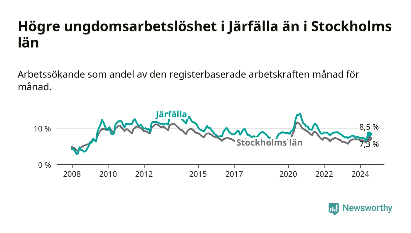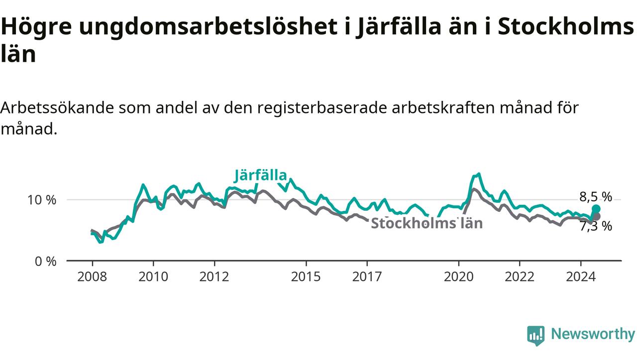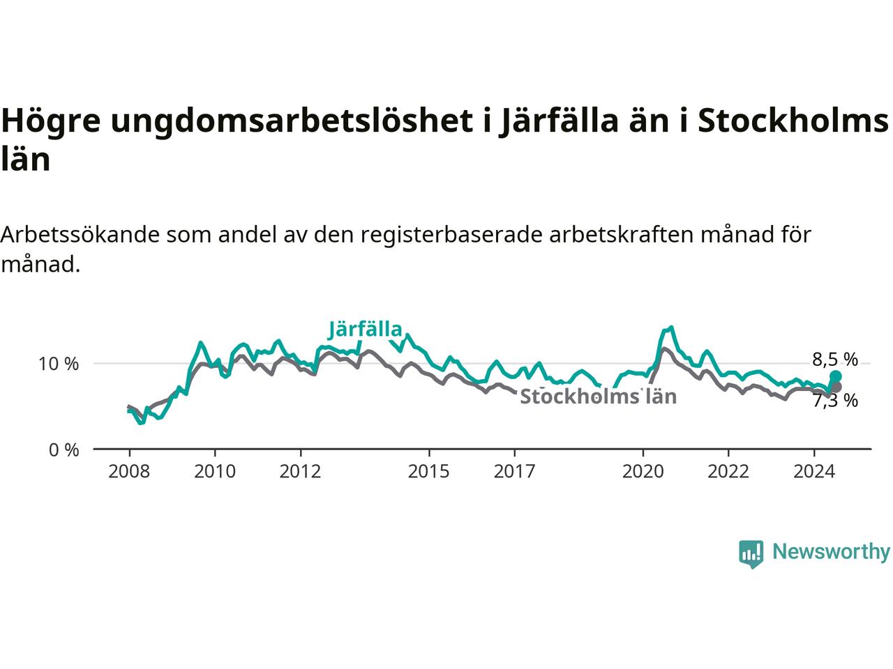 Precis som den totala arbetslösheten ligger ungdomsarbetslösheten i Järfälla högre än i Stockholms län som helhet. Skillnaden mellan kommunen och länet är 1,2 procentenheter.