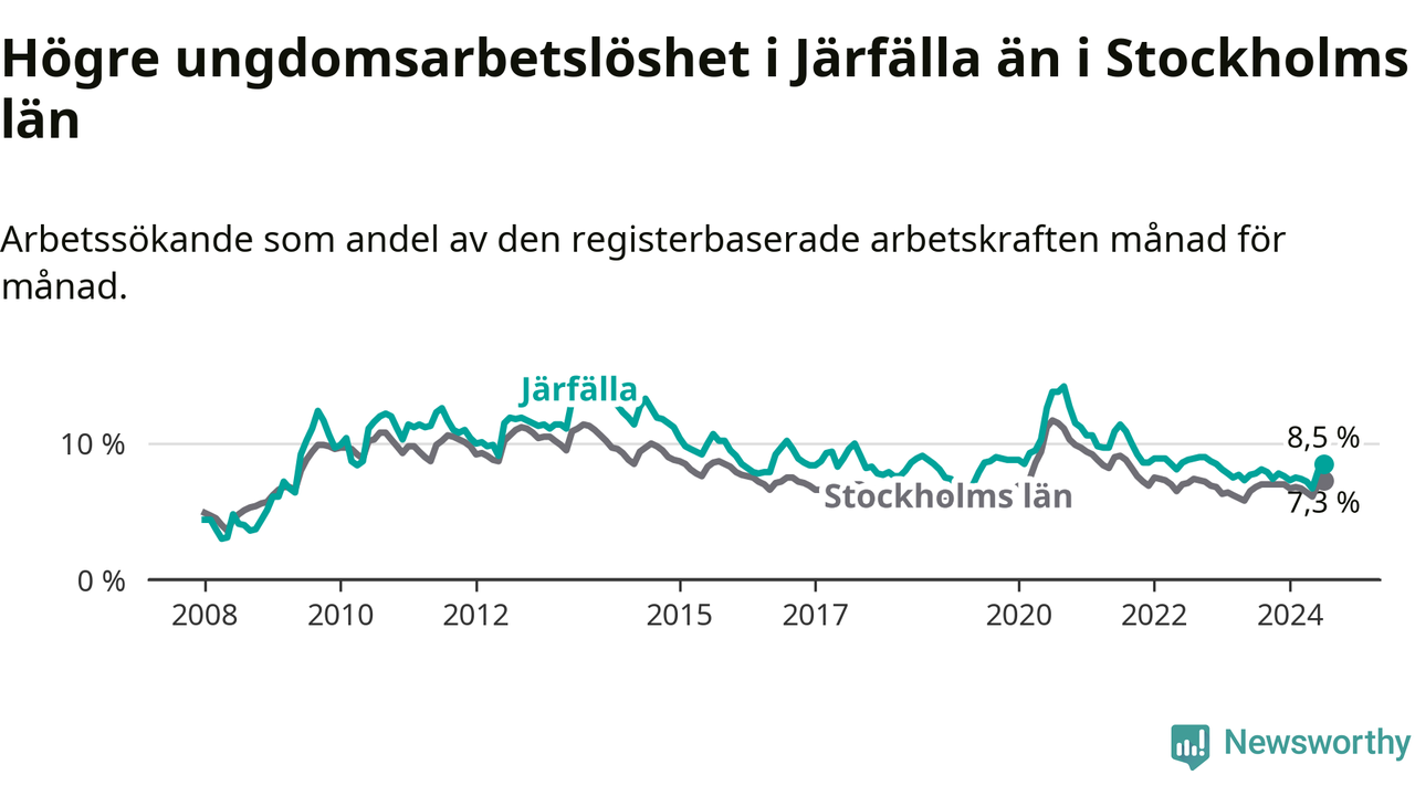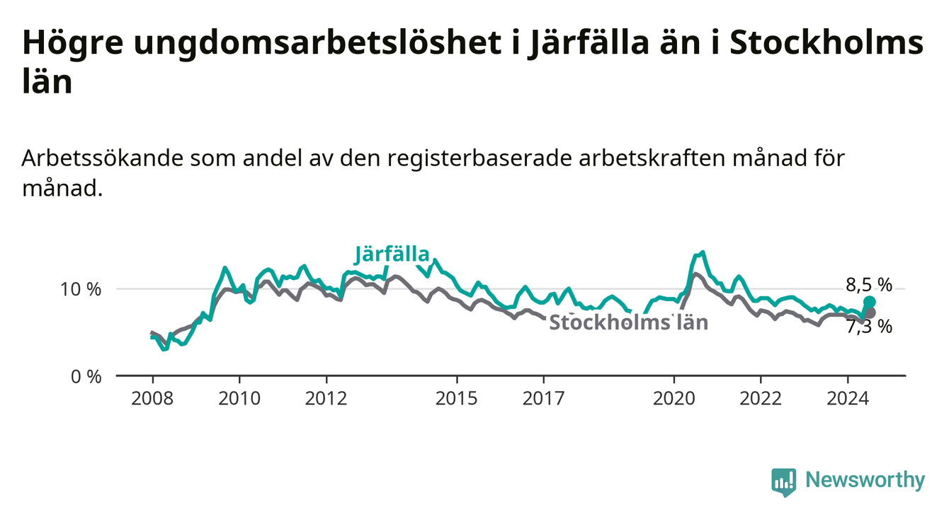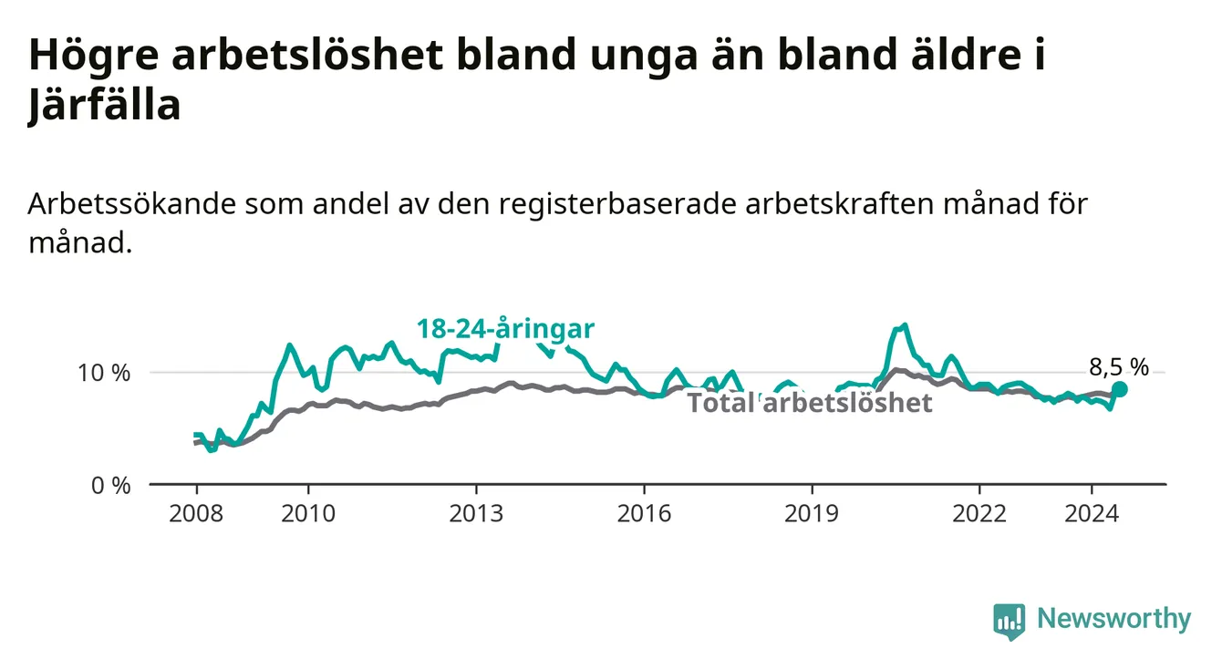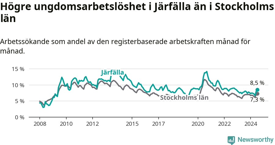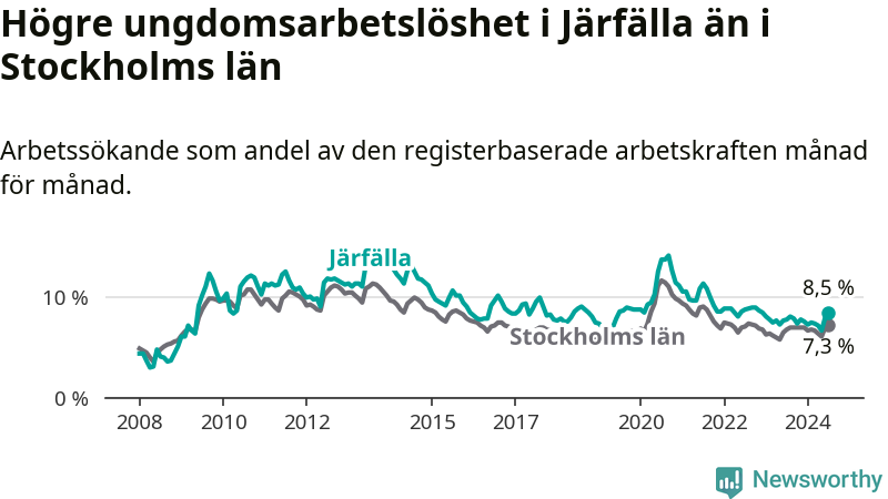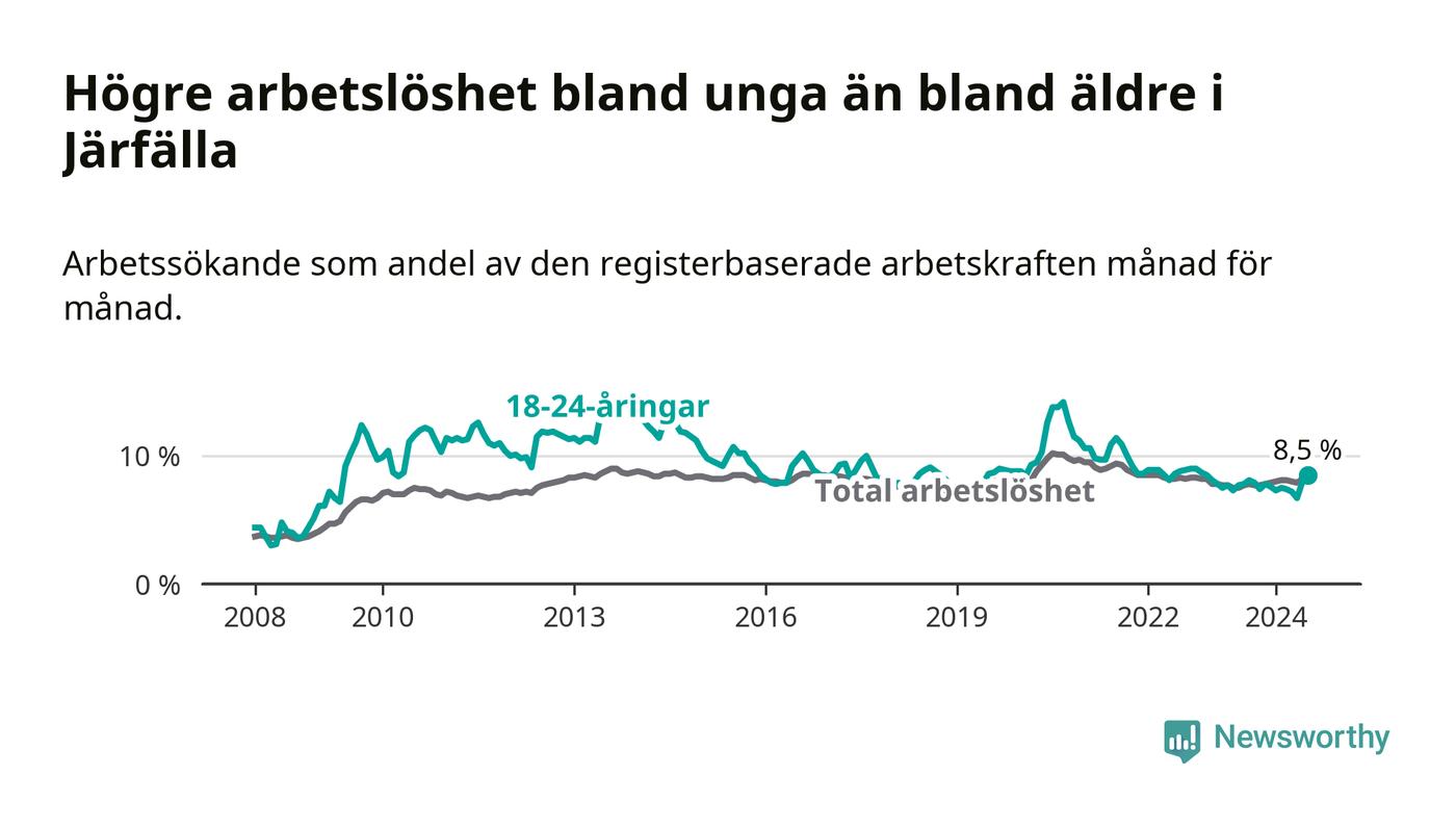 Precis som den totala arbetslösheten ligger ungdomsarbetslösheten i Järfälla högre än i Stockholms län som helhet. Skillnaden mellan kommunen och länet är 1,2 procentenheter.