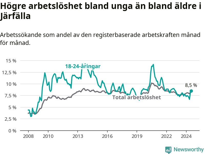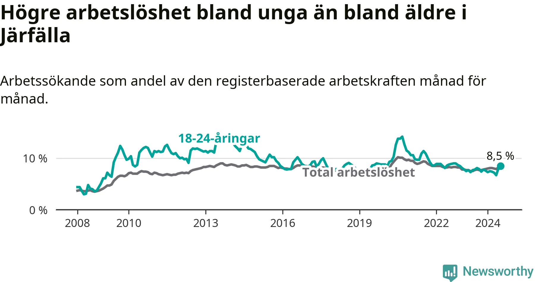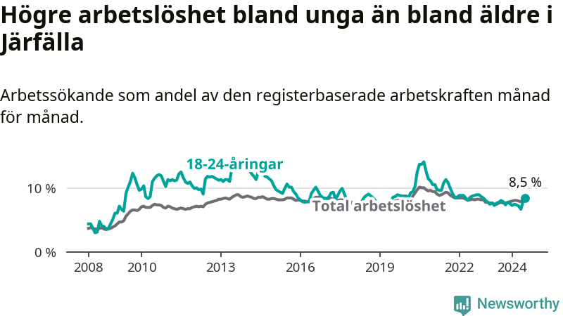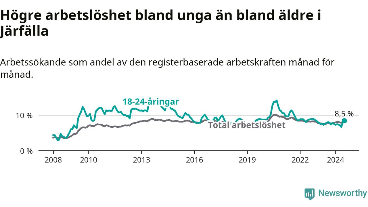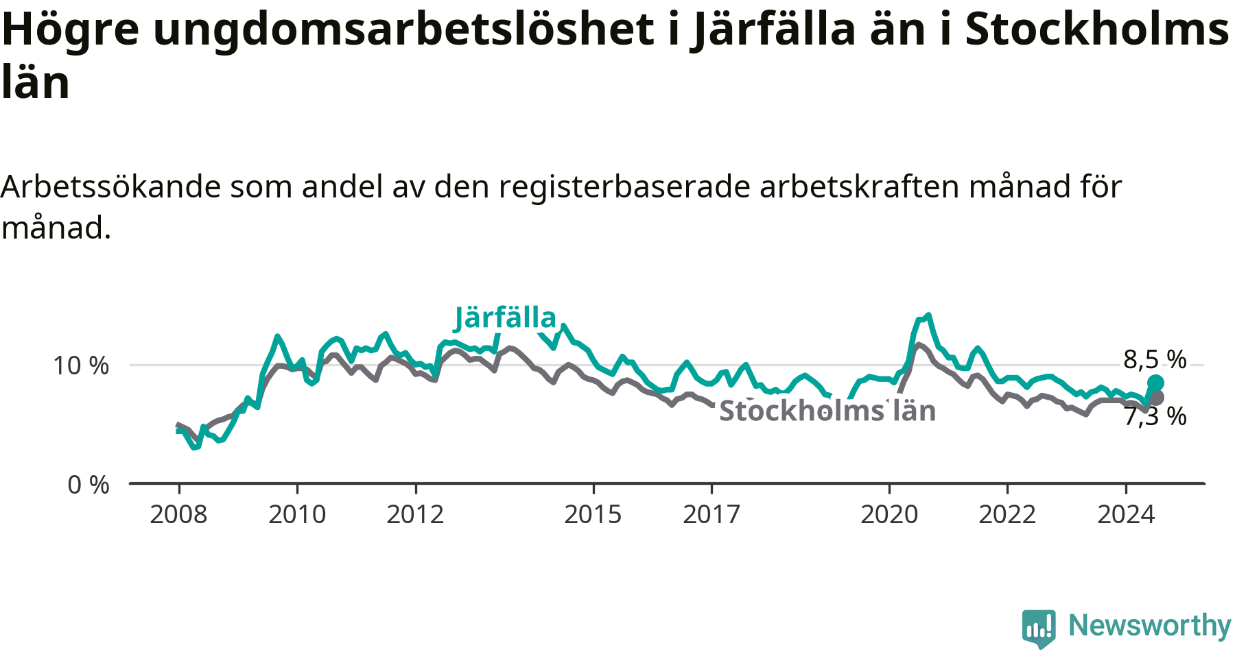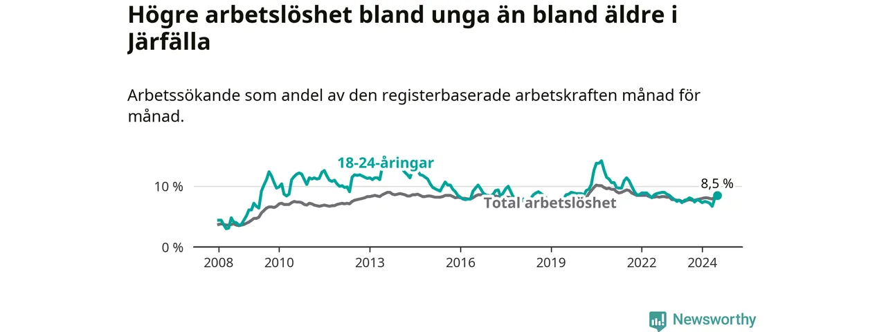 Precis som den totala arbetslösheten ligger ungdomsarbetslösheten i Järfälla högre än i Stockholms län som helhet. Skillnaden mellan kommunen och länet är 1,2 procentenheter.