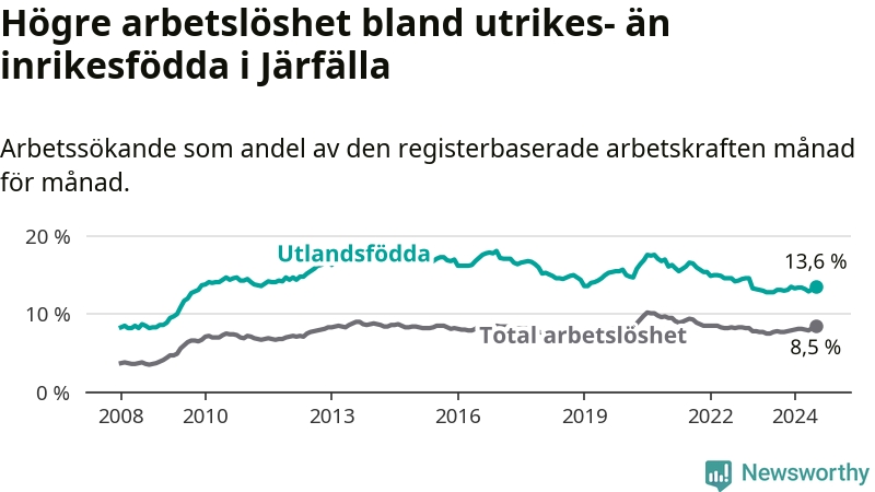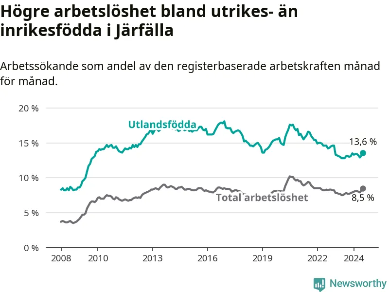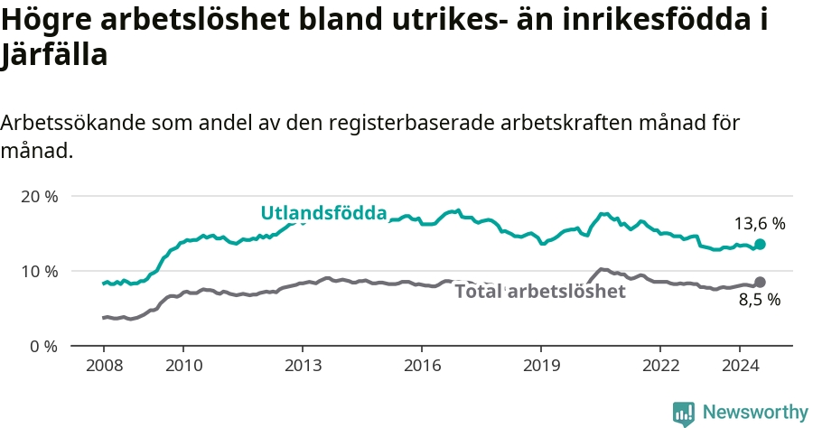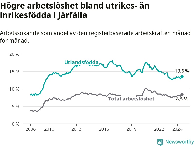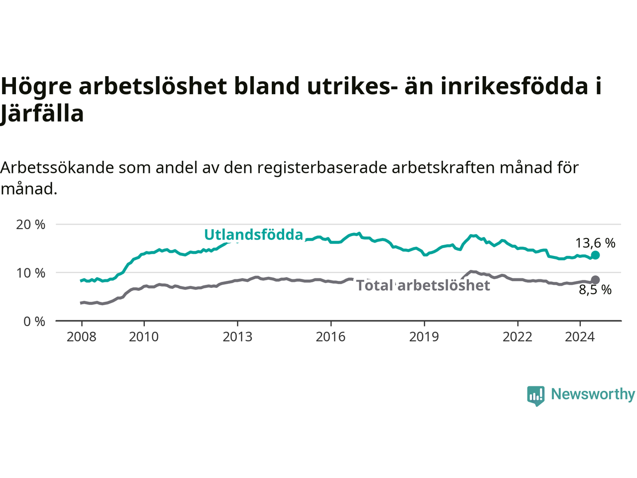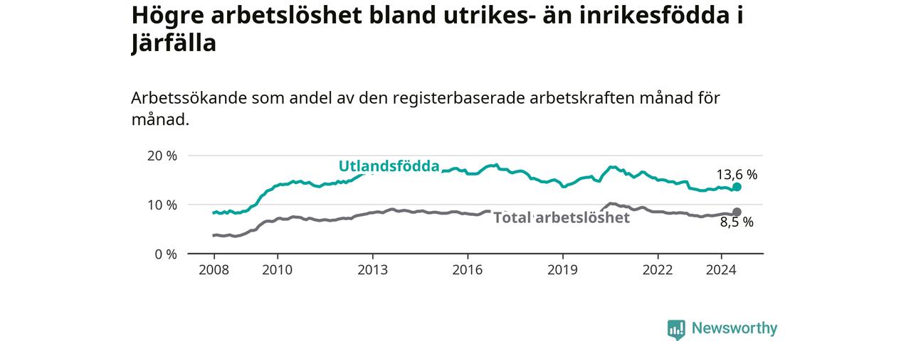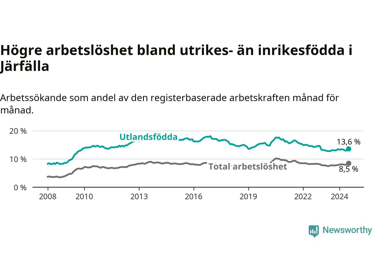 Arbetslösheten bland utlandsfödda var 13,6 procent i Järfälla under juli månad, motsvarande 2 698 av 19 838 personer. Det är 0,8 procentenheter fler än vid samma tidpunkt i fjol (−643 om man räknar personer). Därmed är de utlandsföddas arbetslöshet högre än vid samma tidpunkt i fjol för sjätte månaden i följd.