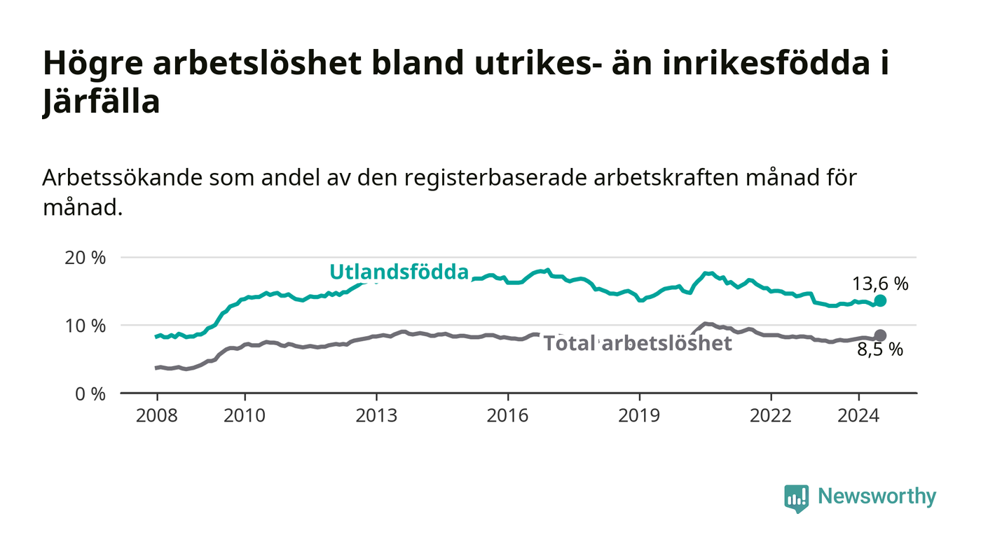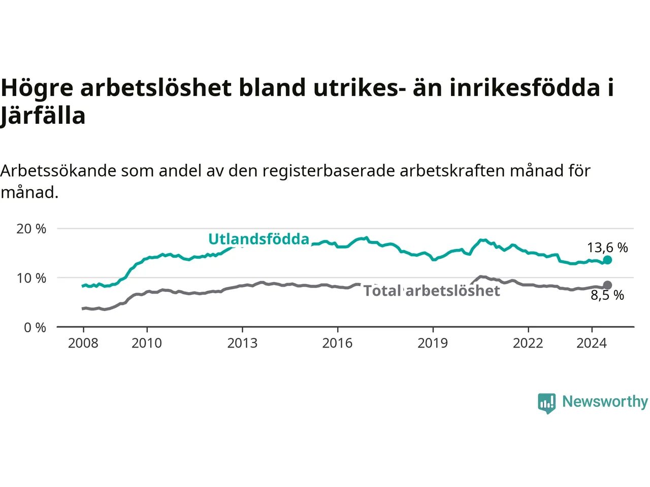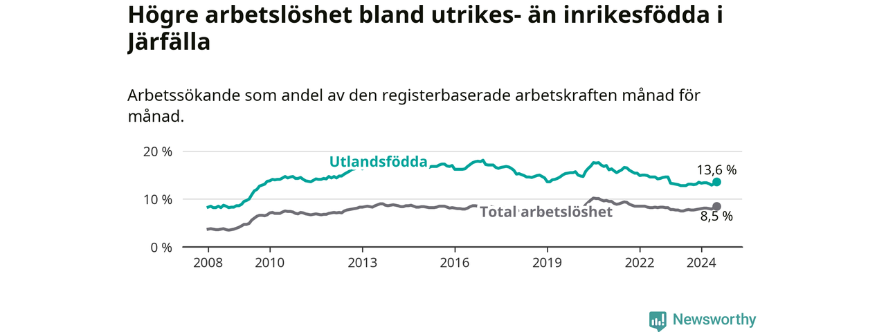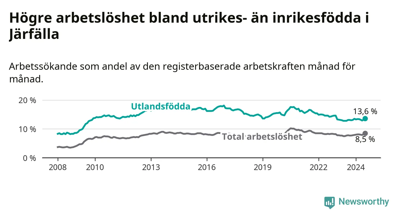 Skillnaden i arbetslöshet mellan utrikesfödda och hela befolkningen är 5,1 procentenheter i Järfälla. Det är ungefär samma skillnad som för ett år sedan.