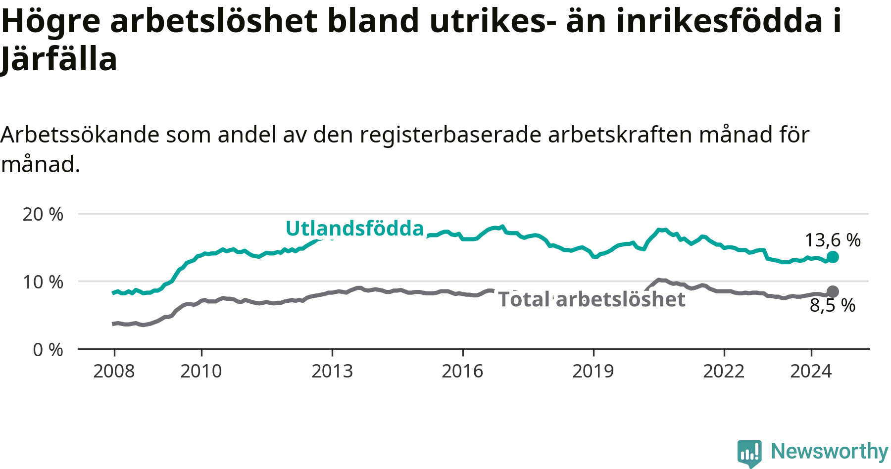 | Bland utlandsfödda | 13,6 % | +0,8 % ▲ | 12,7 % | +0,6 % ▲ | 15,0 % | −0,1 % ▼ |
