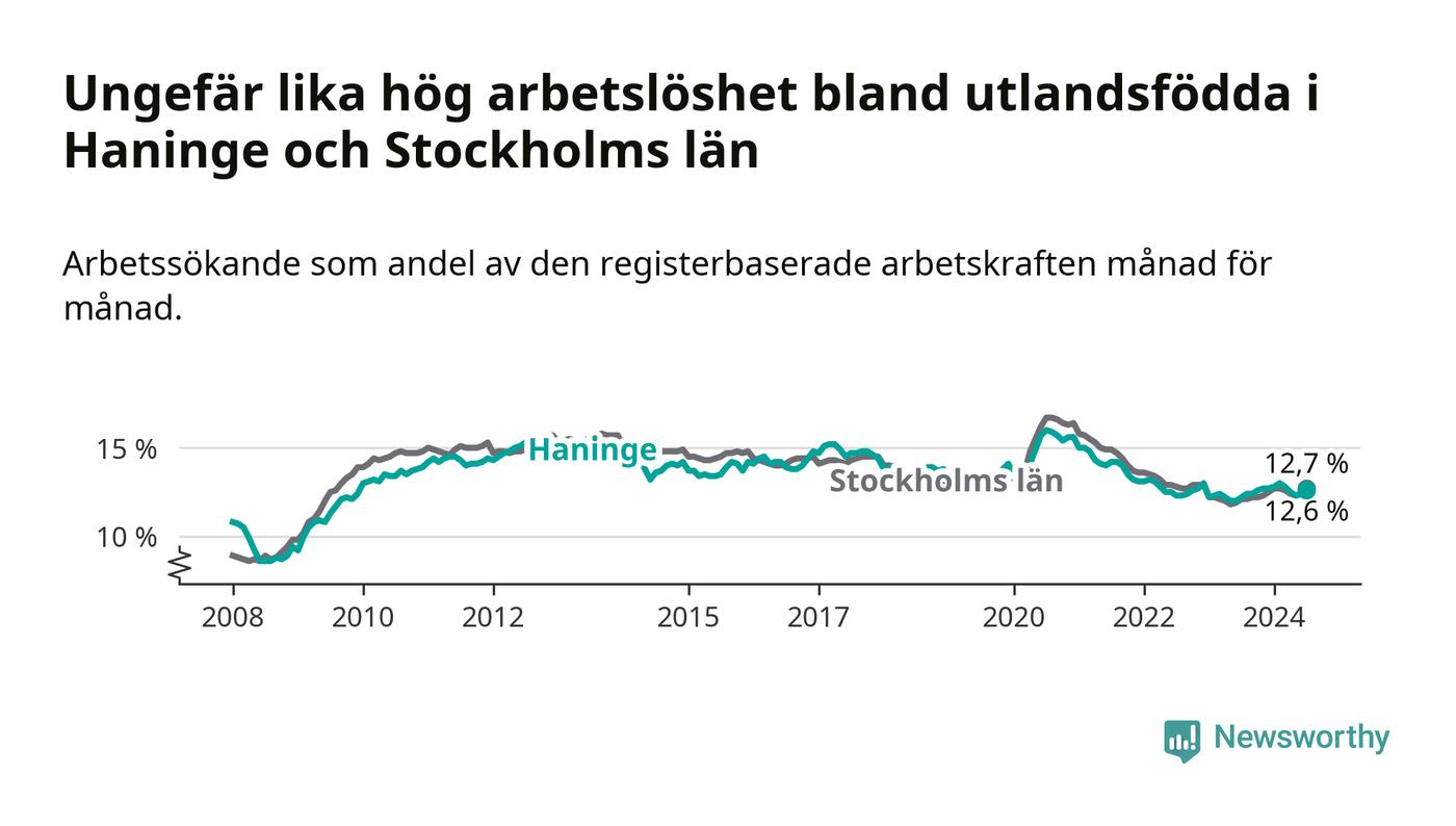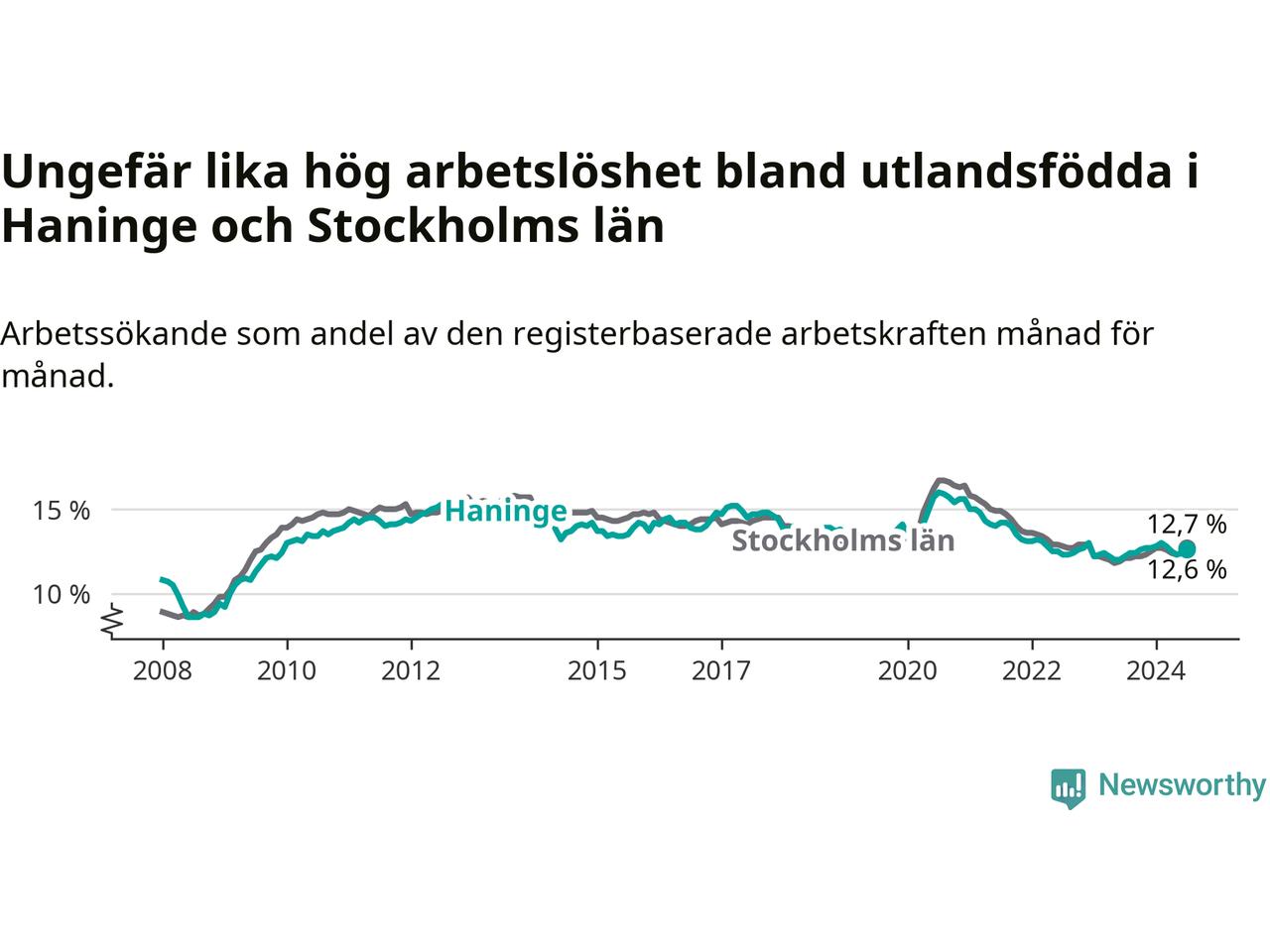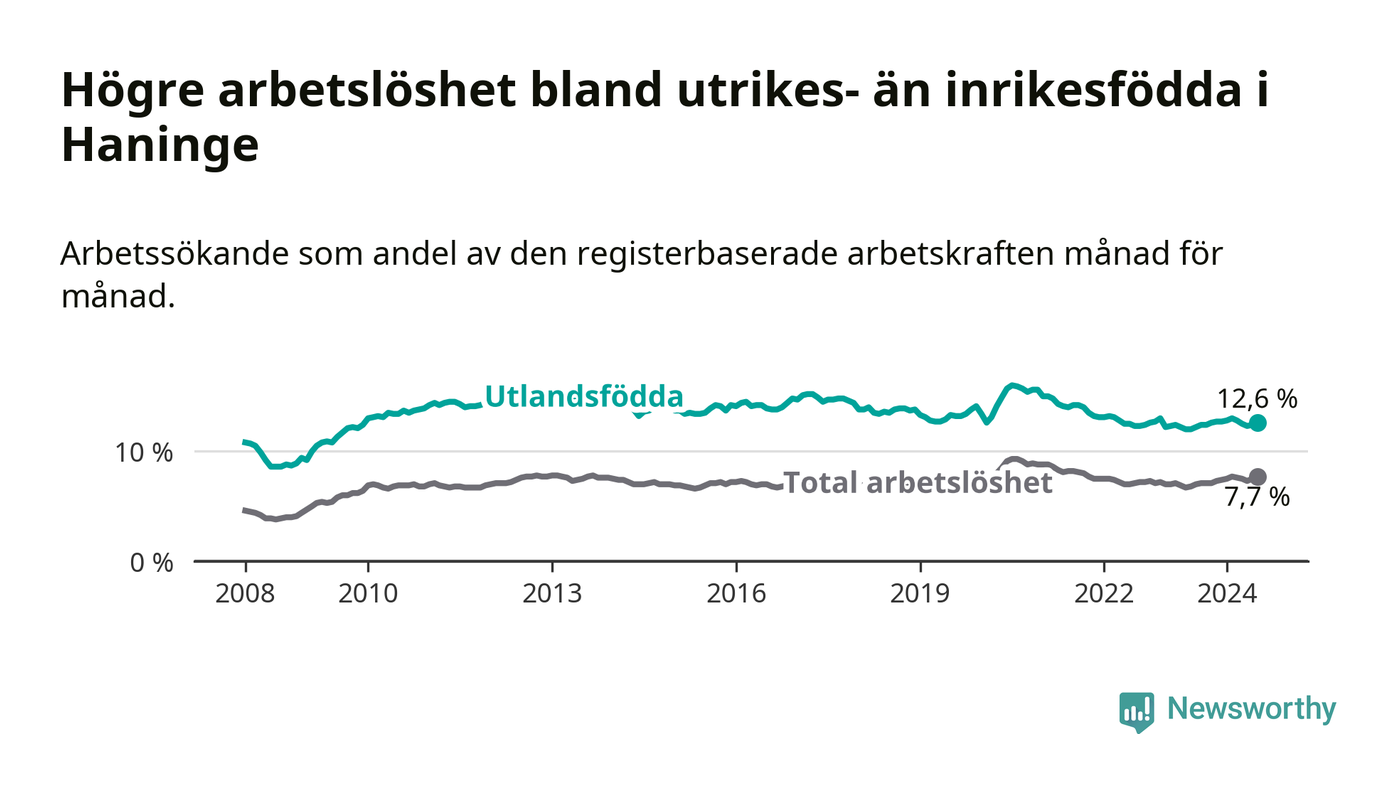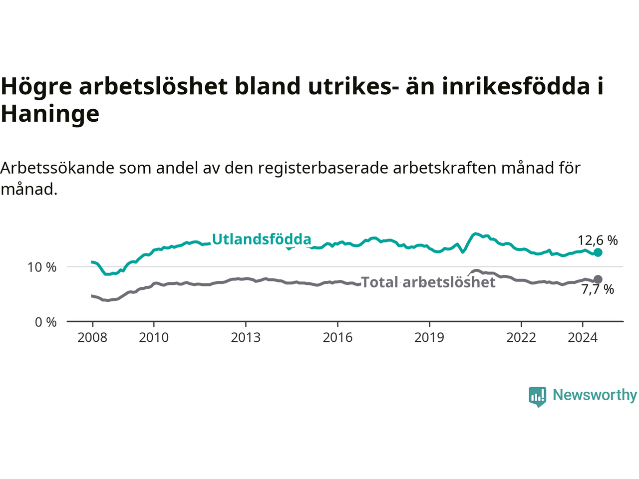 Arbetslösheten bland utlandsfödda var 12,6 procent i Haninge under juli månad, motsvarande 2 373 av 18 833 personer. Det är 0,4 procentenheter fler än vid samma tidpunkt i fjol (−1 219 om man räknar personer). Därmed är de utlandsföddas arbetslöshet högre än vid samma tidpunkt i fjol för sjunde månaden i följd.