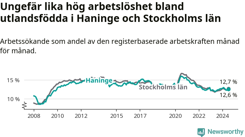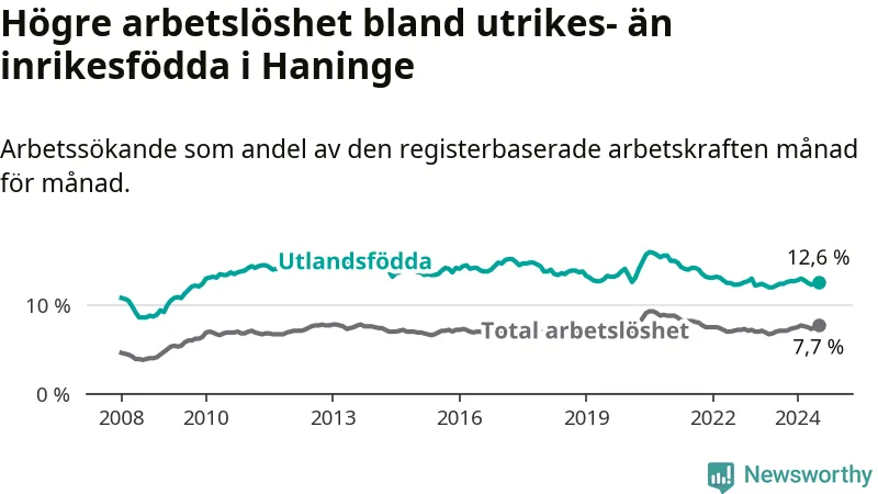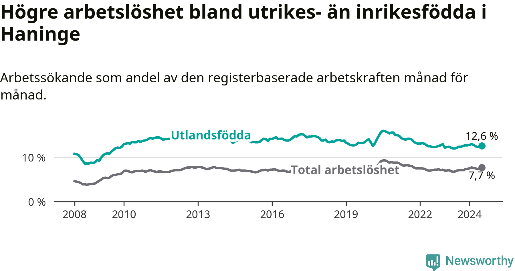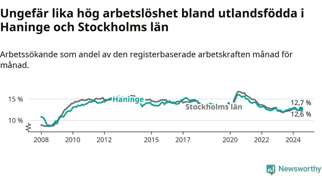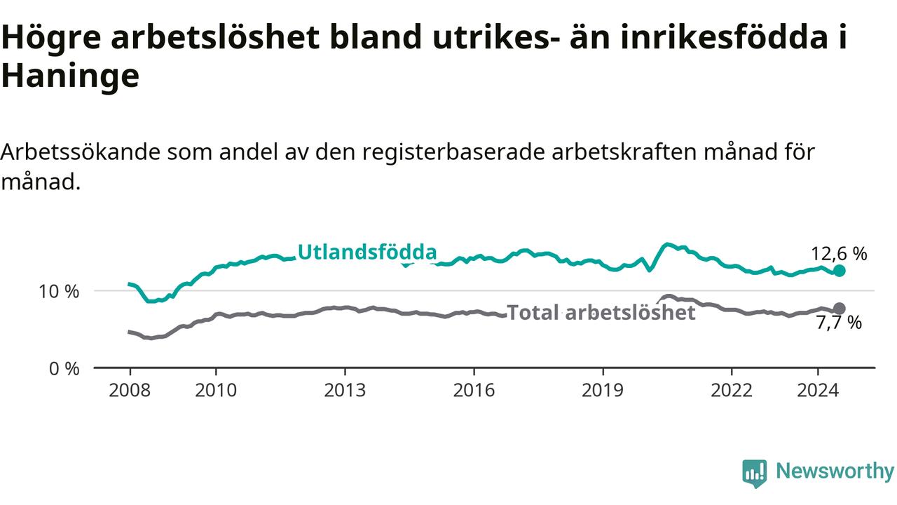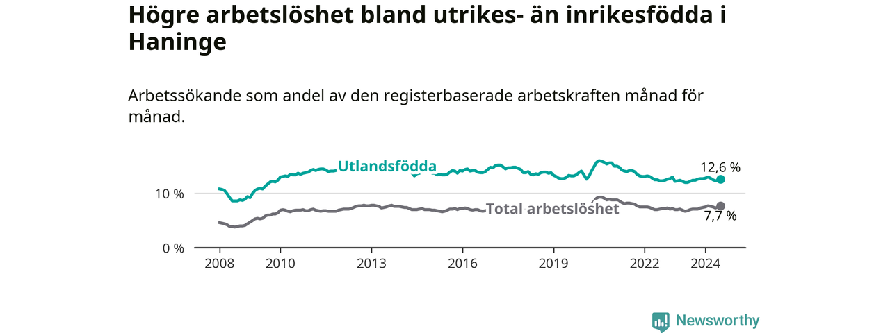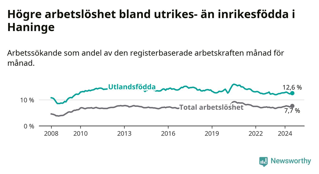 Arbetslösheten bland utlandsfödda var 12,6 procent i Haninge under juli månad, motsvarande 2 373 av 18 833 personer. Det är 0,4 procentenheter fler än vid samma tidpunkt i fjol (−1 219 om man räknar personer). Därmed är de utlandsföddas arbetslöshet högre än vid samma tidpunkt i fjol för sjunde månaden i följd.