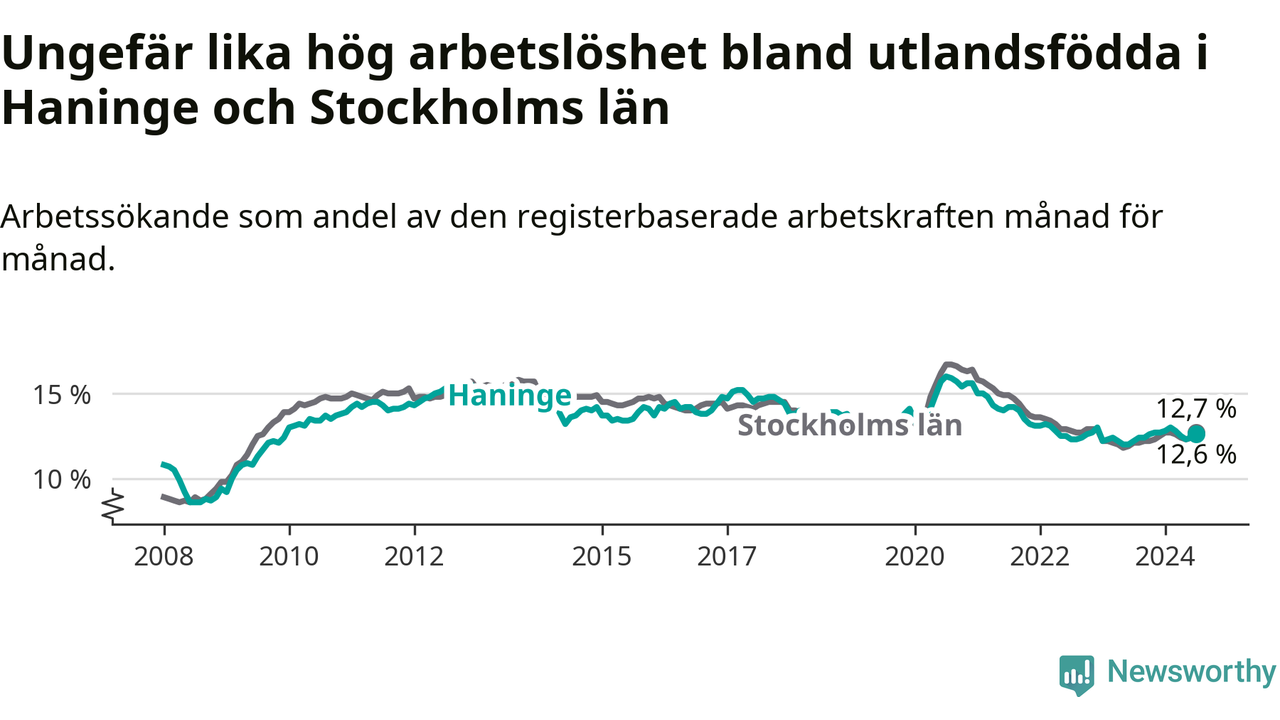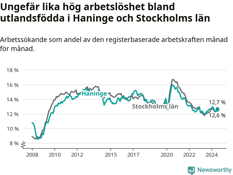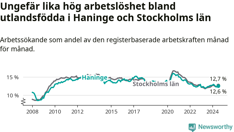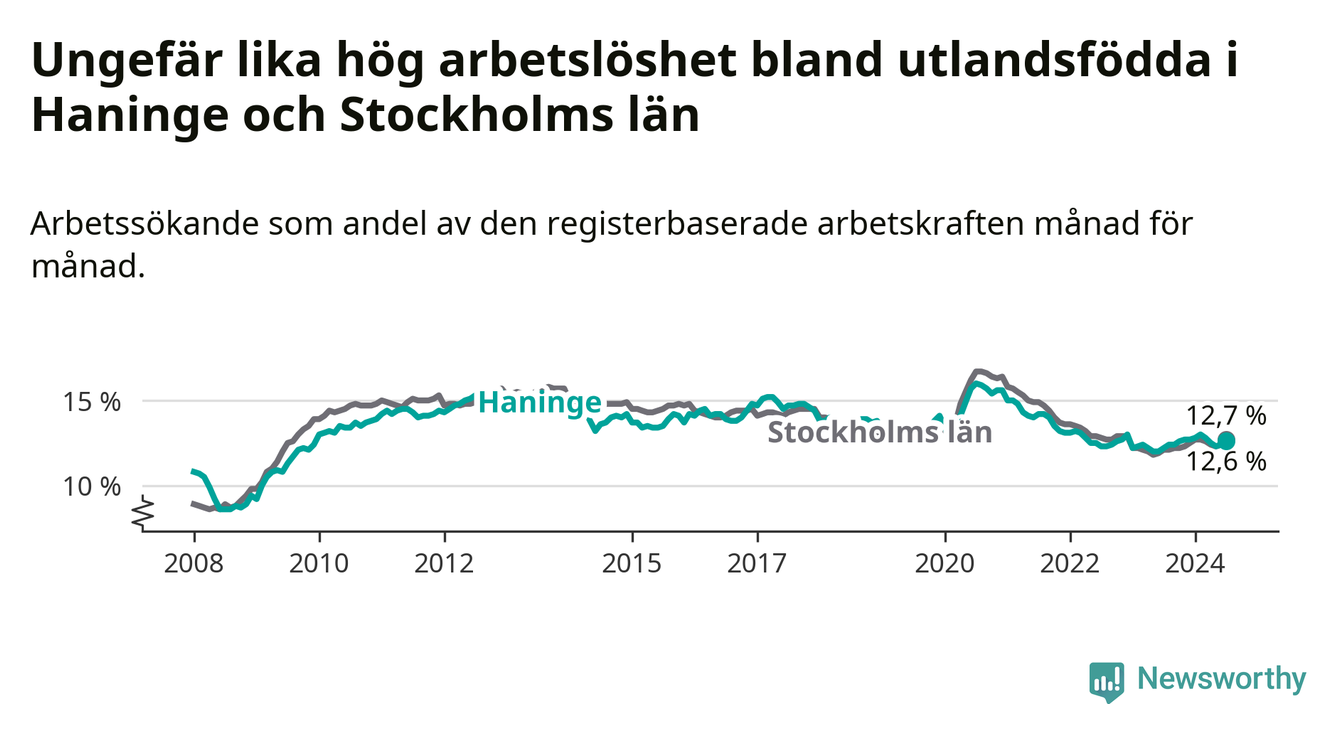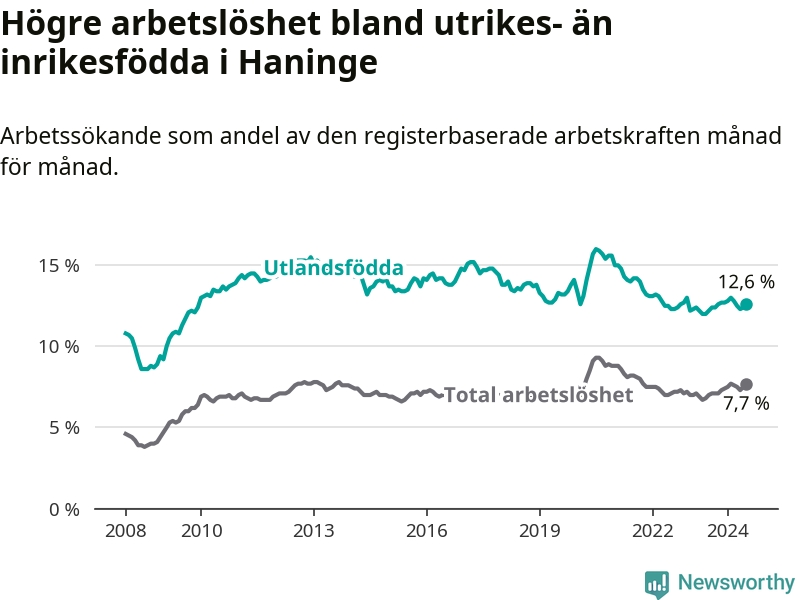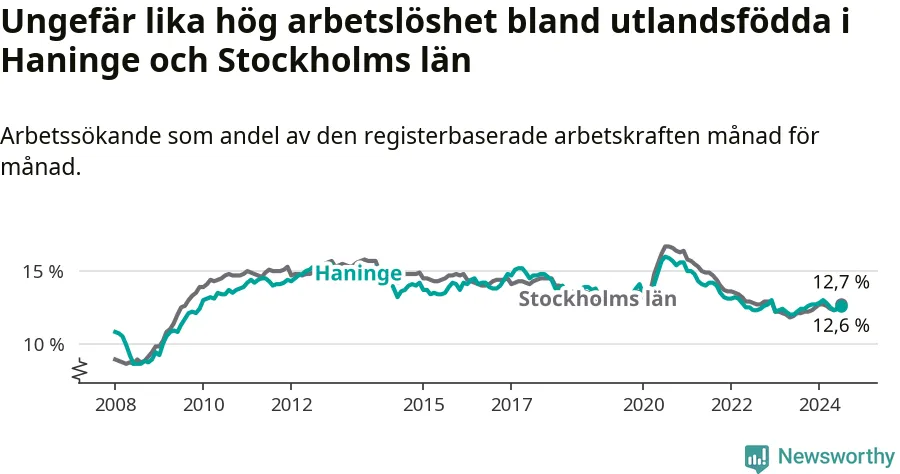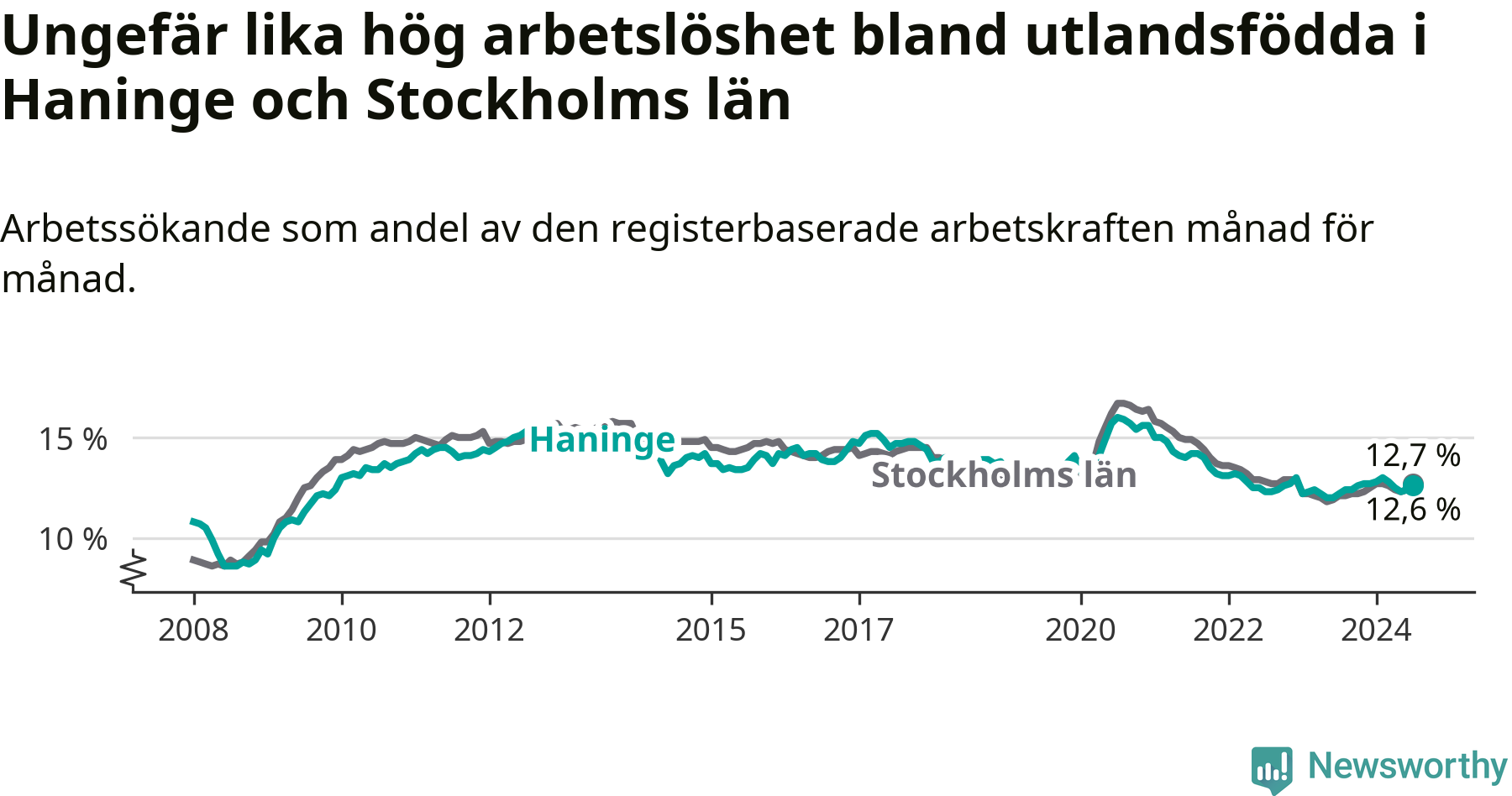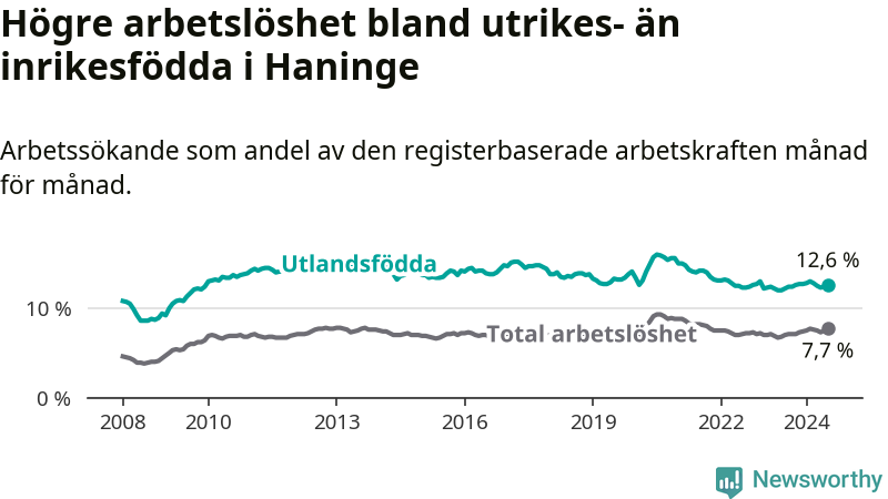 | Bland utlandsfödda | 12,6 % | +0,4 % ▲ | 12,7 % | +0,6 % ▲ | 15,0 % | −0,1 % ▼ |