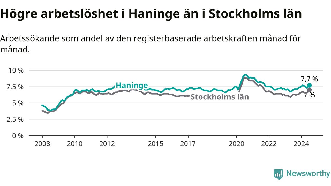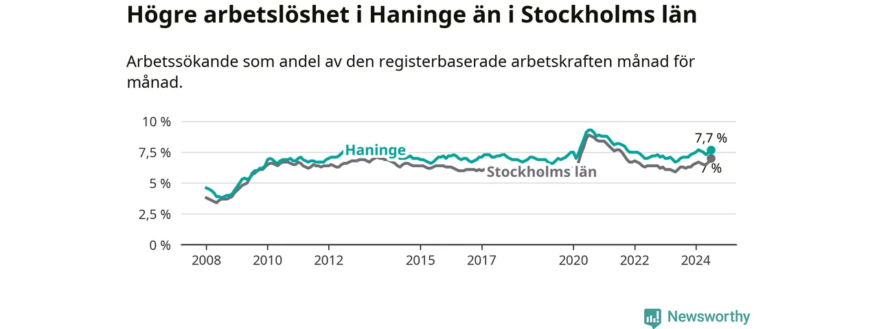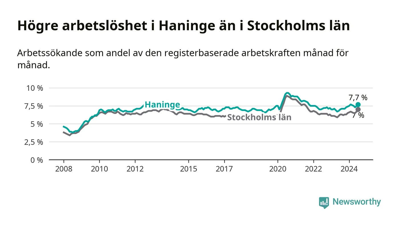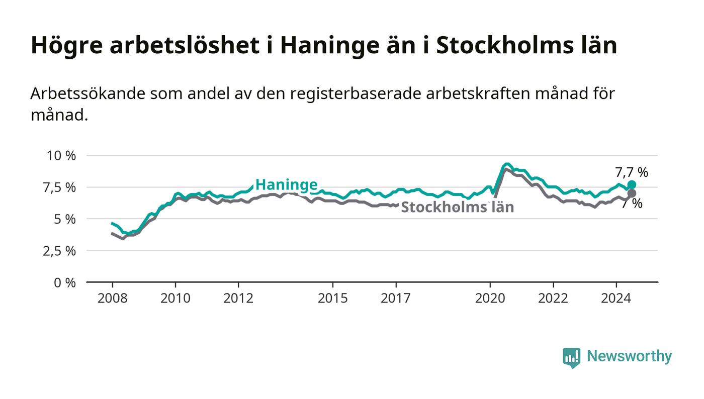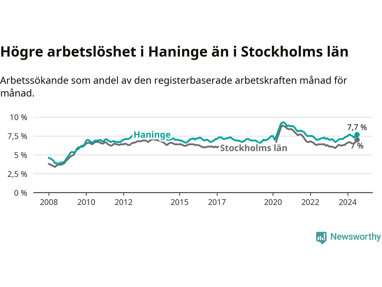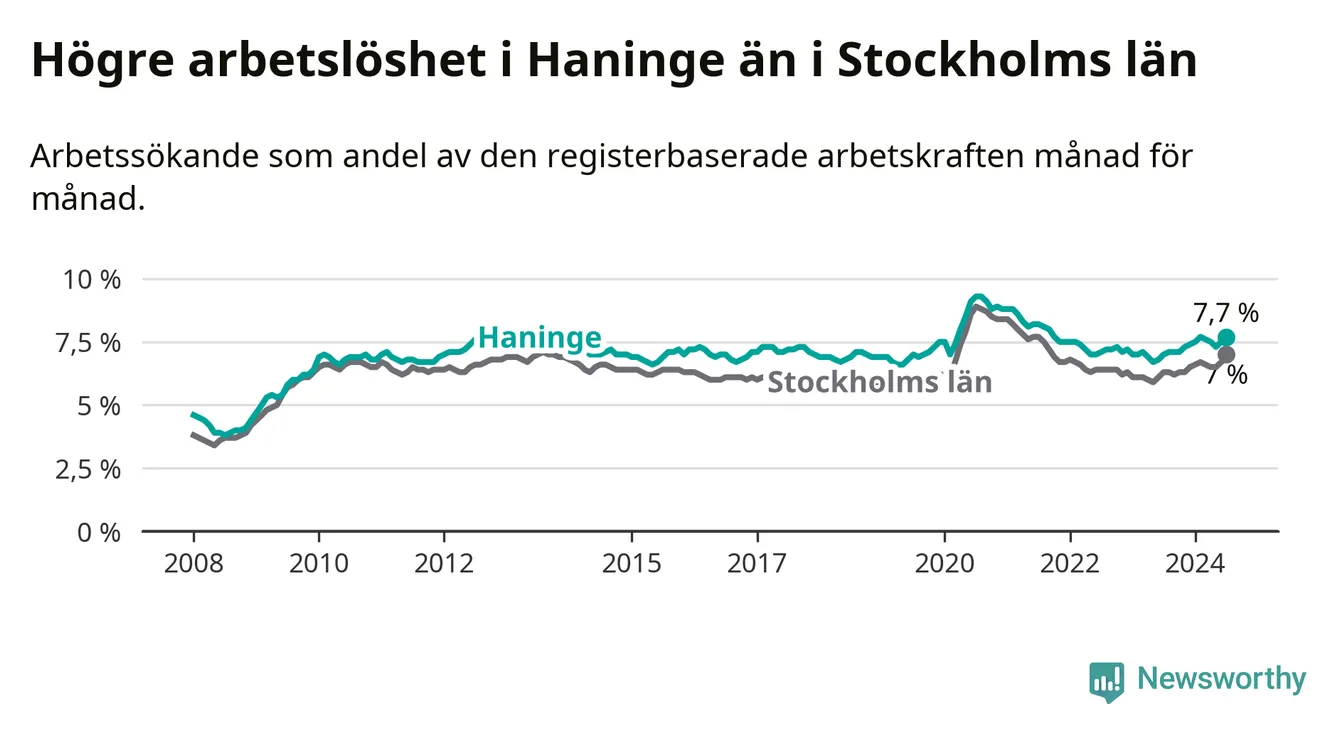 Anmärkningsvärt är att arbetslösheten nu, för första gången sedan november 2022, är lägre i Haninge än snittet i Stockholms län, även om skillnaden bara är 0,1 procentenheter.