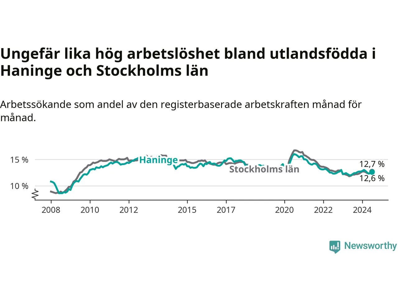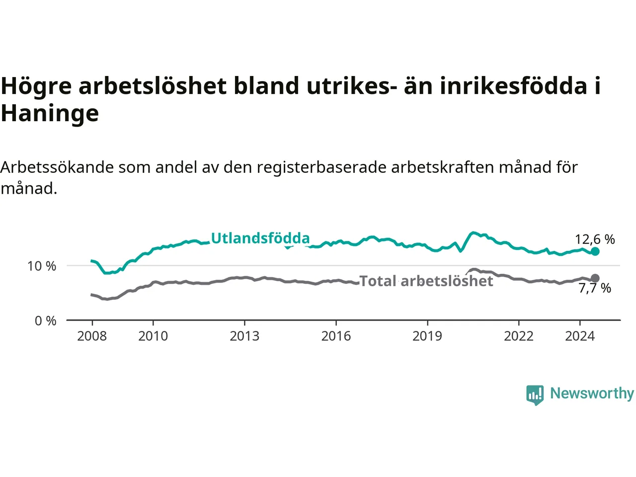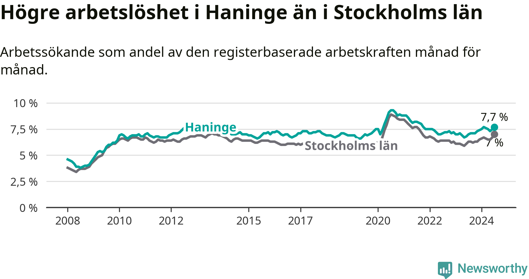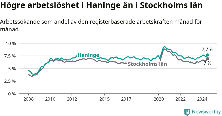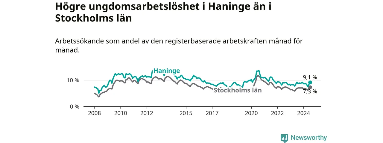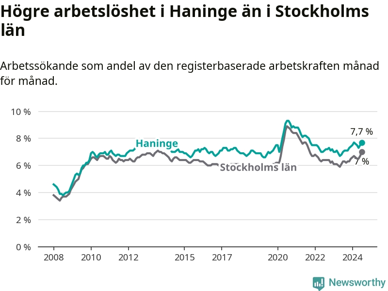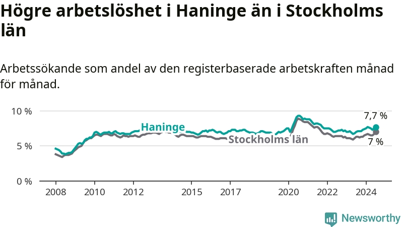 Anmärkningsvärt är att arbetslösheten nu, för första gången sedan november 2022, är lägre i Haninge än snittet i Stockholms län, även om skillnaden bara är 0,1 procentenheter.