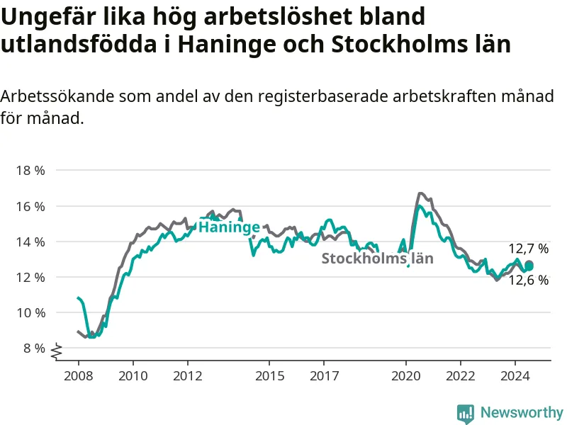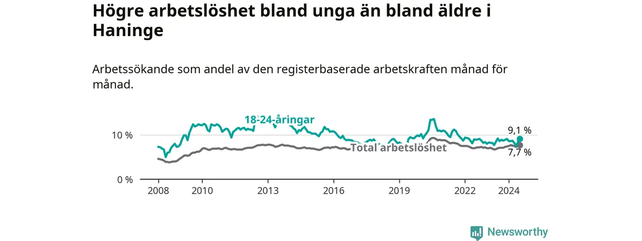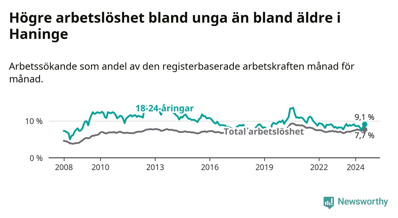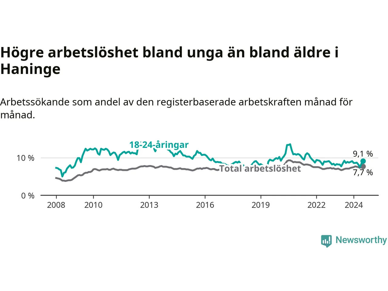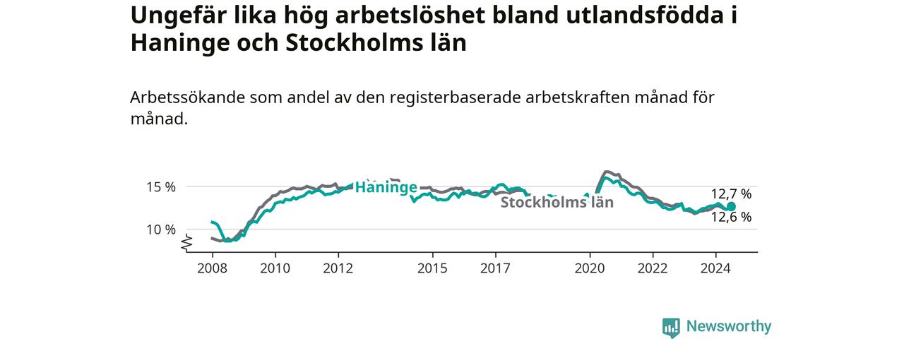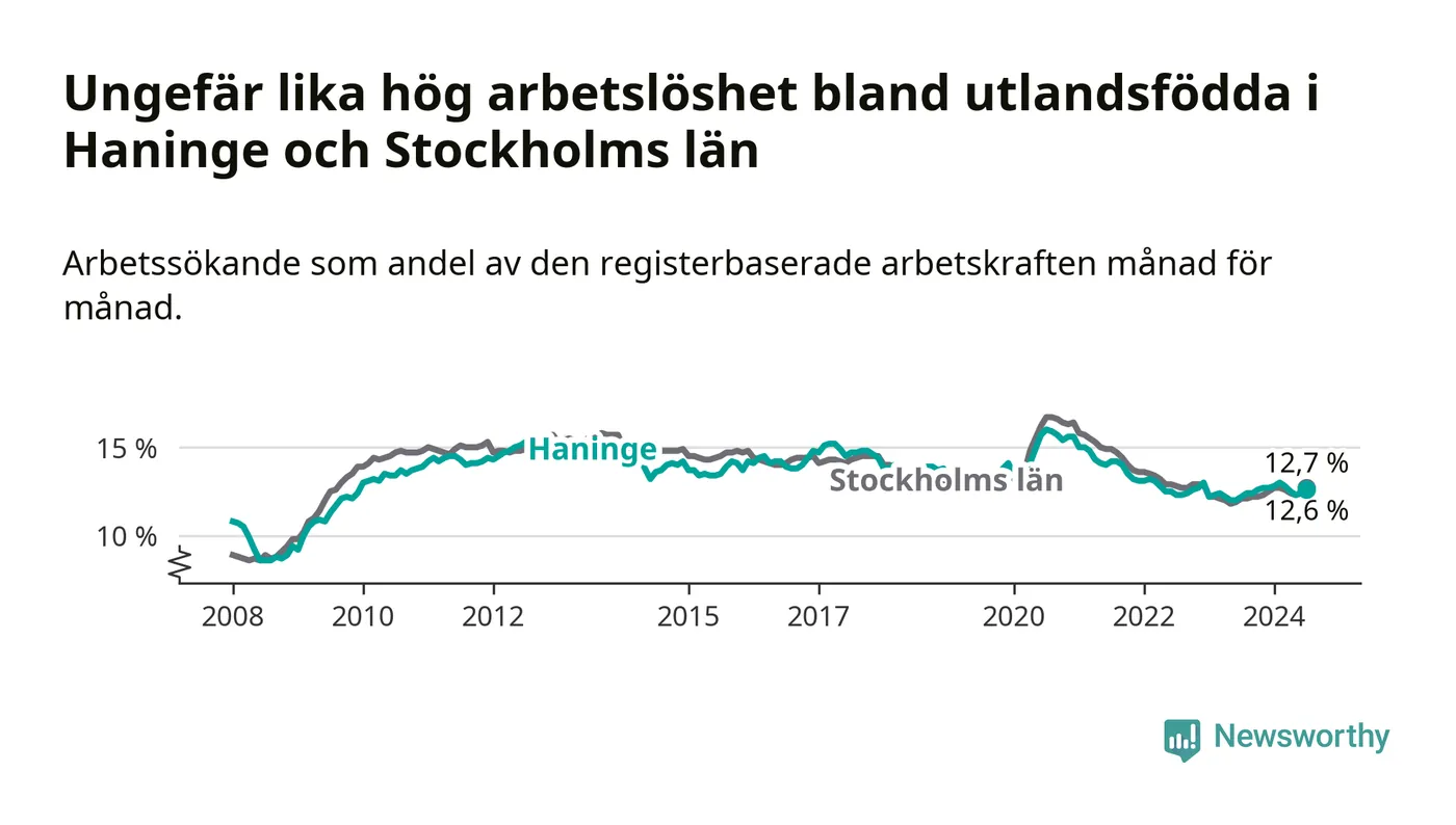 Anmärkningsvärt är att arbetslösheten nu, för första gången sedan november 2022, är lägre i Haninge än snittet i Stockholms län, även om skillnaden bara är 0,1 procentenheter.