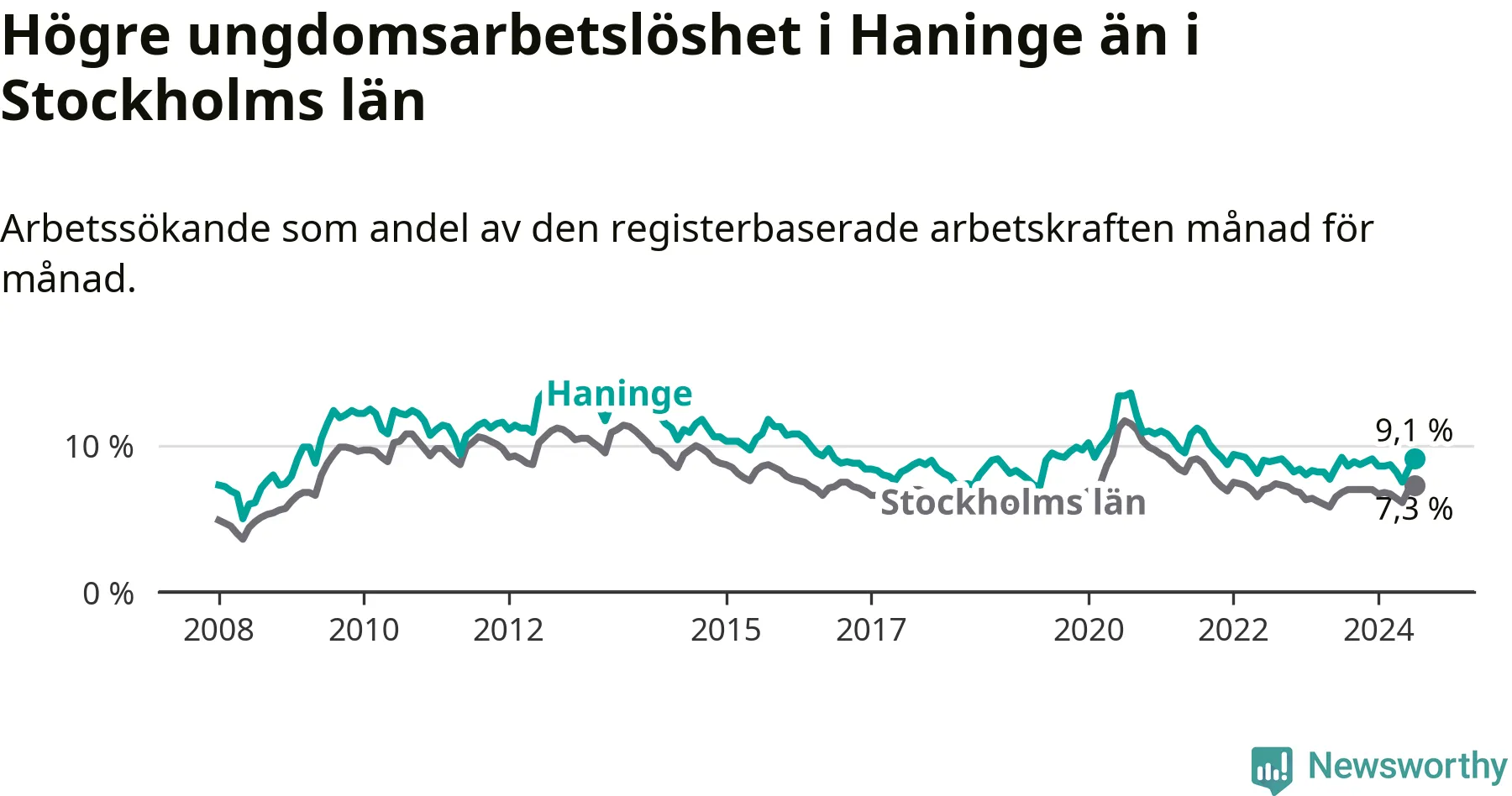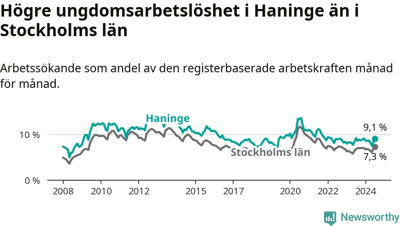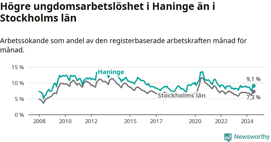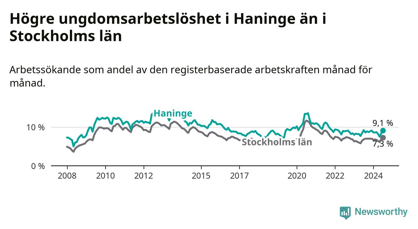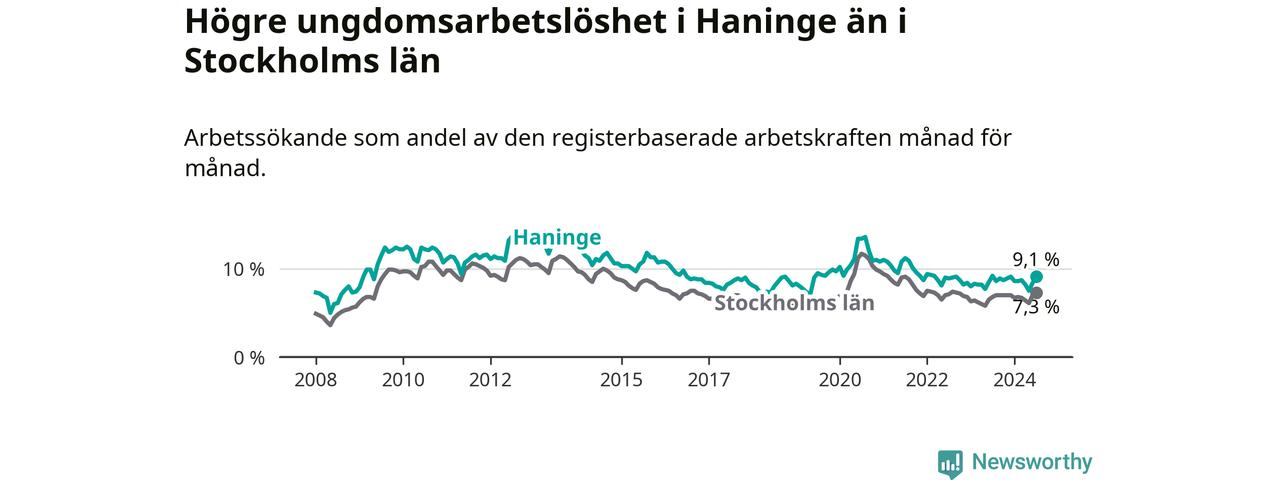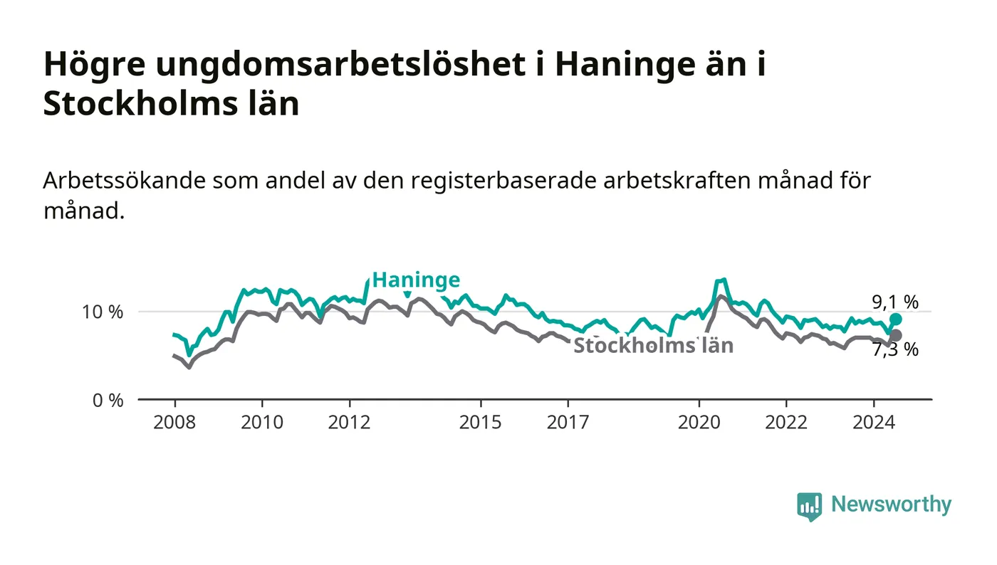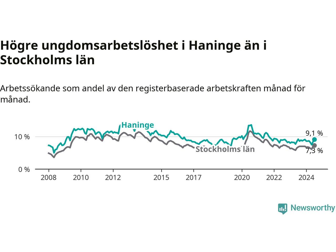 Precis som den totala arbetslösheten ligger ungdomsarbetslösheten i Haninge högre än i Stockholms län som helhet. Skillnaden mellan kommunen och länet är 1,8 procentenheter.