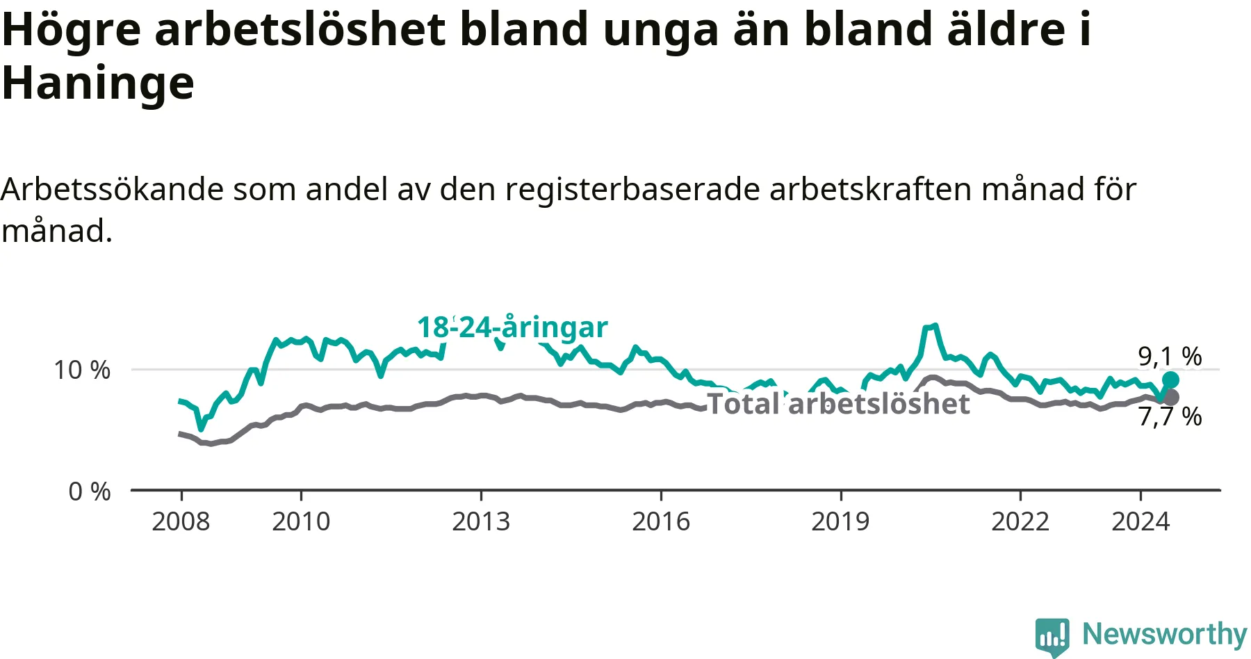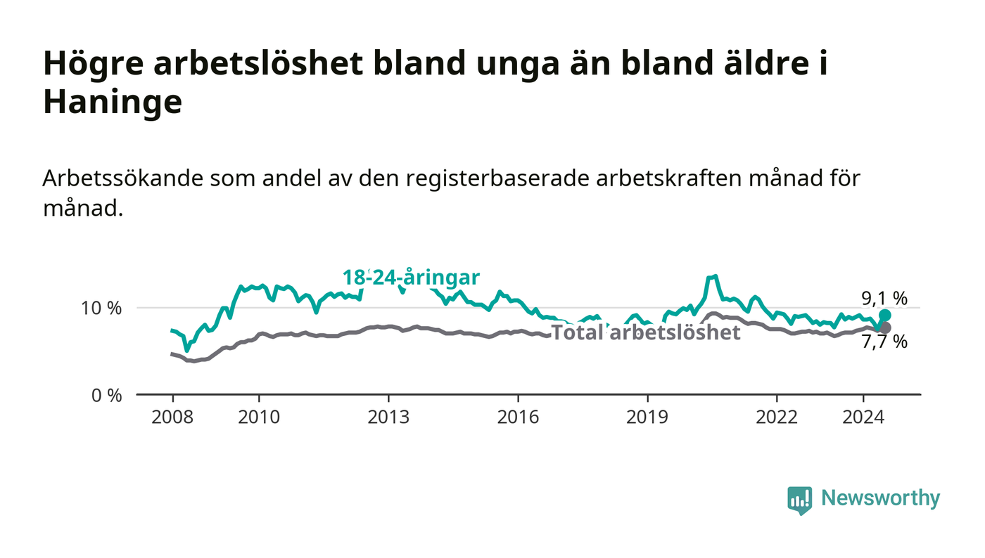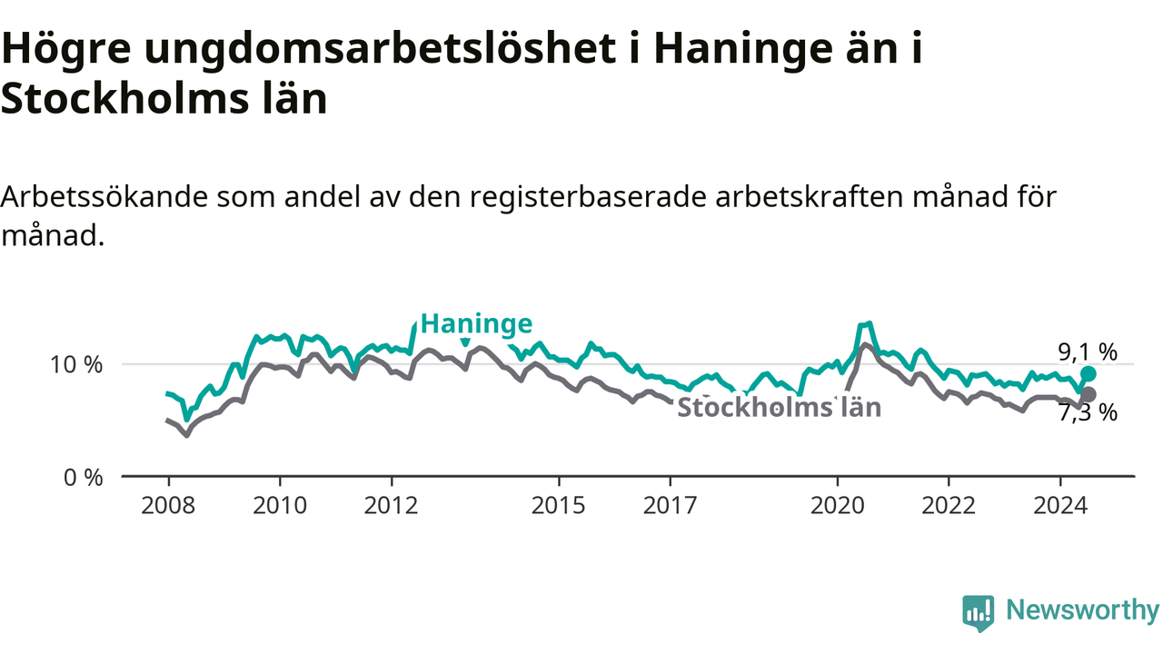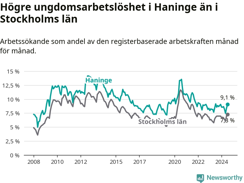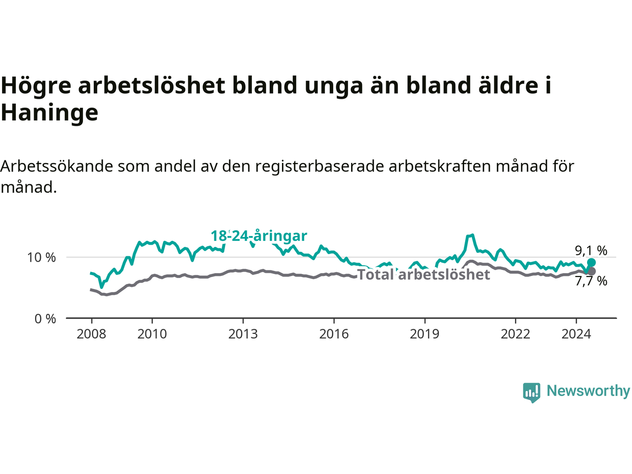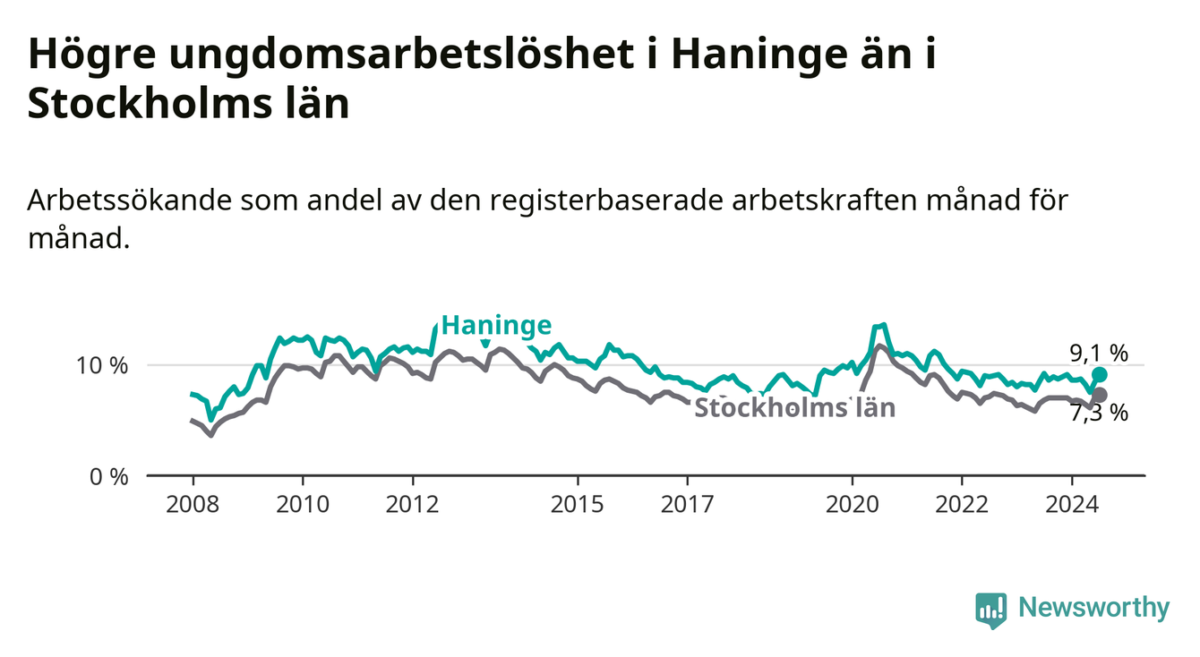 Precis som den totala arbetslösheten ligger ungdomsarbetslösheten i Haninge högre än i Stockholms län som helhet. Skillnaden mellan kommunen och länet är 1,8 procentenheter.