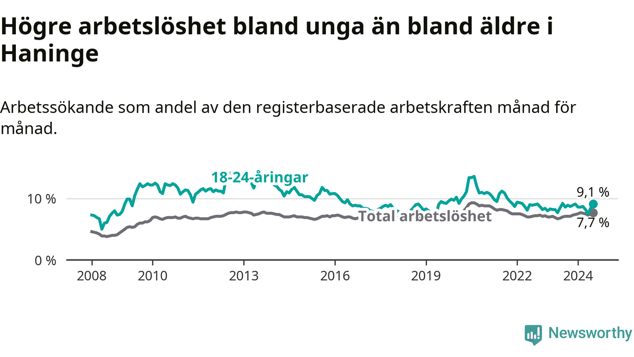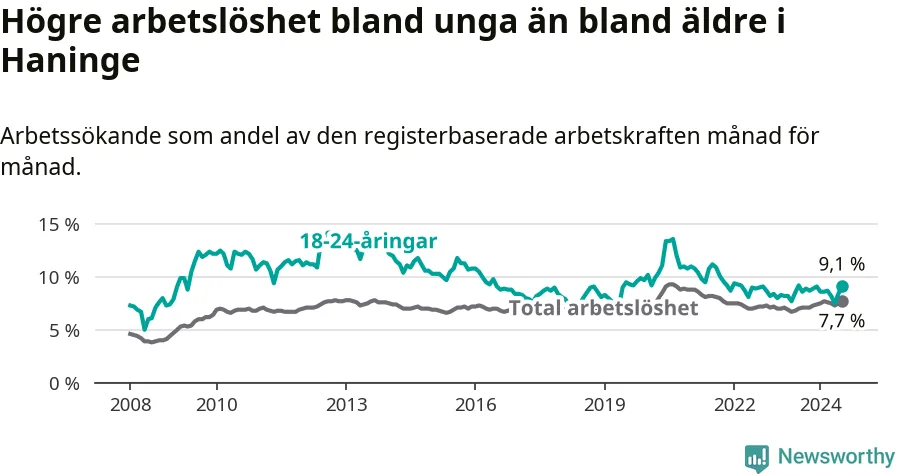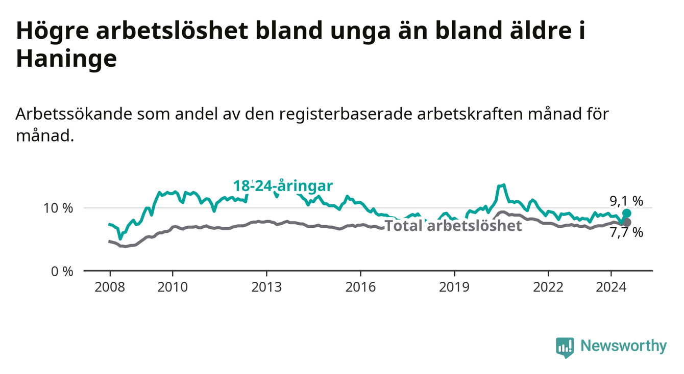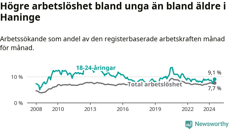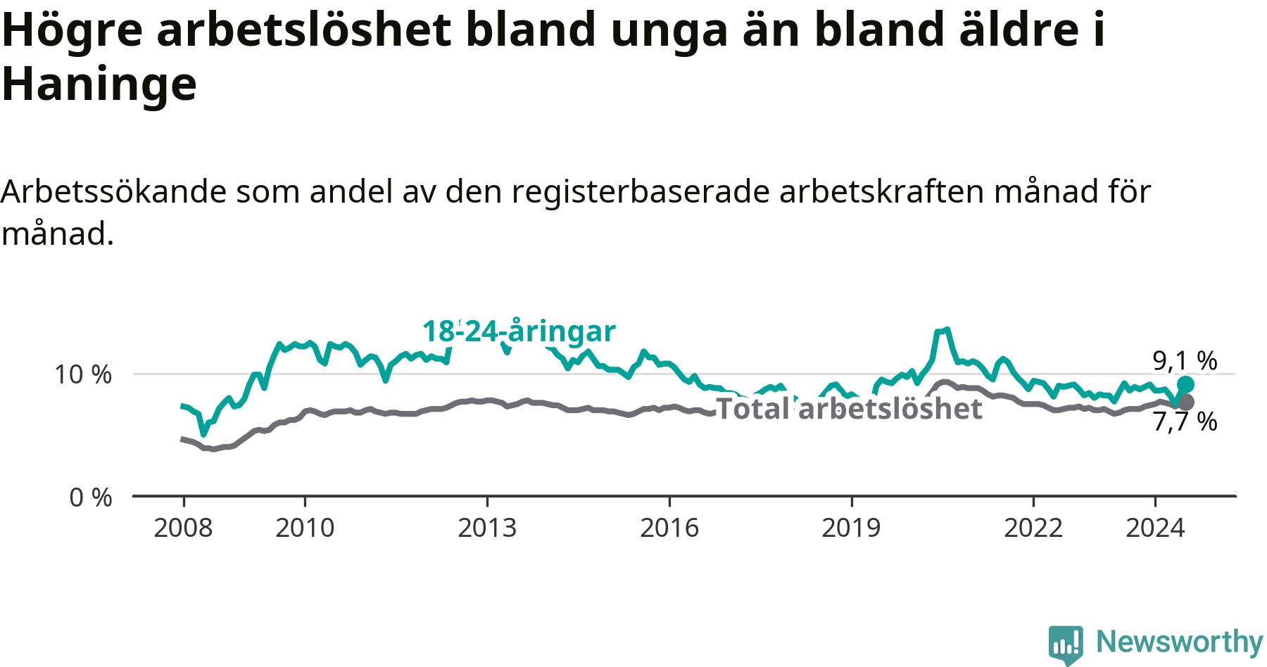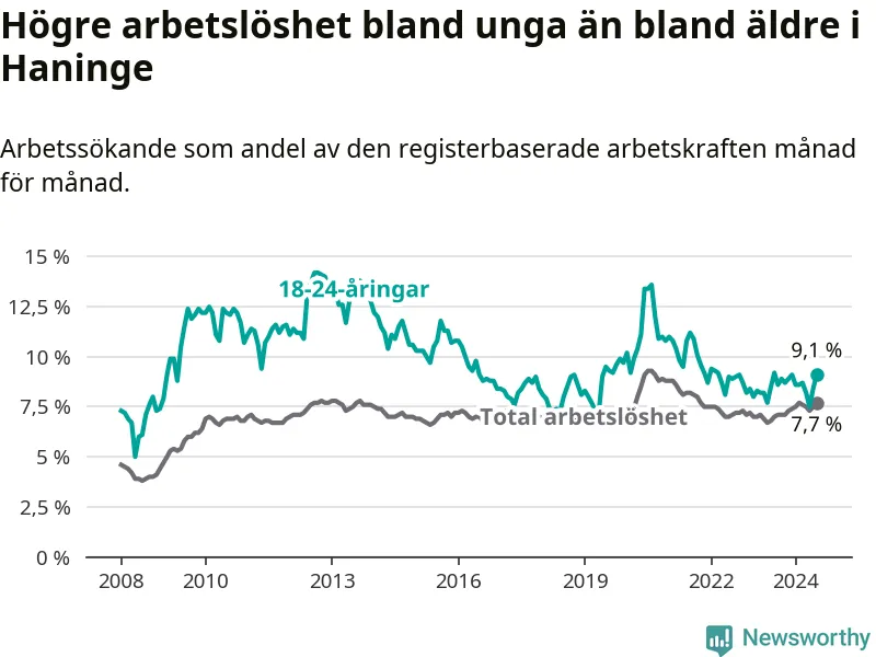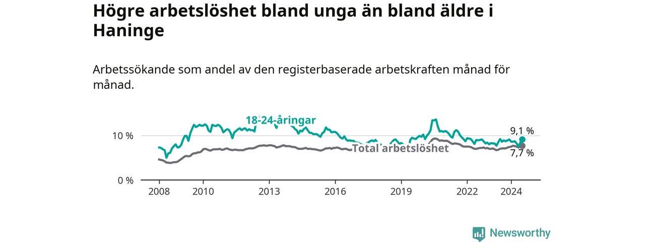 Precis som den totala arbetslösheten ligger ungdomsarbetslösheten i Haninge högre än i Stockholms län som helhet. Skillnaden mellan kommunen och länet är 1,8 procentenheter.