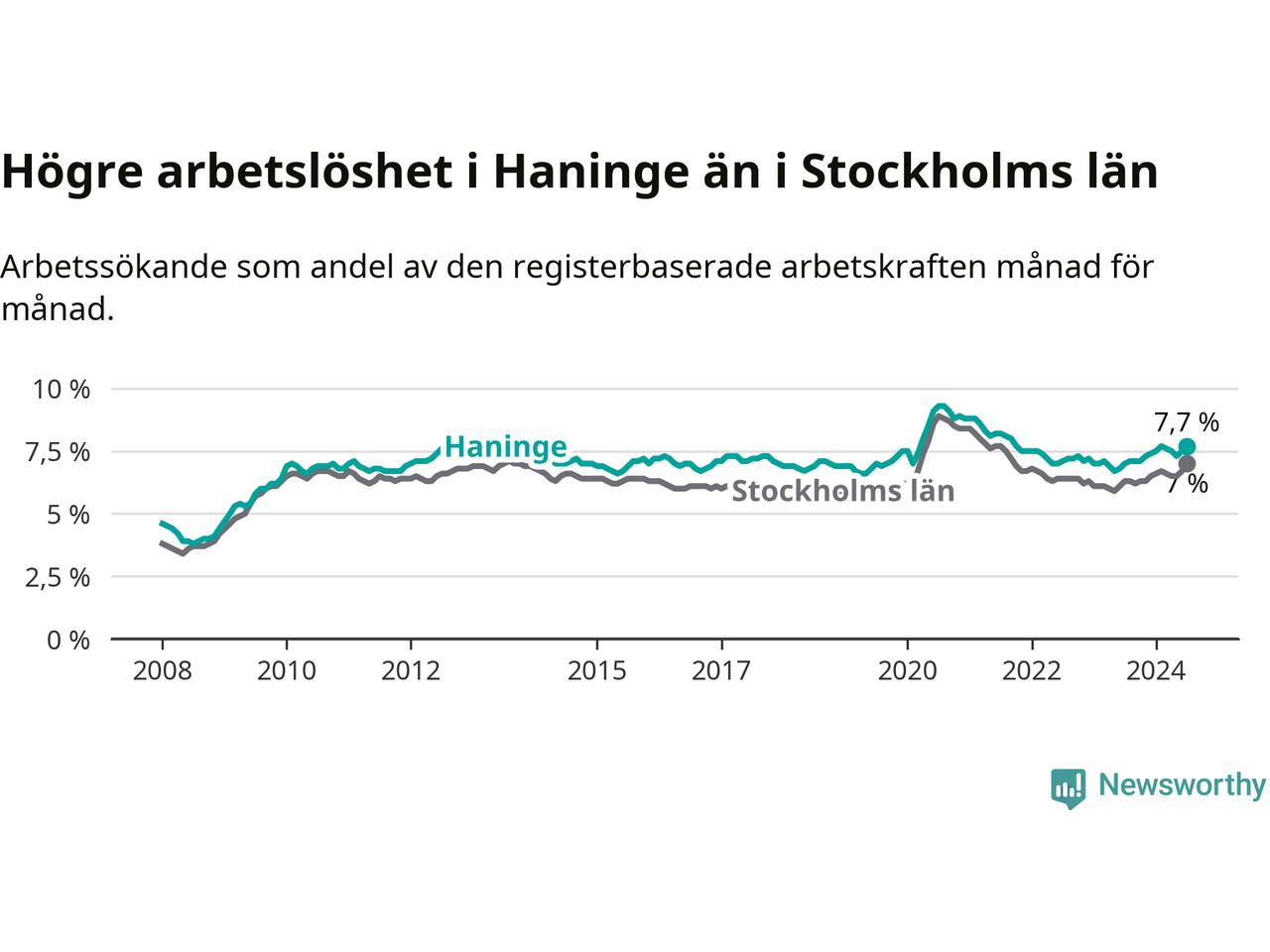 Haninge hade redan tidigare högre arbetslöshet än snittet i hela Stockholms län och nu växer klyftan (7,7 procent i kommunen, jämfört med 7,0 procent i hela länet). Ekerö har den lägsta arbetslösheten i länet (3,5 procent), medan Södertälje har den högsta (11,0 procent). För att Haninge skulle komma ner i samma arbetslöshetsnivå som Ekerö skulle 2 194 personer behöva sysselsättas.