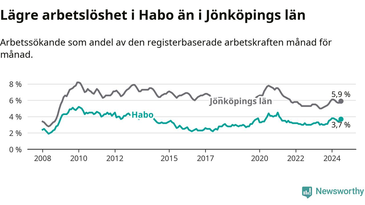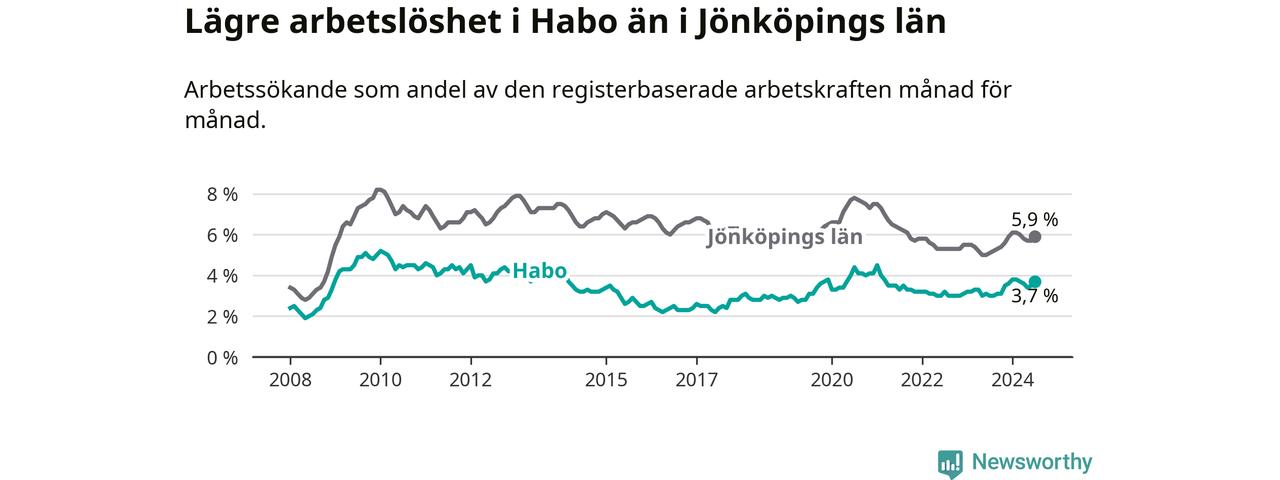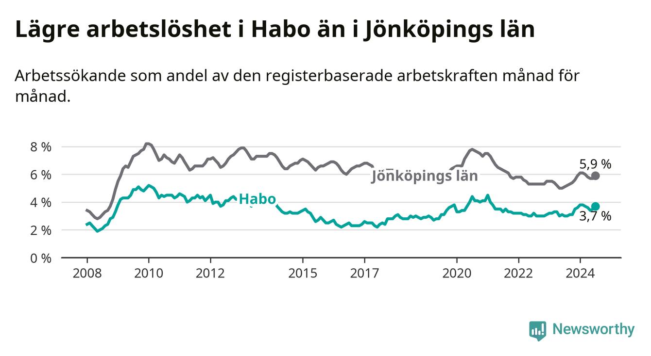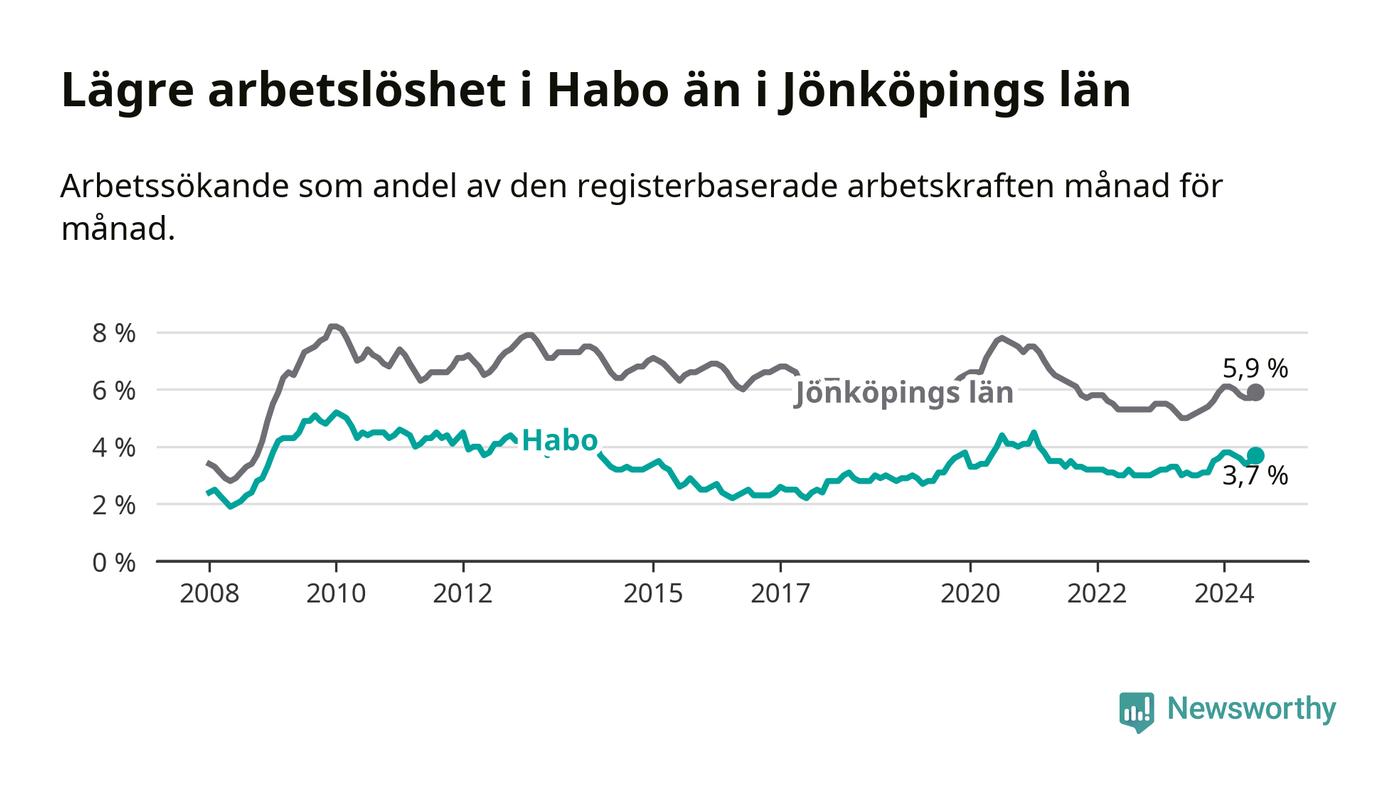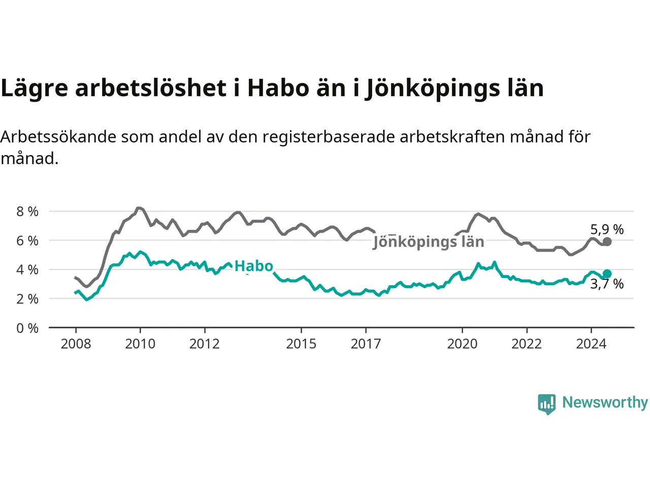 Även om arbetslösheten i Habo alltså ökar, så ligger den fortfarande under snittet i hela Jönköpings län (3,7 procent i kommunen, jämfört med 5,9 procent i hela länet). Habo har därmed även den lägsta arbetslöshetsnivån i länet. Sävsjö har den högsta (8,5 procent).