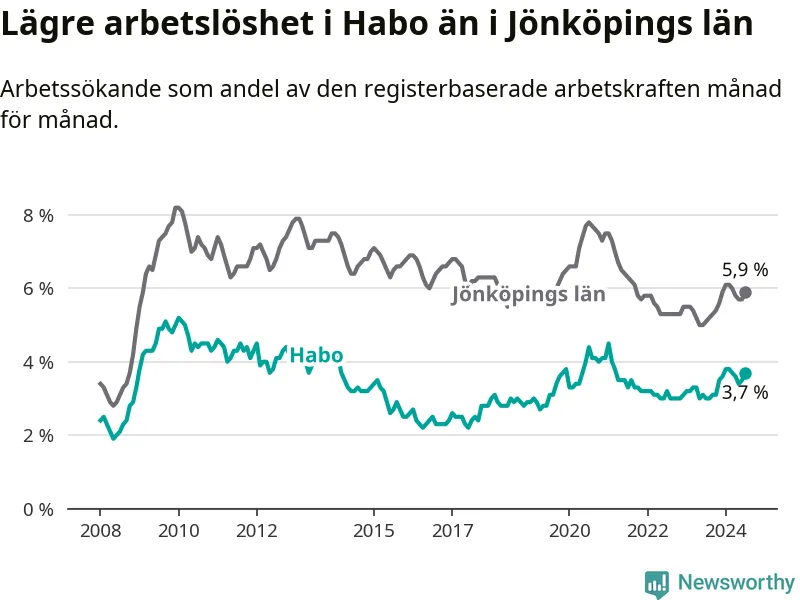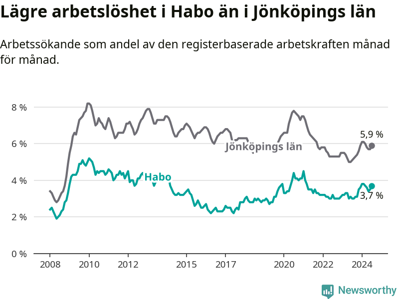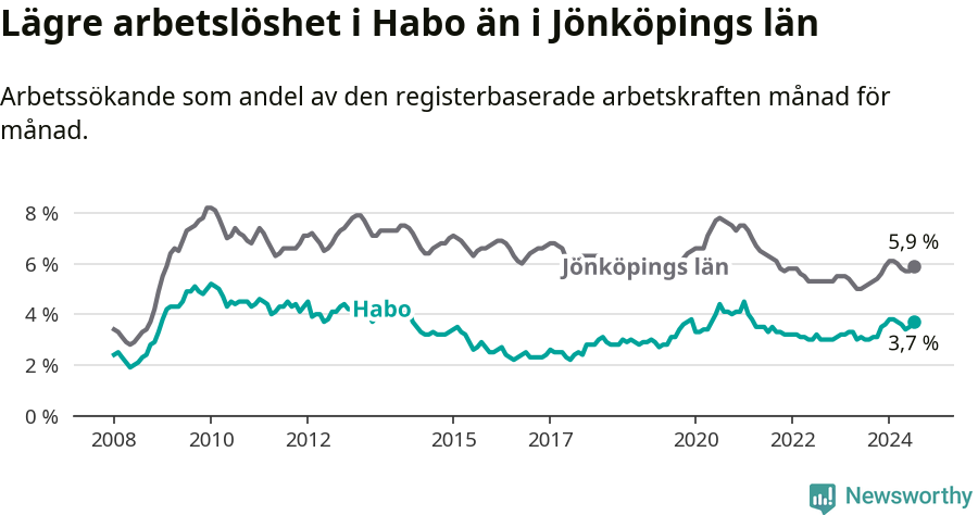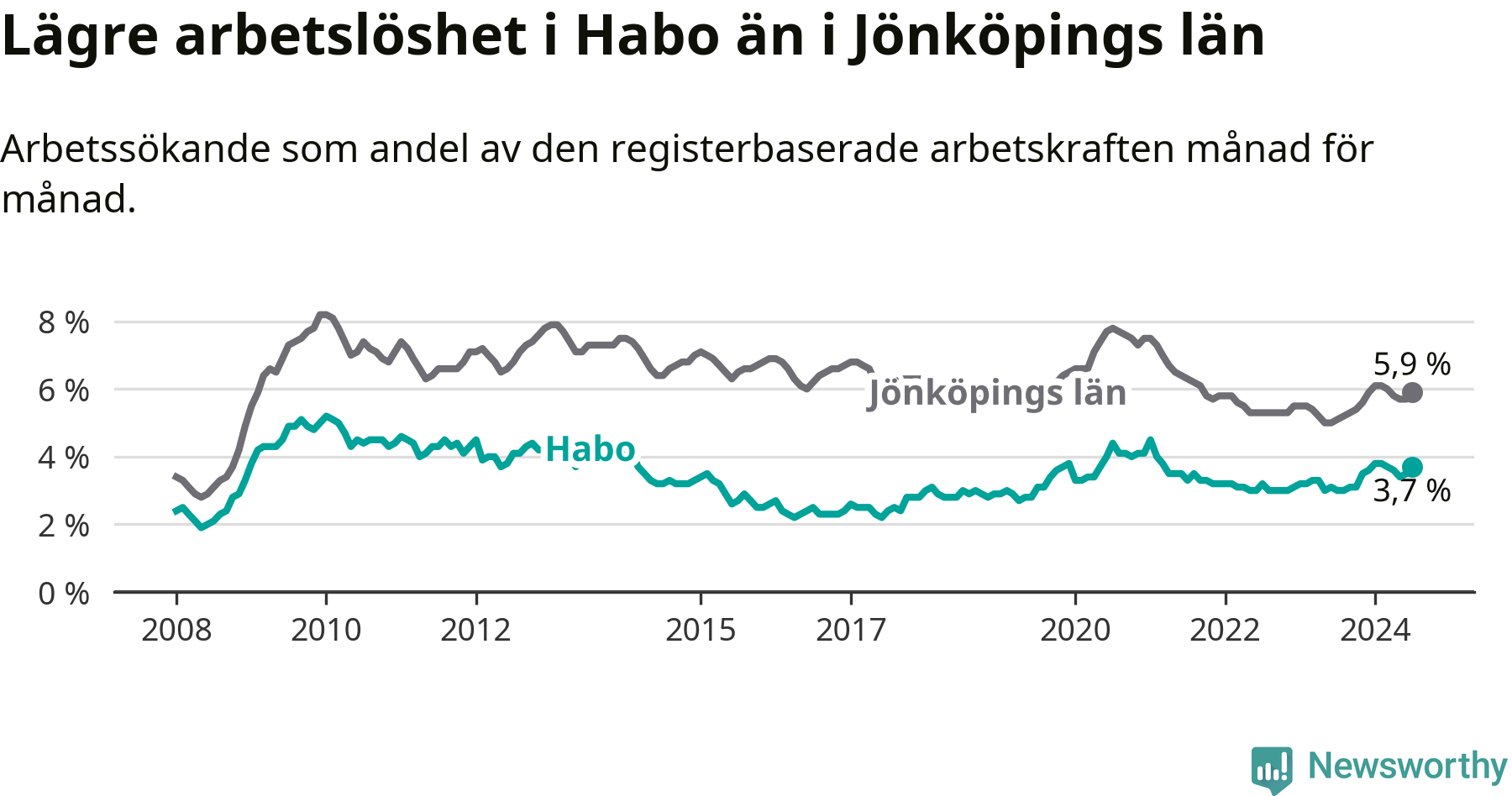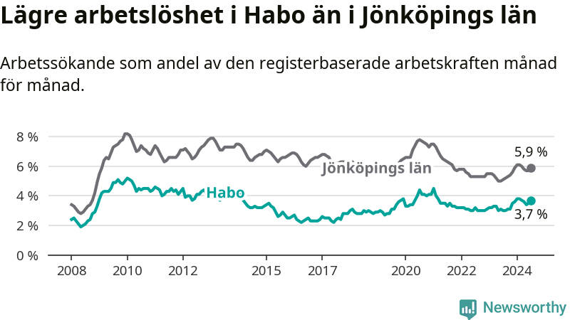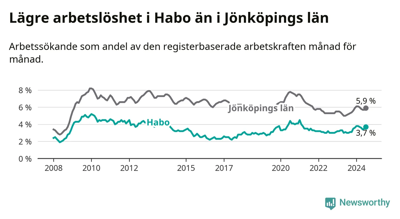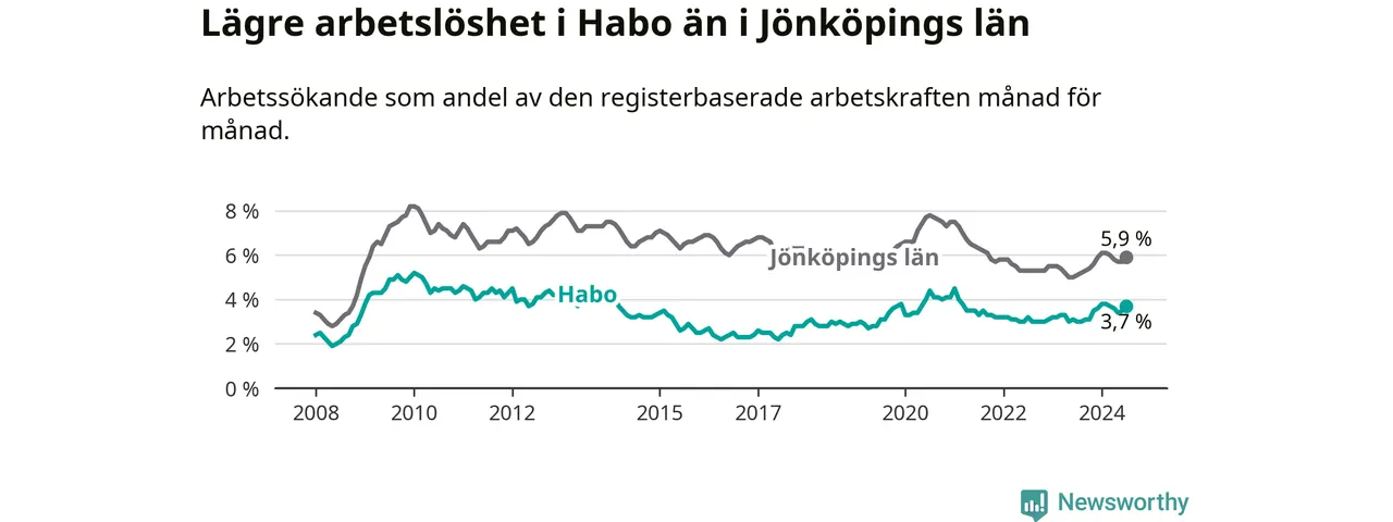 Även om arbetslösheten i Habo alltså ökar, så ligger den fortfarande under snittet i hela Jönköpings län (3,7 procent i kommunen, jämfört med 5,9 procent i hela länet). Habo har därmed även den lägsta arbetslöshetsnivån i länet. Sävsjö har den högsta (8,5 procent).