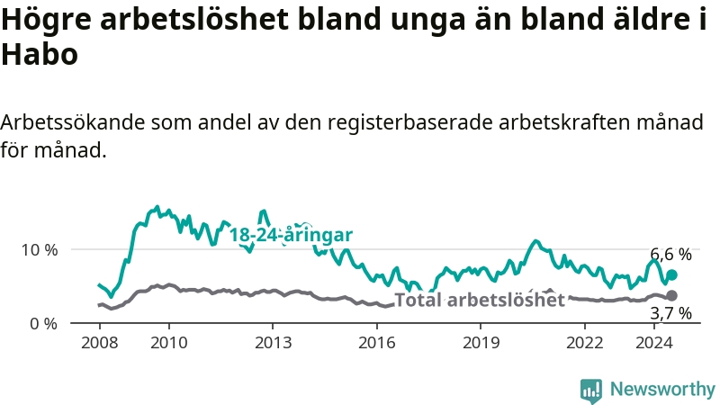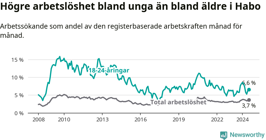 Precis som den totala arbetslösheten stiger arbetslösheten bland unga (+1,2 procentenheter). I juli var 6,6 procent av 18–24-åringarna inskrivna som arbetssökande (motsvarande 39 personer). Mäter vi antalet inskrivna ser vi en ökning med tolv personer på ett års sikt.