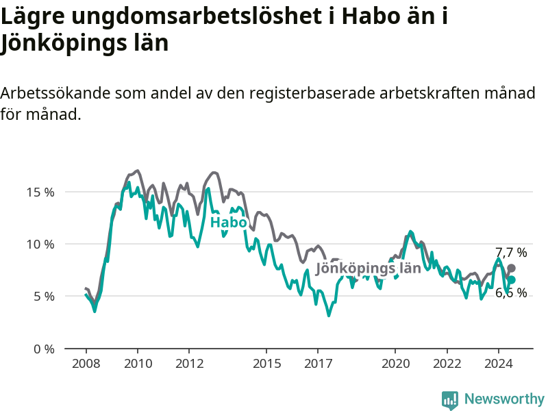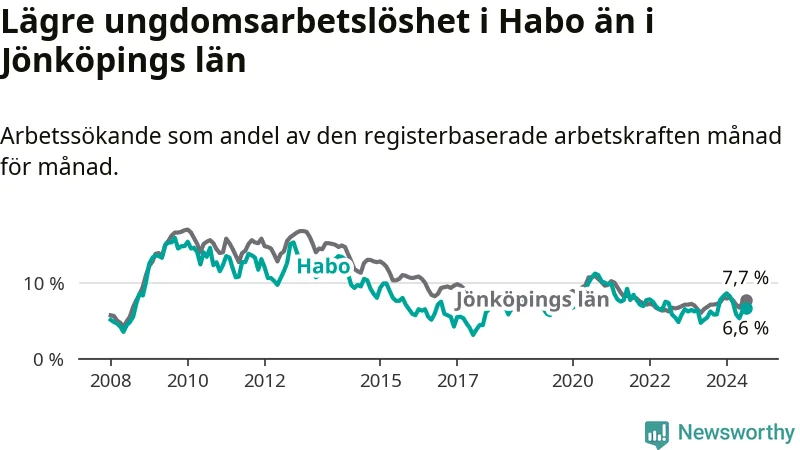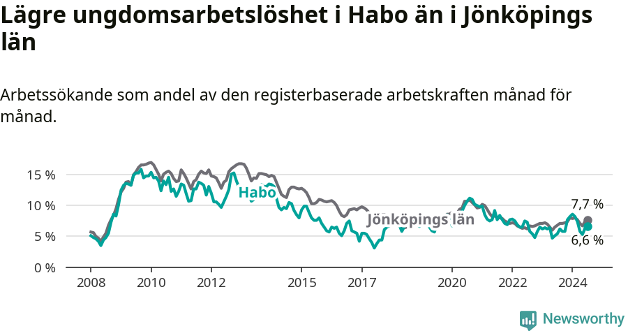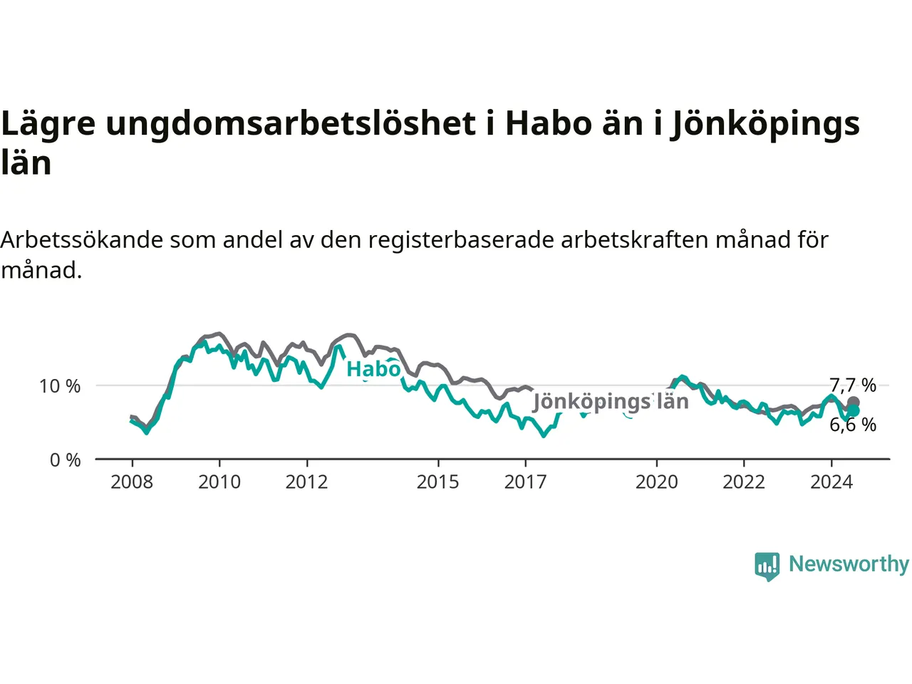 Precis som den totala arbetslösheten ligger ungdomsarbetslösheten i Habo lägre än i Jönköpings län som helhet. Skillnaden mellan kommunen och länet är 1,1 procentenheter.